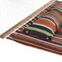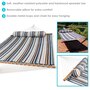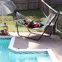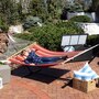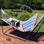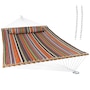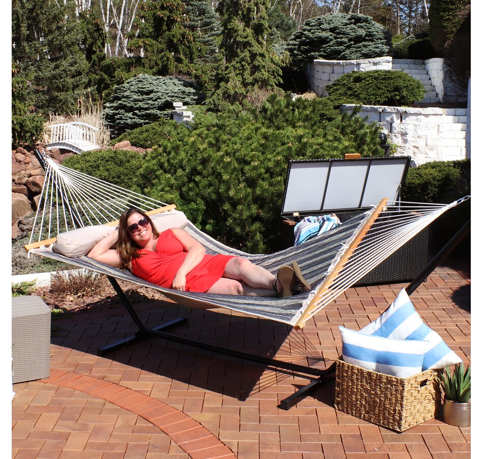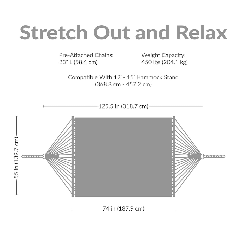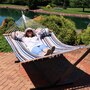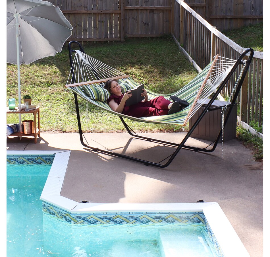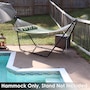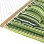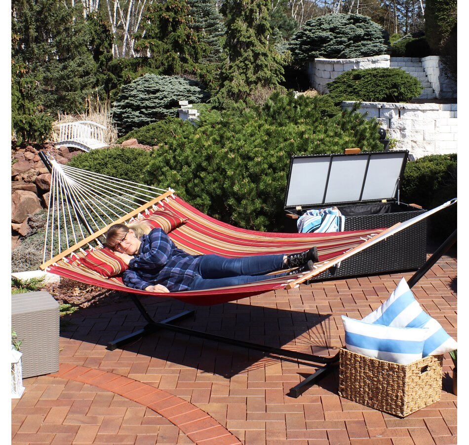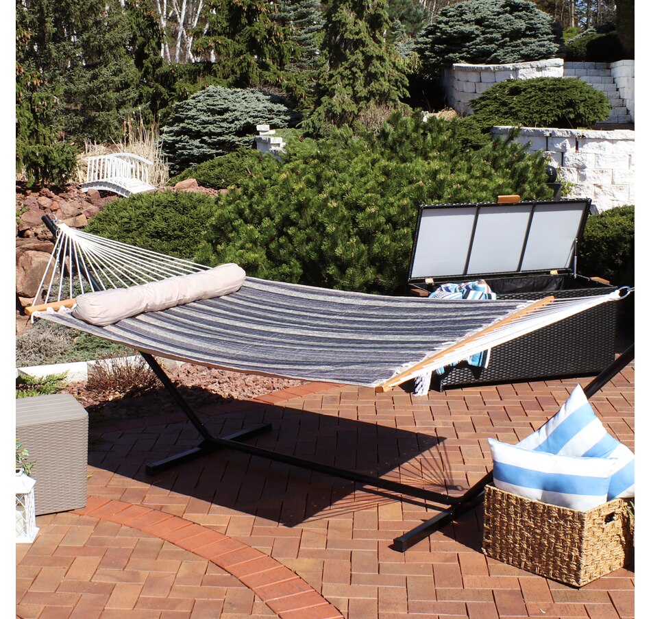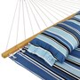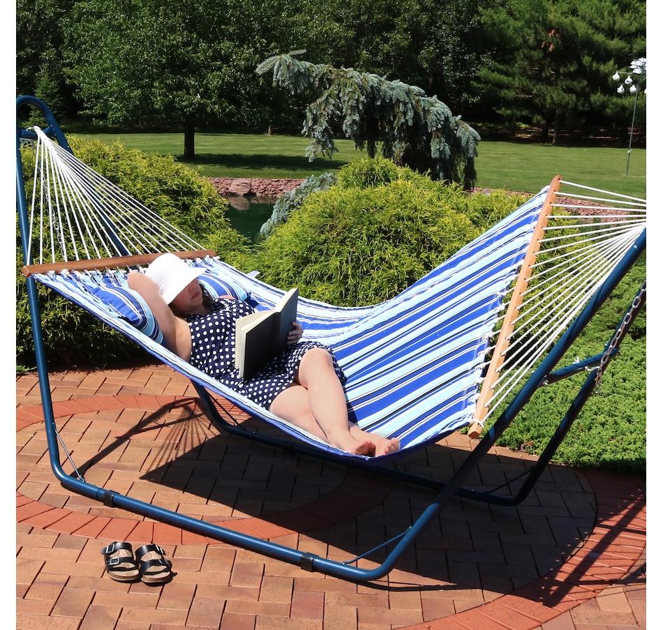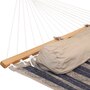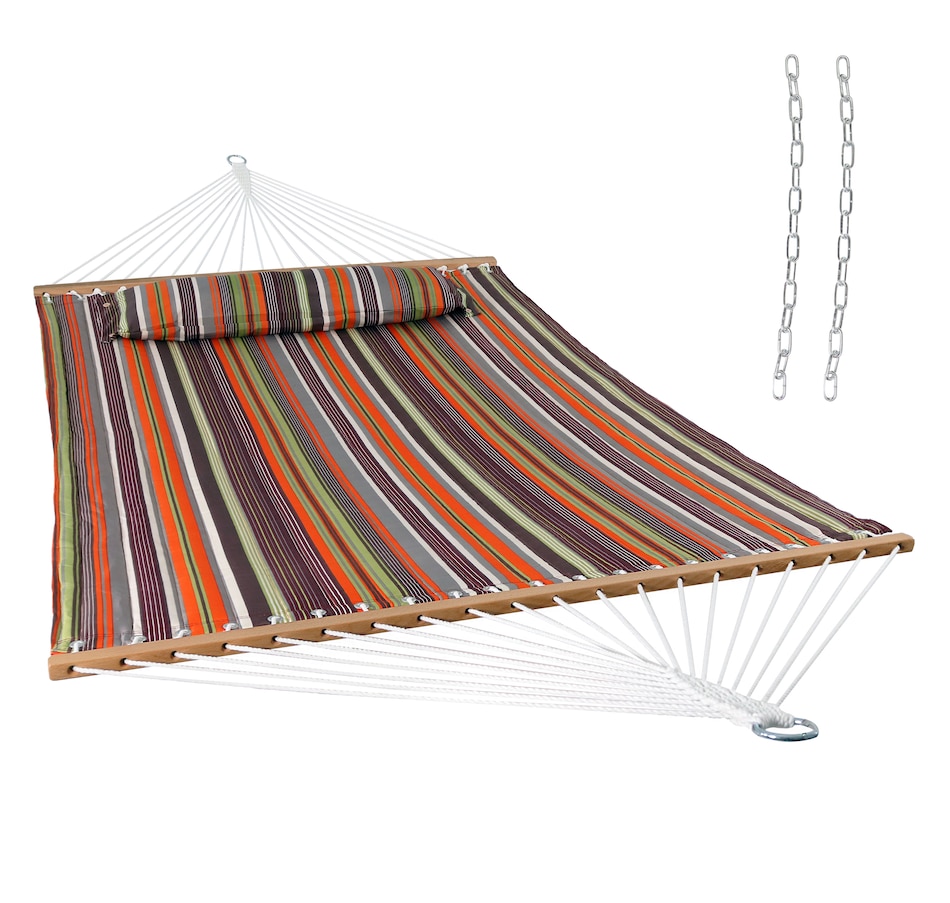 Bring comfort and style to any yard, patio, deck, front porch, campsite, or any other outdoor space with this quilted hammock! The hammock includes a detachable pillow (that attaches with buttons) for a comfortable postiion when napping or relaxing after a long day. Simply hang the hammock between trees, posts, or on a 12' to 15' hammock stand (stand not included). This 2-person hammock is made from a durable polyester material that is dye-treated to make it UV resistant, ensuring outdoor relaxation for years.
