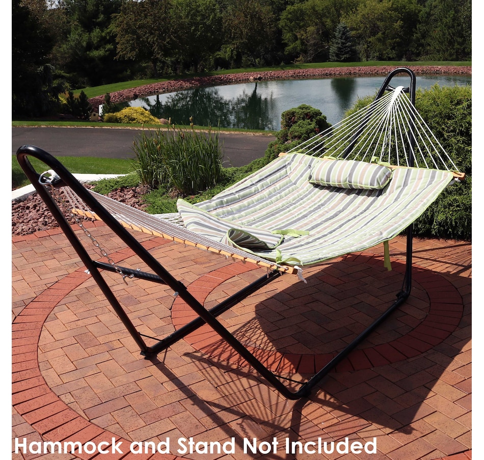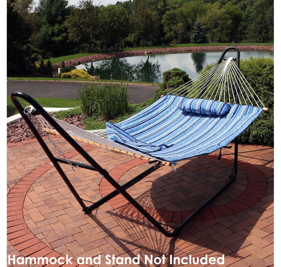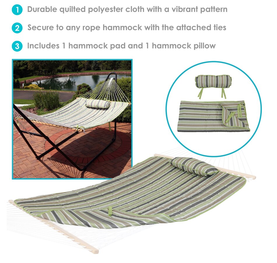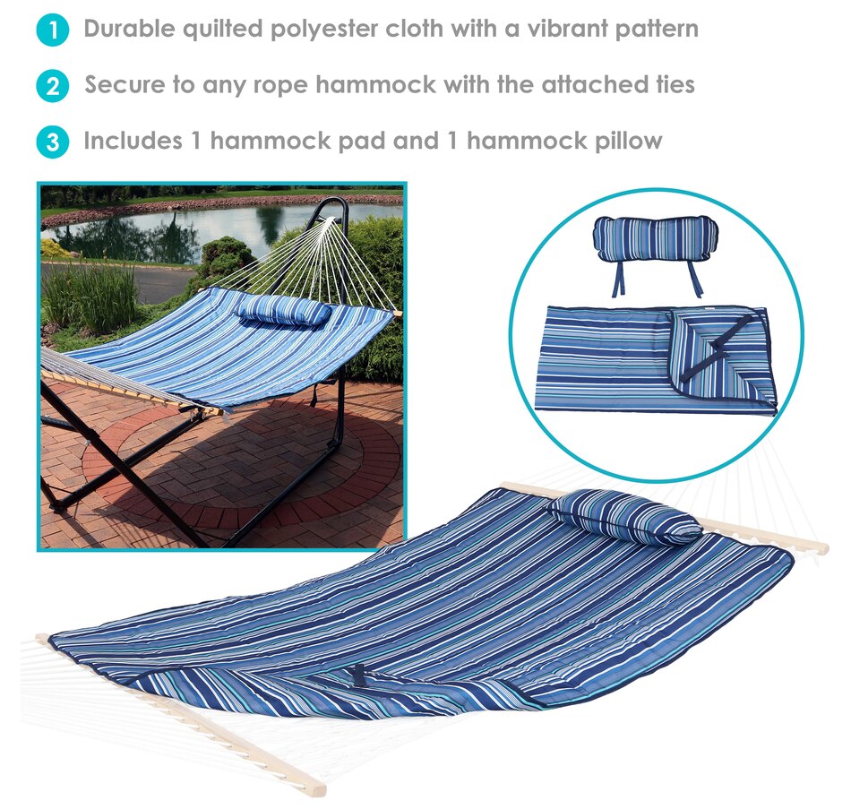 Add comfort and style to any rope hammock with this stylish polyester, quilted hammock pad and pillow. This unique hammock pad and pillow are made with a durable yet soft polyester cover and polyester fiber filling, with a vibrant and colorful print to add a pop of color to any patio, backyard, campsite, park area, or deck. It is great for sleeping in the sunshine in the backyard or hanging between two trees while camping. Easily secure this pad and pillow to any rope hammock with the attached ties to prevent it from accidentally blowing off during windy conditions. Plus, its lightweight material makes it easy to travel with. This hammock pad is large enough to accommodate most rope hammocks.