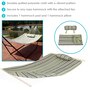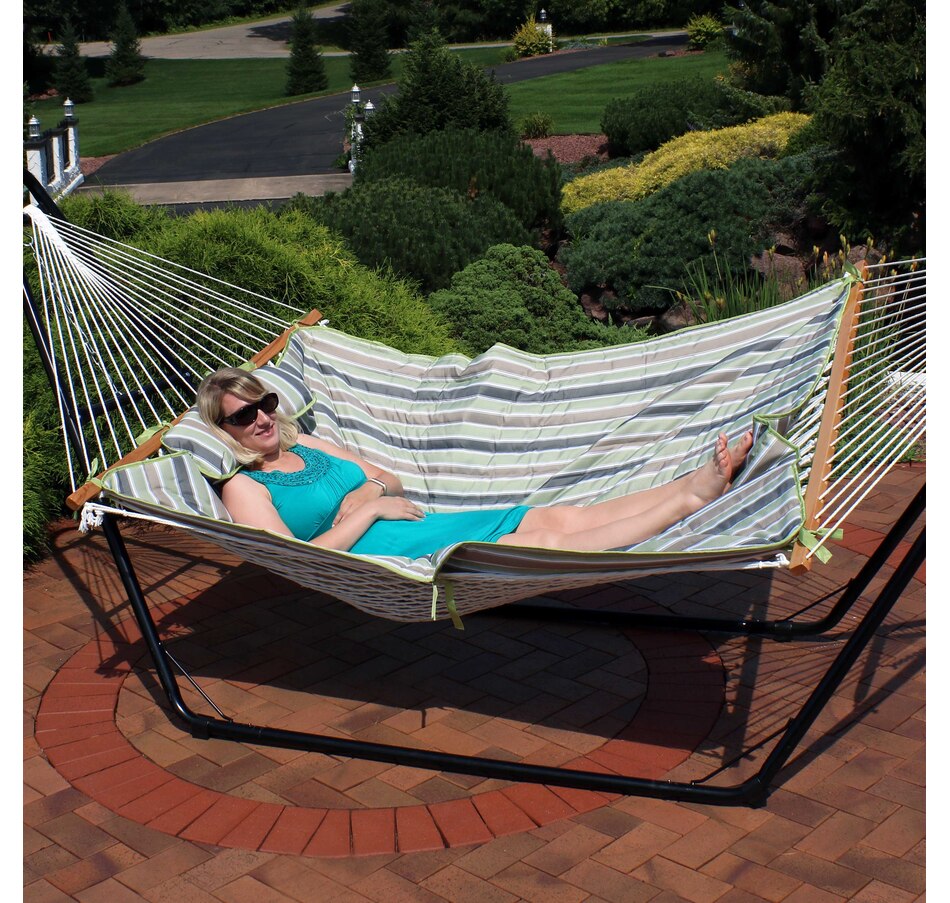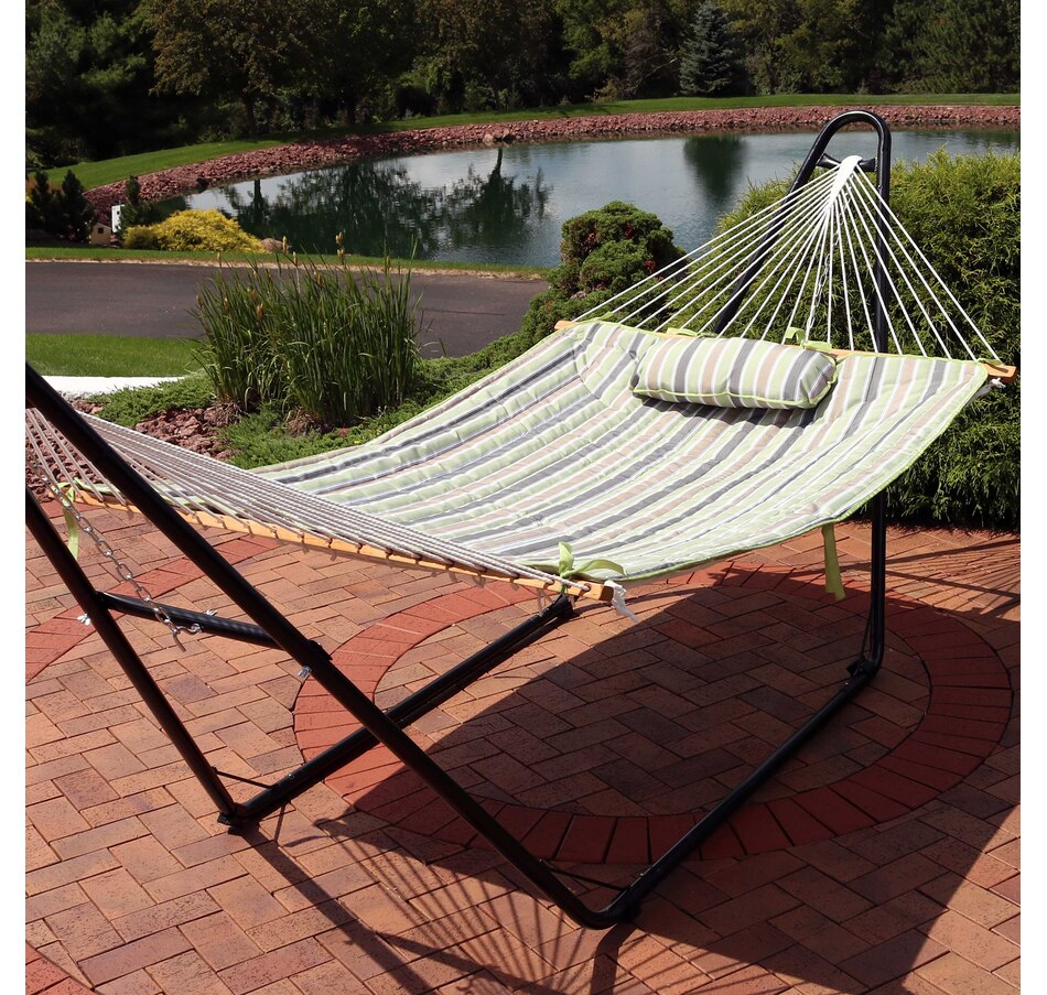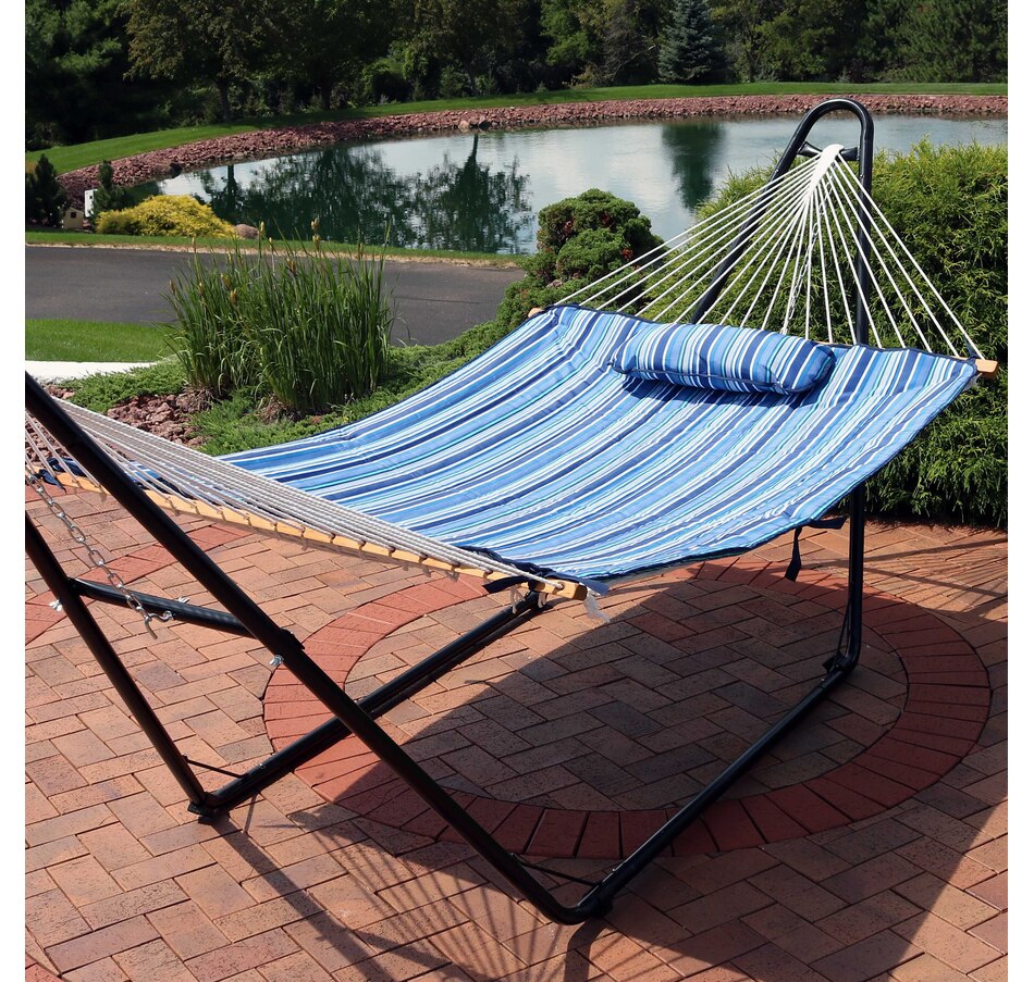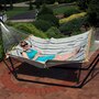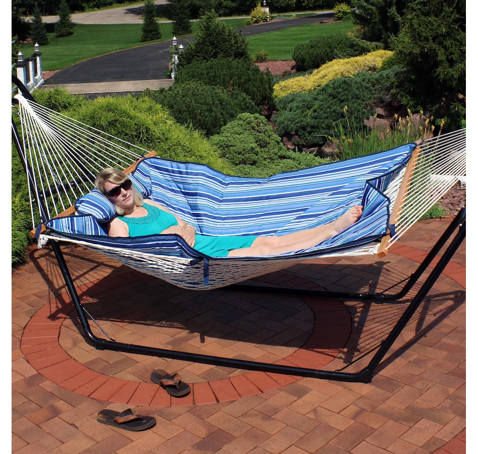 Add comfort and style to any rope hammock with this stylish polyester, quilted hammock pad and pillow. This unique hammock pad and pillow are made with a durable yet soft polyester cover and polyester fiber filling, with a vibrant and colorful print to add a pop of color to any patio, backyard, campsite, park area, or deck. It is great for sleeping in the sunshine in the backyard or hanging between two trees while camping. Easily secure this pad and pillow to any rope hammock with the attached ties to prevent it from accidentally blowing off during windy conditions. Plus, its lightweight material makes it easy to travel with. This hammock pad is large enough to accommodate most rope hammocks.
