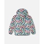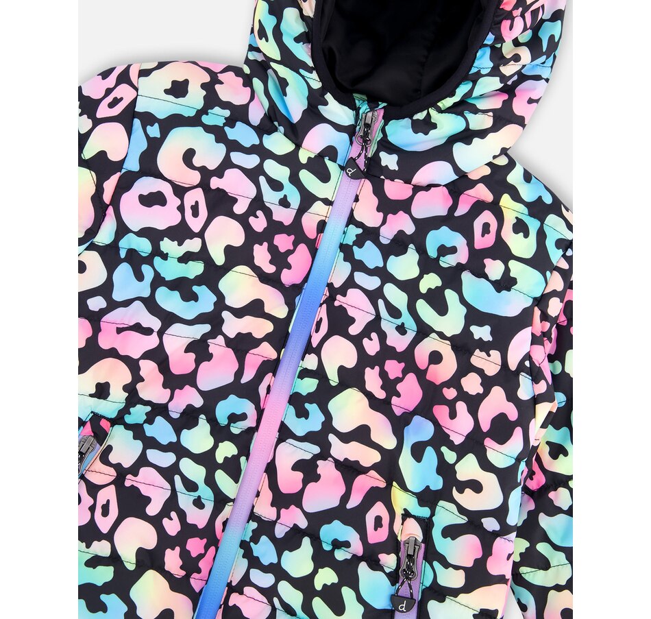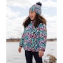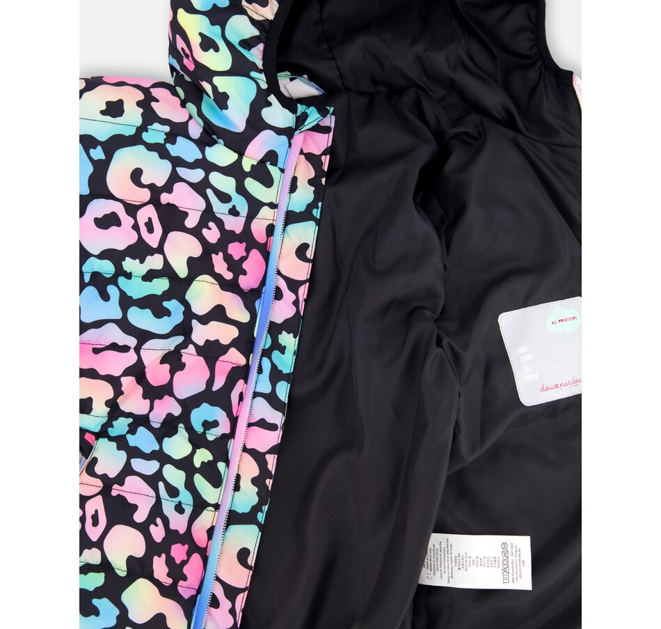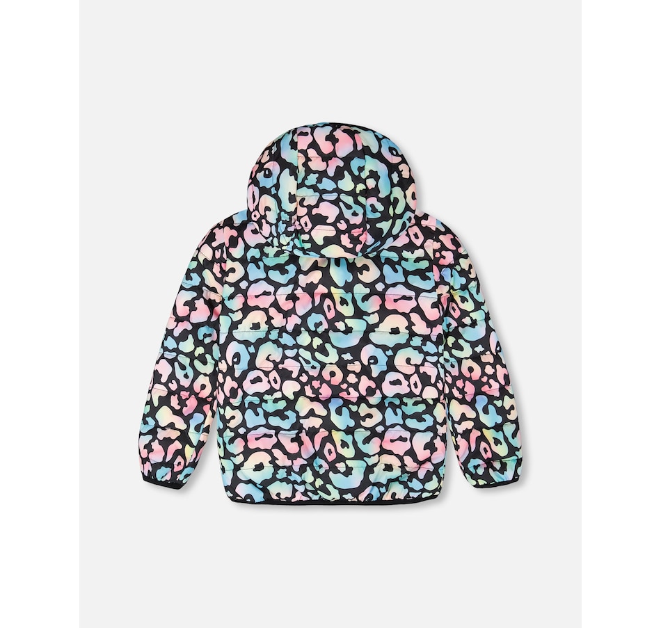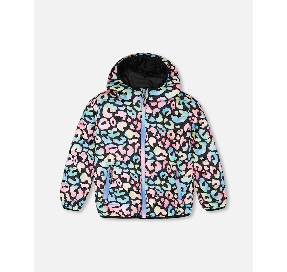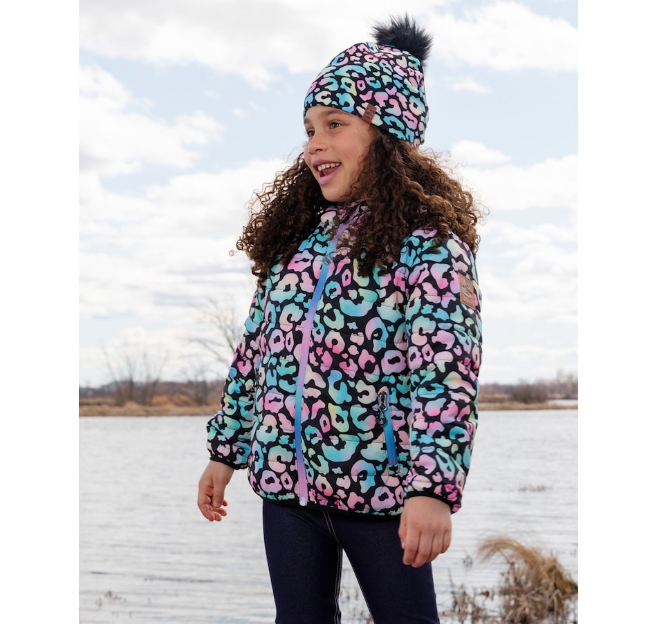 Our quilted polyester mid-season jacket in black with animal print brings a bold, girly twist to everyday outerwear. Featuring a colorful allover animal print, horizontal quilting, and cozy insulation, this jacket blends playful fashion with weather protection. Treated with a fluorocarbon-free BIONIC-FINISH® ECO coating and a 5,000 mm waterproof layer, this stylish hooded jacket keeps girls dry, warm, and effortlessly chic.