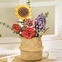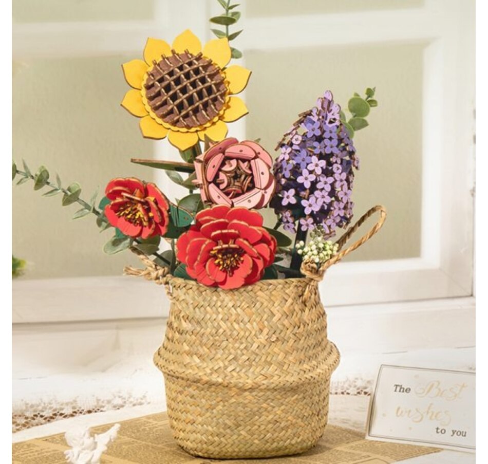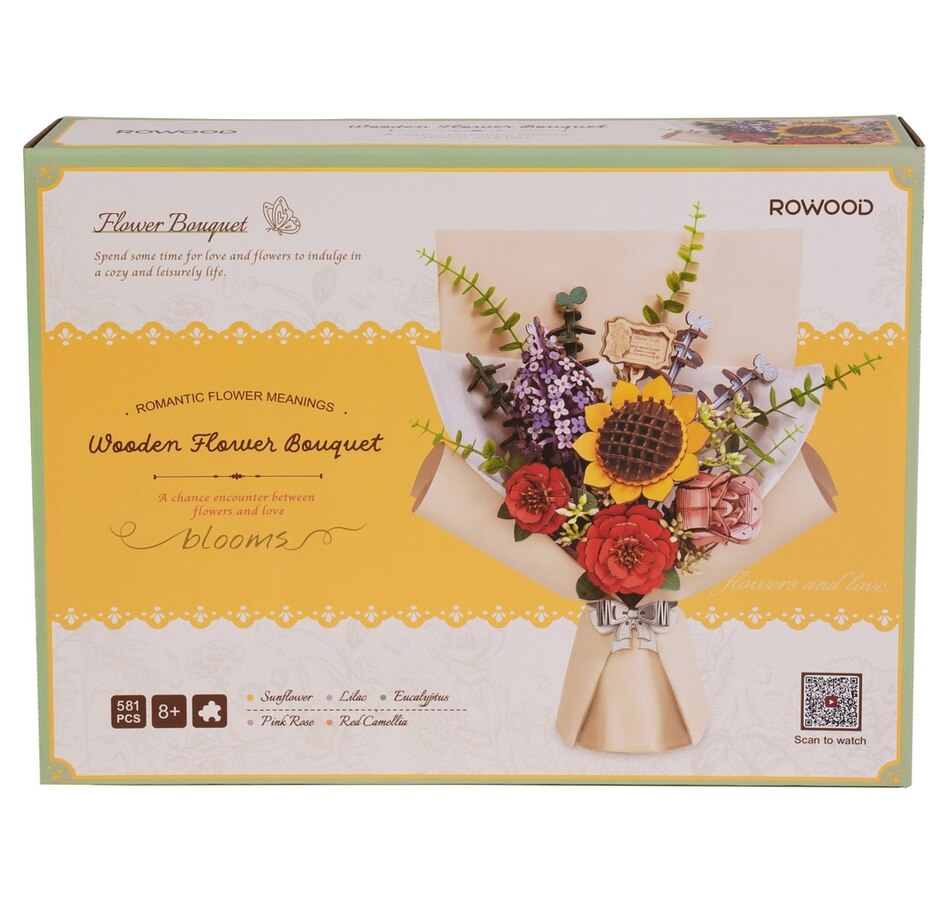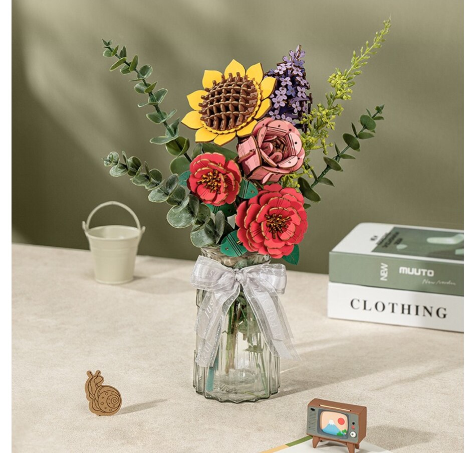 - Complete Kit: Includes 581 wooden pieces to assemble a beautiful and realistic flower bouquet, featuring pink roses, sunflowers, red camellias, eucalyptus, and lilacs.