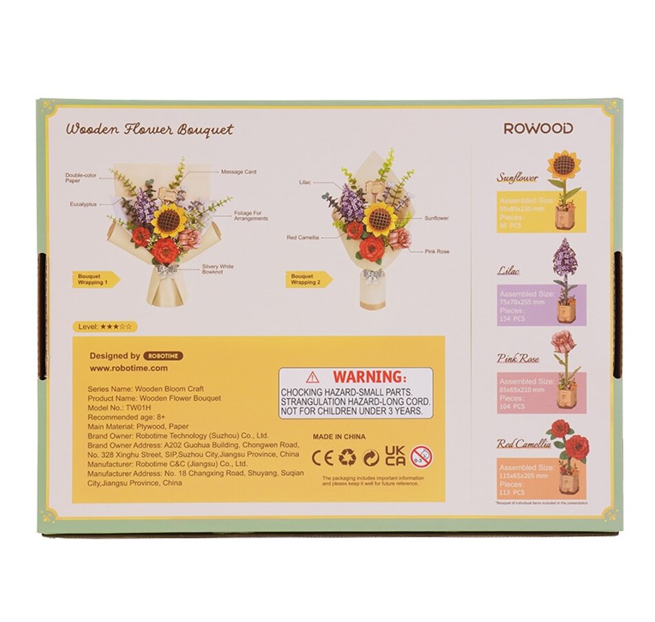 ROWOOD Wooden Flower Bouquet TW01H - Arts & Craft Kit (581 Pieces) | STEM Educational Craft for Ages 8+ | Includes Pink Rose, Sunflower, Red Camellia, Eucalyptus, and Lilac | Intermediate Difficulty | ~3-Hour Assembly | Assembled Size: 260x150x400mm | Crea