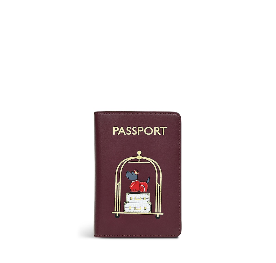 Helping with your bags, Scottie the dog is handy with a luggage trolley, delivering some Heirloom-print cases on the Radley Bellboy passport cover. A perfect accessory for holidays and hotel stays, it is crafted in smooth leather with mini-applique, prints and foil.
