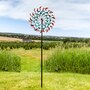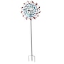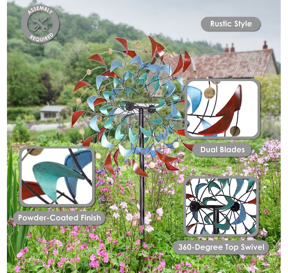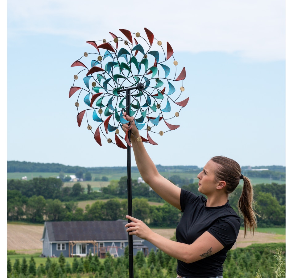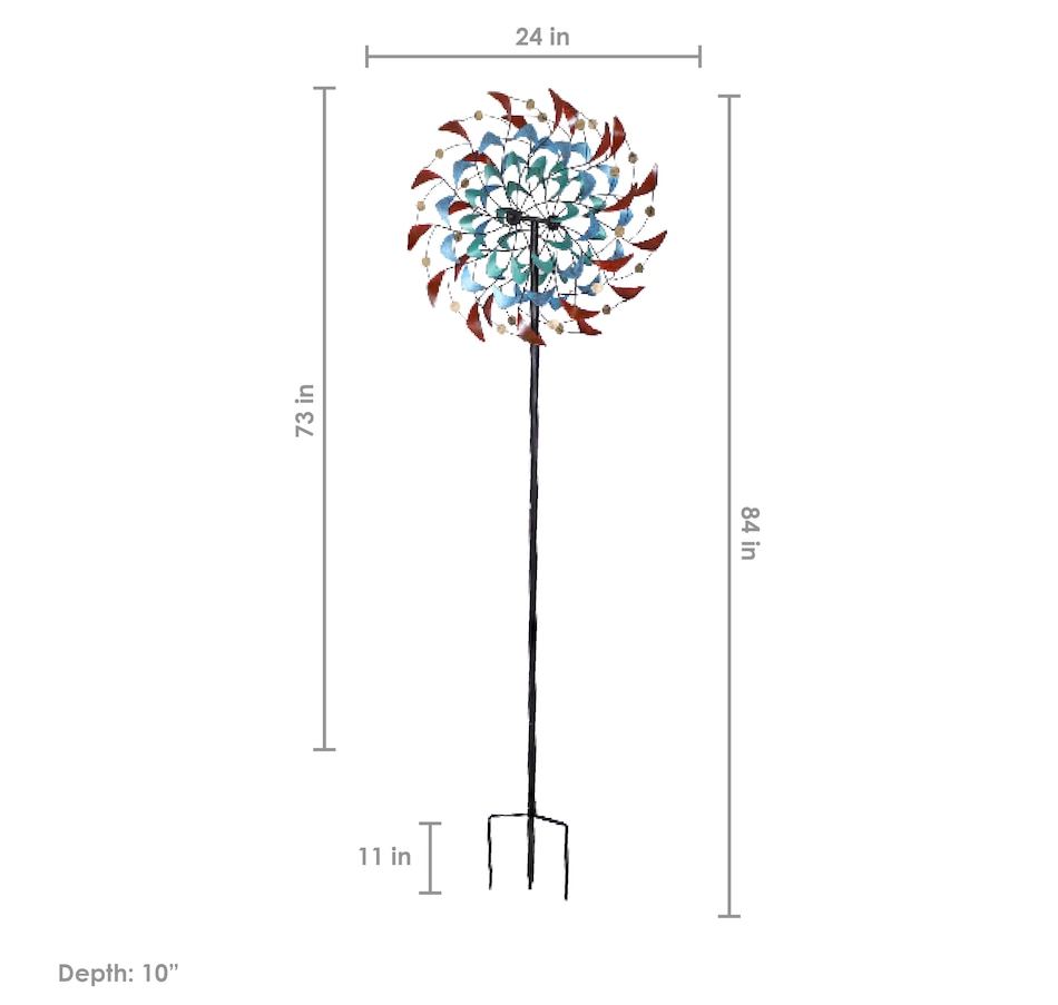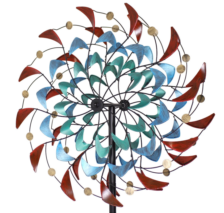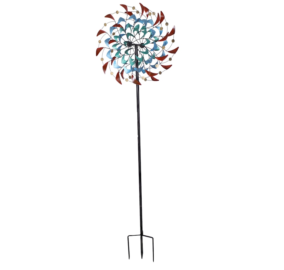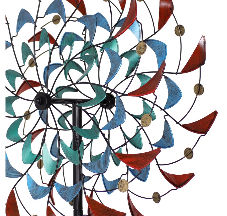 Watch the vibrant colors and shapes dance in the breeze with this unique double wind spinner. A dynamic piece of art for the yard, this spinner outdoor decor stands 84" tall. This wind spinner with a ground stake is made from dependable iron and features a powder-coated finish. Securely drive the spinner into the ground using the 4-point stake at the bottom of the pole. This impressive outdoor kinetic art piece is easy to assemble, and all the tools and hardware needed for assembly are included. It features two beautifully designed blades that spin independently and can move in both counterclockwise and clockwise directions based on the wind. The top portion of the spinner can also turn 360 degrees if the wind is strong enough. The blades of the spinner are adorned with unique shapes in shades of red, blue, turquoise, and yellow. This modern wind lawn ornament is a stylish addition to the backyard or garden.