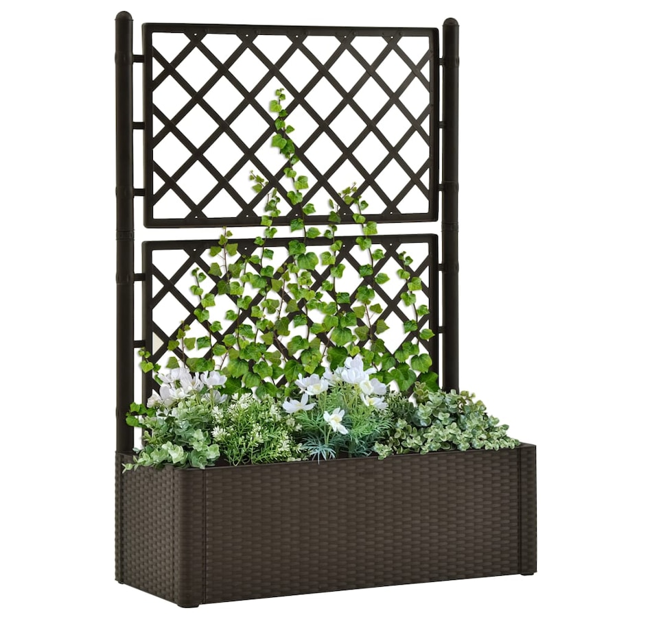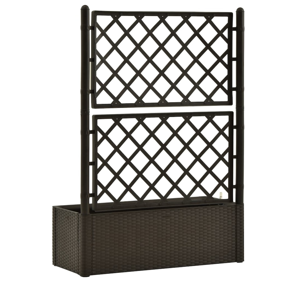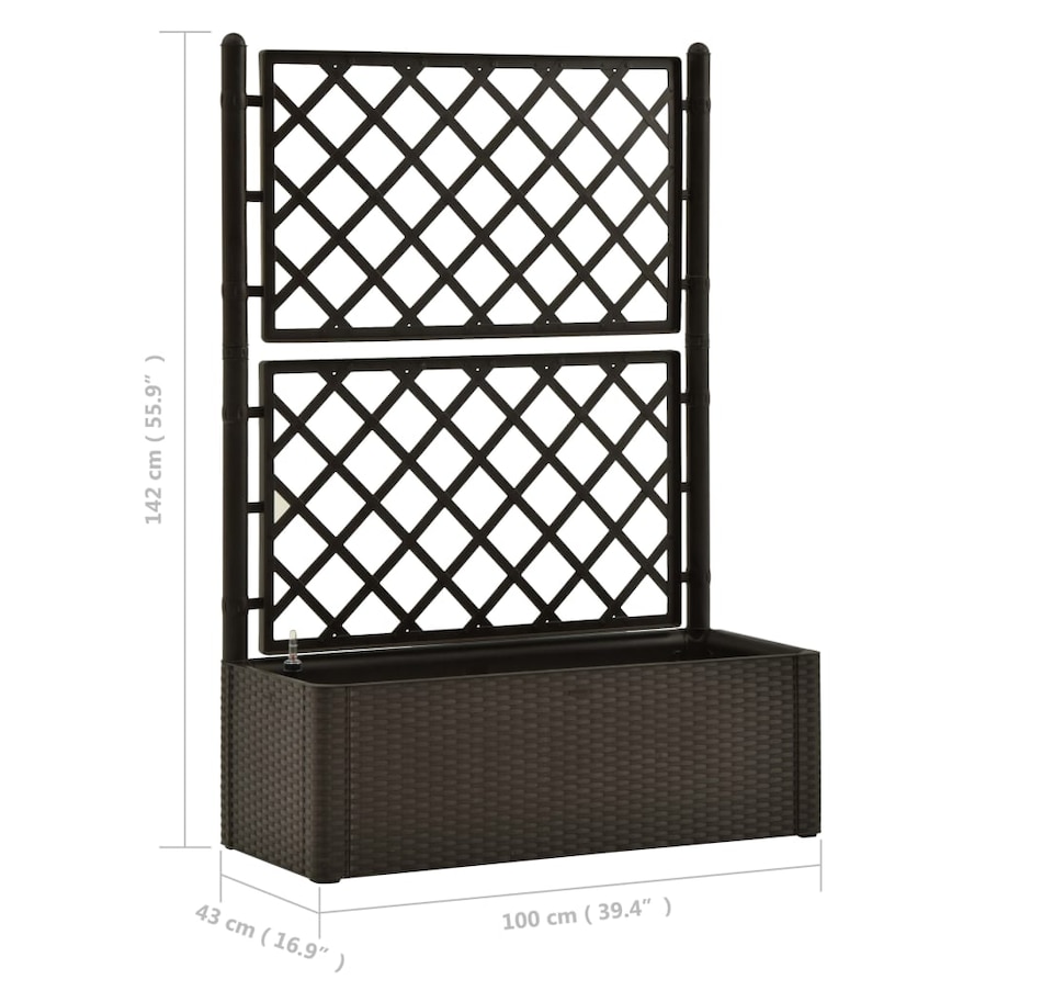 Create a beautiful backdrop for your flowers with a stylish, functional and unique raised bed! This trellis planter has a large flower box that can accommodate a large number of green plants and flowers. The built-in trellis provides excellent support for climbing plants, such as herbs, tomatoes, beans, etc. Made from sturdy UV, weather and frost resistant plastic, it is suitable for indoor and outdoor use. The design resembles a deceptively real rattan structure. The material is washable and easy to clean. Additionally, this box can automatically water plants by draining moisture from its 90L water tank and features water overflow holes to prevent excess water. Level indicator is included.