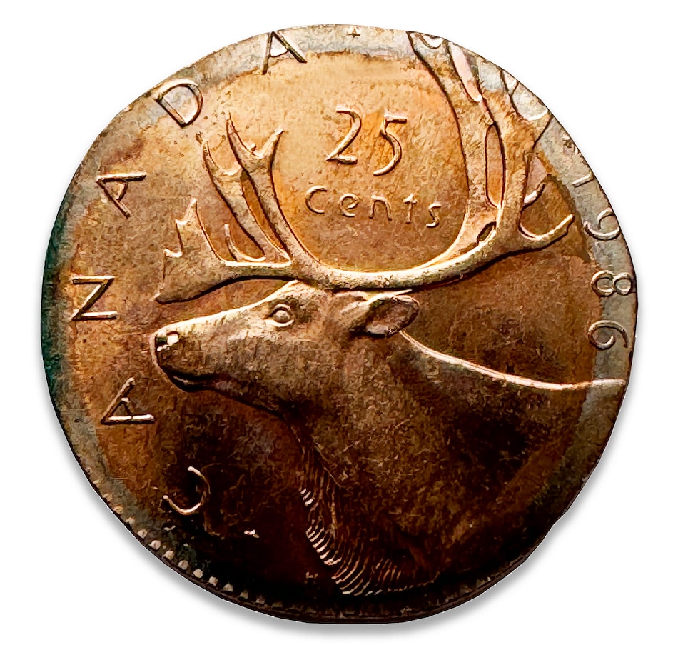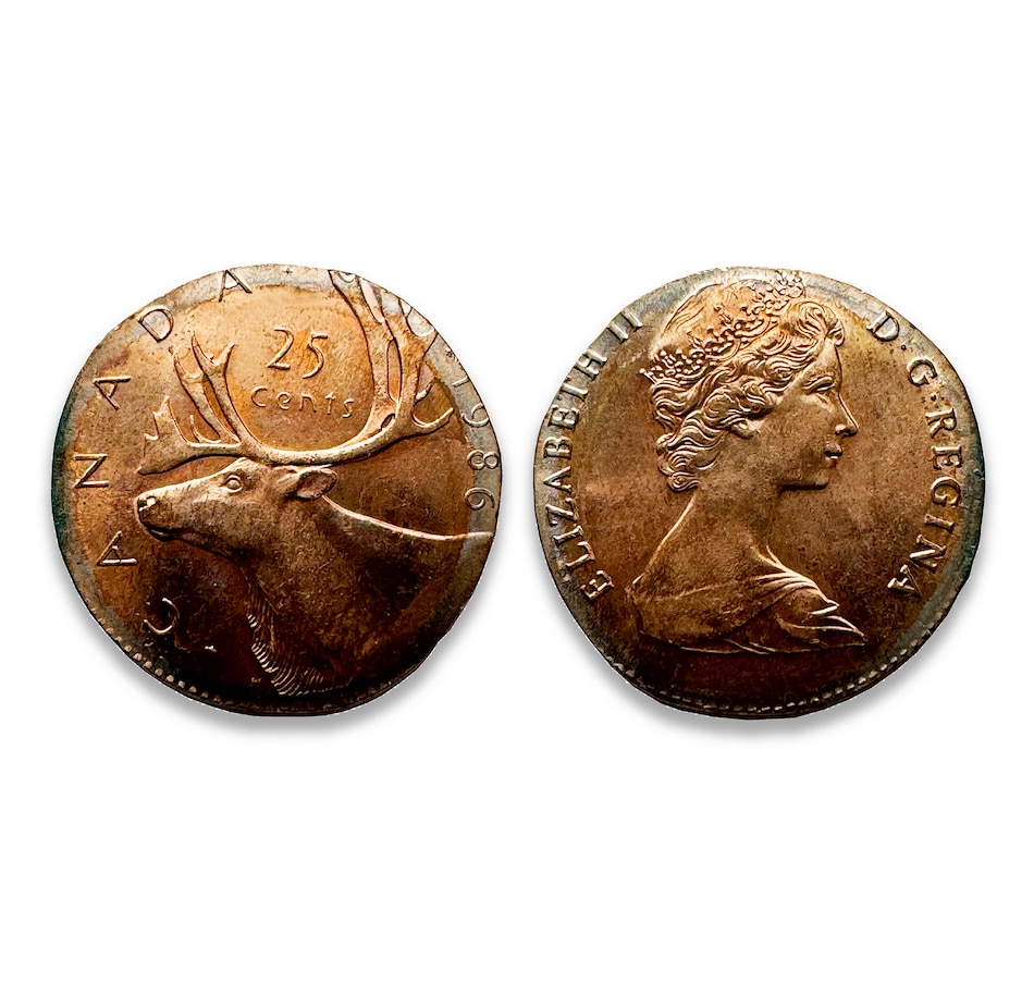 This extremely rare and dramatic Canadian error quarter coin has been struck on the blank intended for a 10-cent coin. The coin is dated either 1985 or 1986 and is in uncirculated condition.