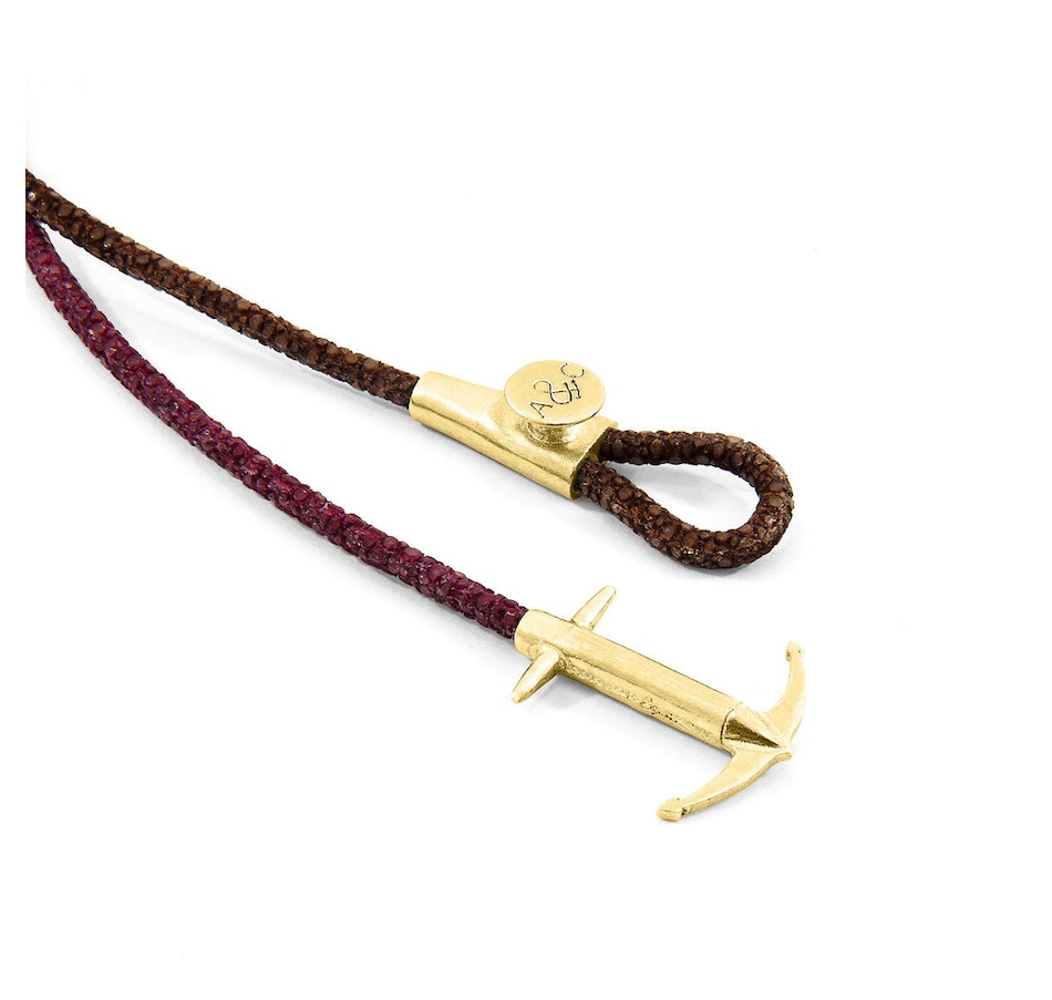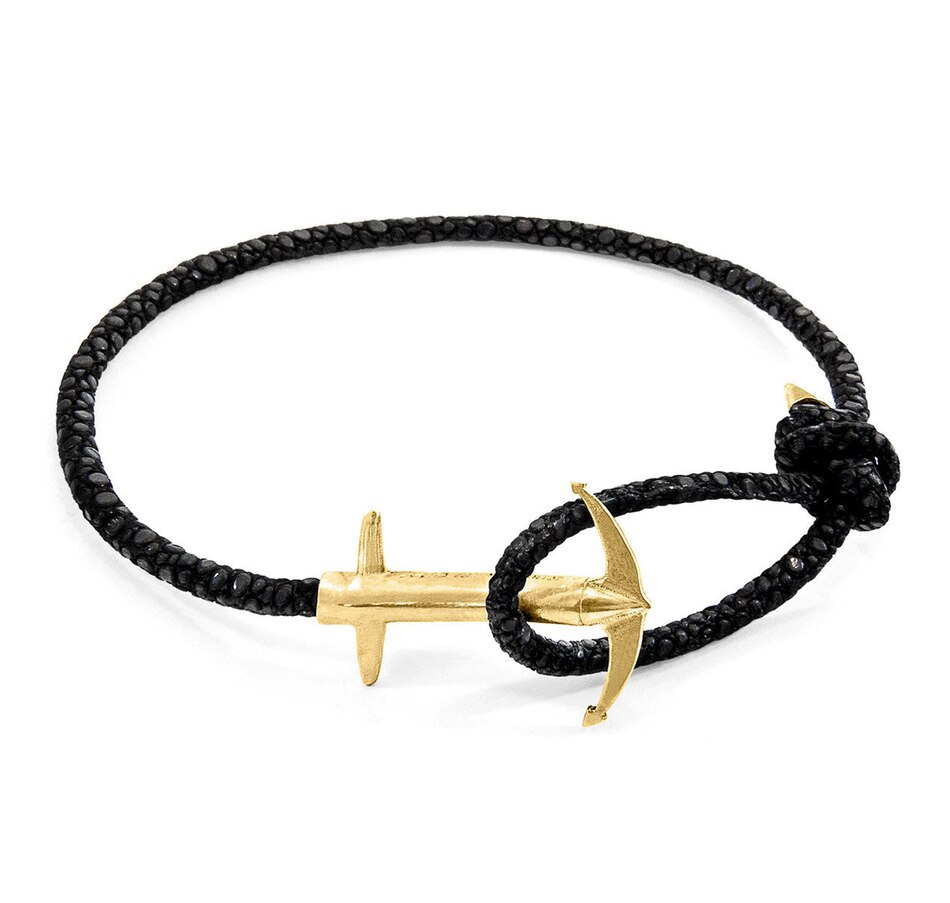 The Raven Black Admiral Anchor 9ct Yellow Gold and Stingray Leather Bracelet was both designed and skilfully handcrafted completely in Great Britain. Combining British craft manufacturing with a discerning modern-minimalist style, this ANCHOR & CREW bracelet features:Genuine and natural round-shaped soft-to-touch stingray leather (GB)Secure solid 9ct (karat) yellow gold anchor (GB) A fineness of 9ct (karat) is chosen for this solid yellow gold to give added durability/wearability benefitsPLEASE NOTEDue to this design's fine materiality, please note there is a 7-10 working day(s) extension on manufacturing. Quality matters.SIZINGThis bracelet is one size fits all, with the leather able to extend or tighten to suit your wrist size. To take the bracelet on or off your wrist, simply slide the one adjustable knot around the leather to make the loop size smaller or larger, and once set, keep the loop size consistent and continue wearing by easily unhooking the clasp from the loop. Less is More.