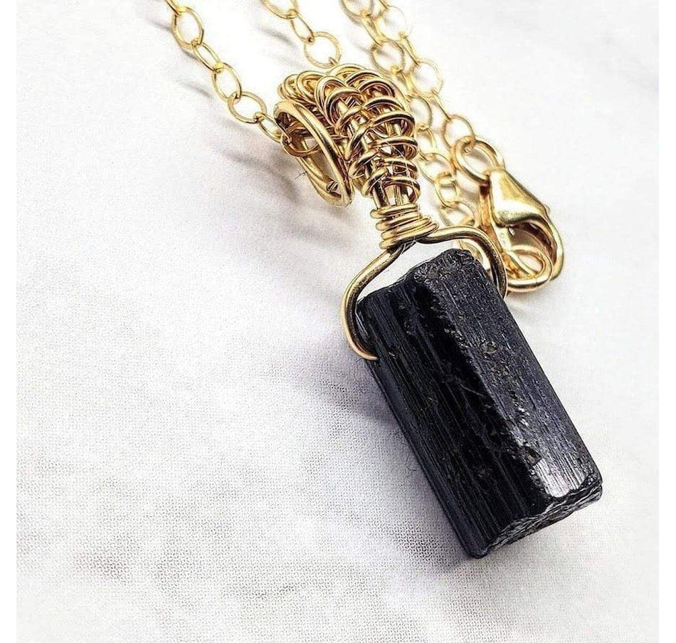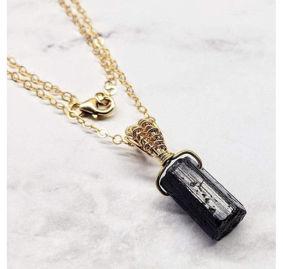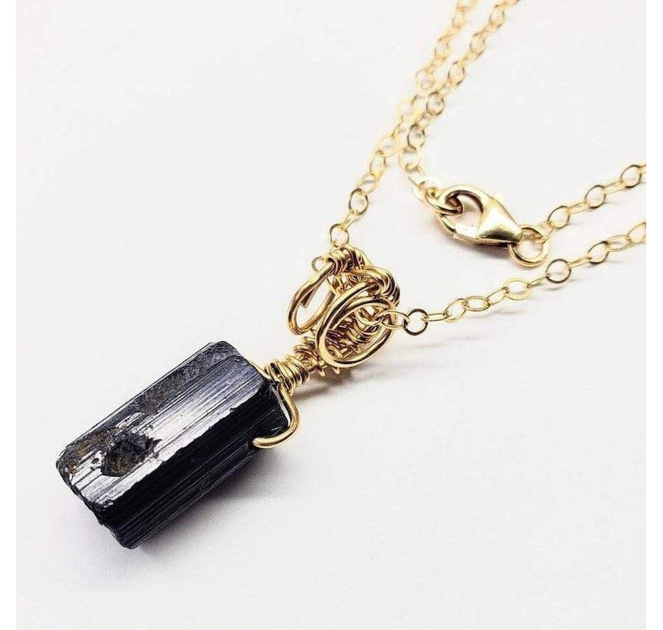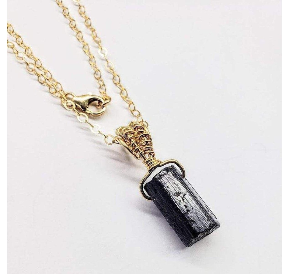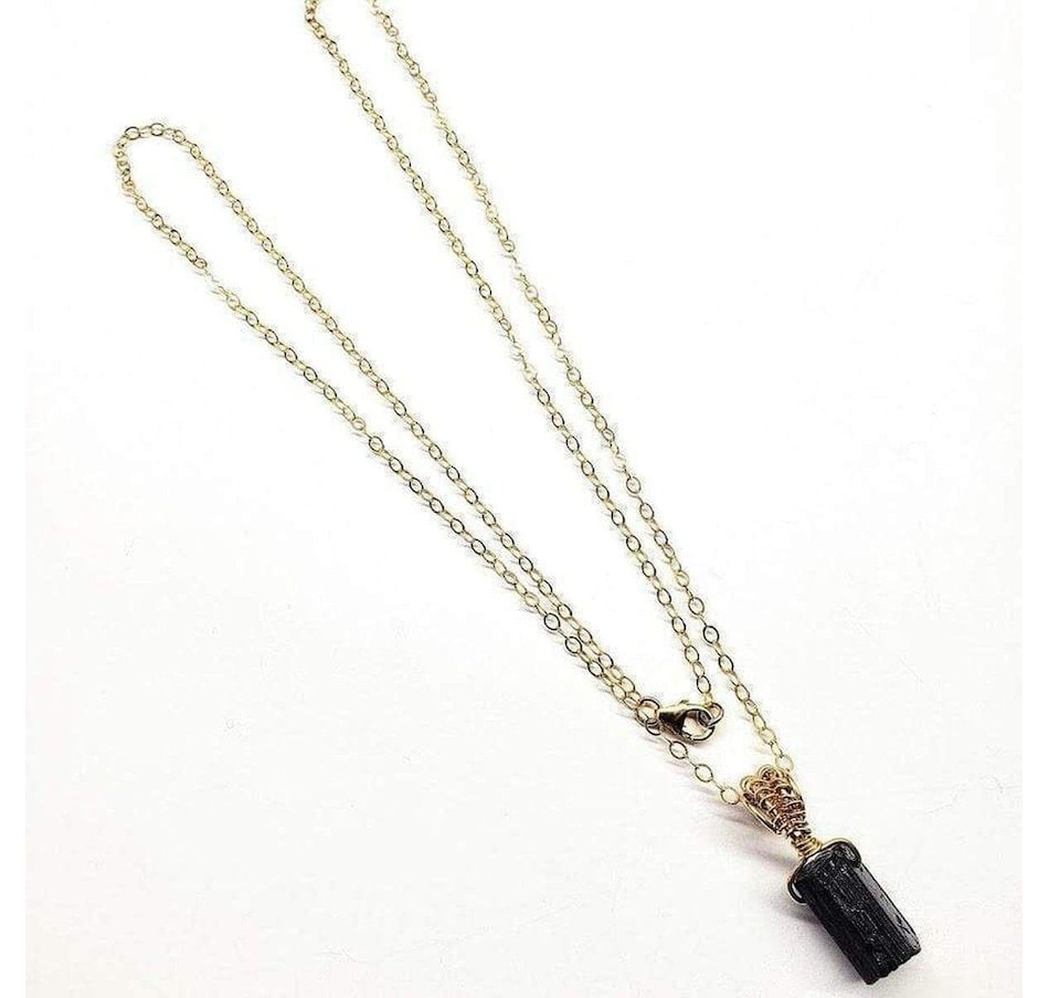 This handcrafted, rustic-inspired piece of jewelry features an uncut raw black tourmaline gemstone, 14K gold-filled wire, and a dazzling 22-inch golden chain. Combining sophisticated elegance and earthy charm, it serves as a versatile accessory that pairs with any outfit - from outdoor adventures to office wear.Unique Wire Wrapped NecklaceAll Metal is 14 Ct Gold Filled not gold-plated.14 Ct GF Flat Cable ChainSecure Medium Size lobster closureRaw Uncut Black Tourmaline Gemstone about 10x20mm Length of pendant is approx. 1inchLength of necklace 22"Handmade in MontanaPlease note each tourmaline in slightly beautifully different raw and uncut.FYI:Black Tourmaline is said to be one of the most common meditation crystals. It is exceptionally grounding to the Earth's energies, freeing one to explore the spiritual world without harm or danger, and provides high levels of purification for the auric field and the etheric body.