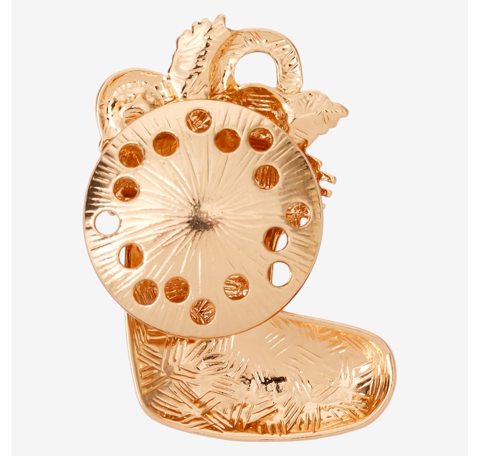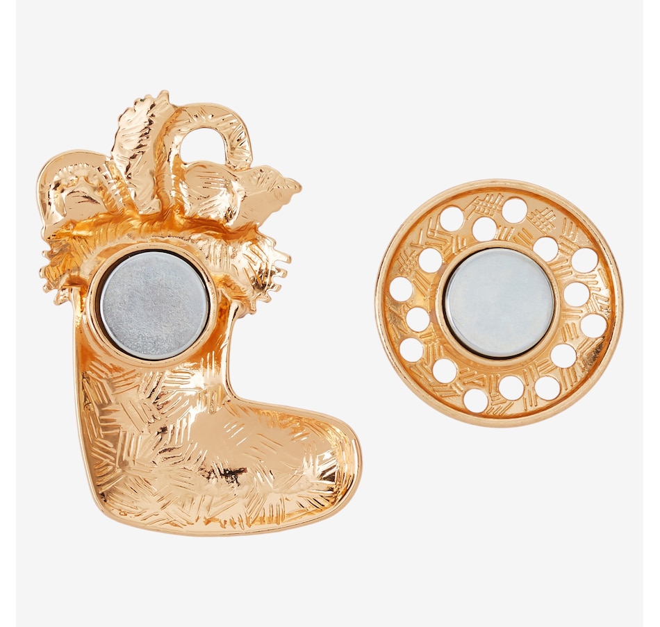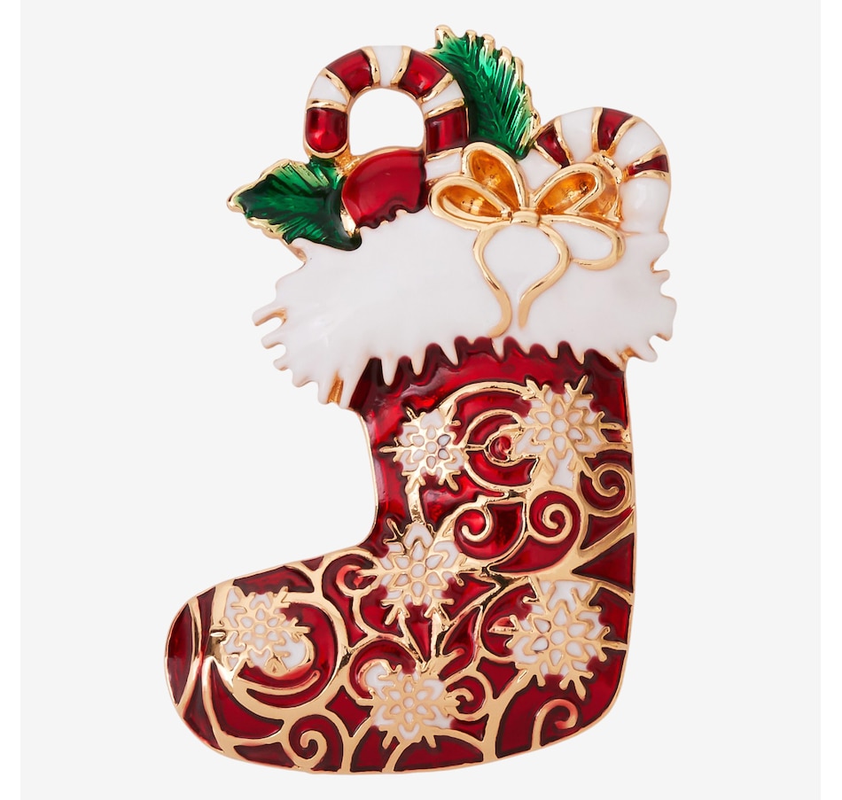 You'll accessorize every ensemble in festive, seasonal style with this gorgeous gold tone stocking pin. Magnetic pins are easy to take on and off; they leave no holes, no marks, and are a quick and easy way to add an accessory to finish your ensemble.