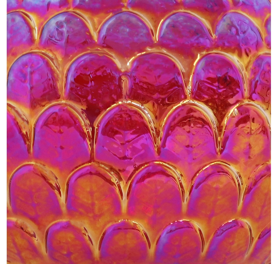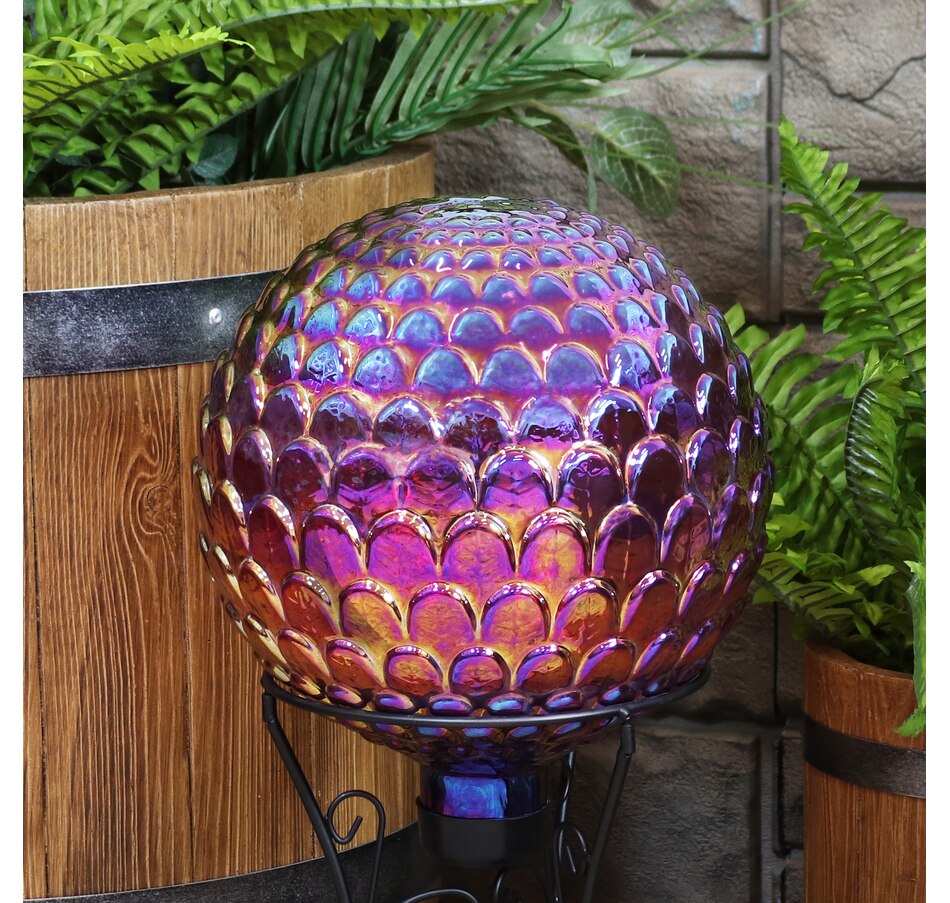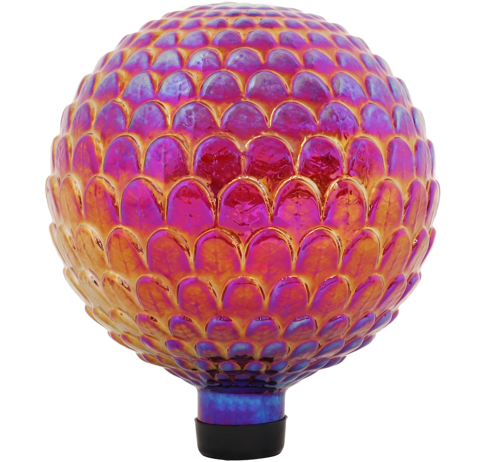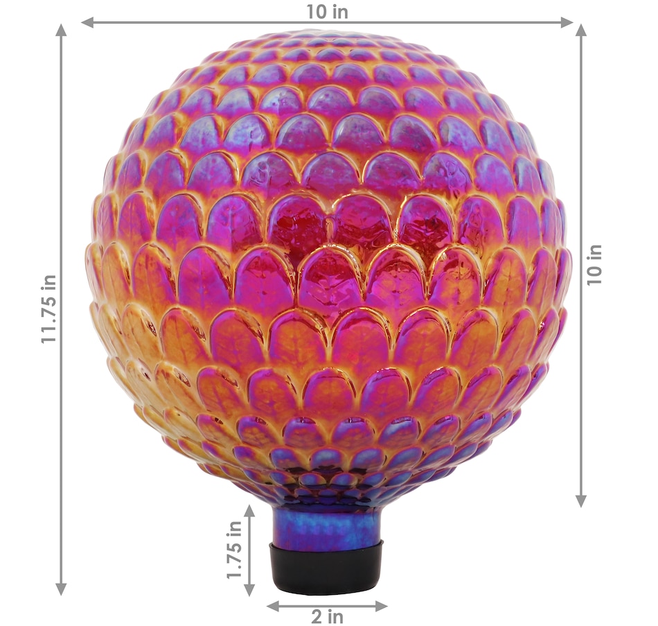 Accent any outdoor space with a vibrant, fun, and unique decoration with this scalloped, outdoor glass gazing globe. Featuring an iridescent, scallop-textured surface, this decorative piece will reflect colorful light as the sun beams on the glass material. It features a stemmed bottom with a rubber cap that protects the edges of the stem from vibrations from other objects or outdoor impacts. This design also makes it easier to place this gazing globe in a decorative stand (stand is not included). Always store the gazing globe indoors before freezing or harsh weather occurs to better ensure its longevity. This gazing globe will make any patio, deck, garden, flower bed, yard, or other landscaping area attractive and colorful with its unique, scalloped design. The iridescent surface is sure to bring a nice pop of color to any garden area.