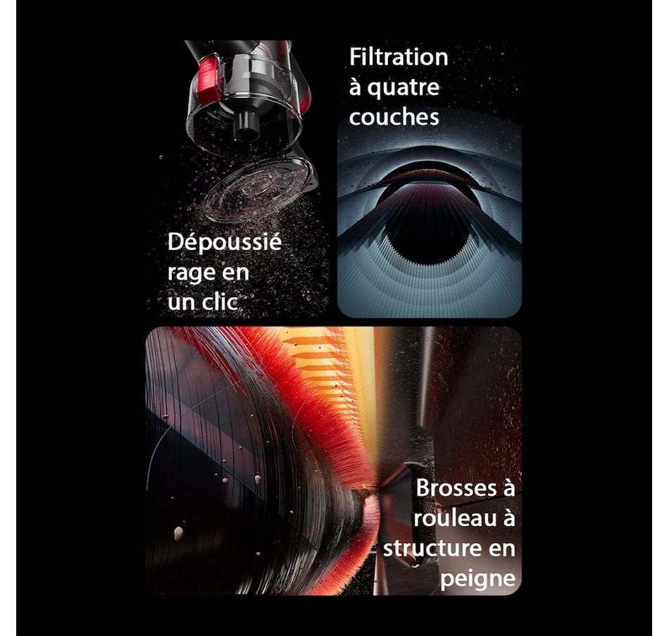 • Dual Cyclonic Technology Separation system traps fine dust and dirt in the bin, so your vacuum doesn't lose suction
