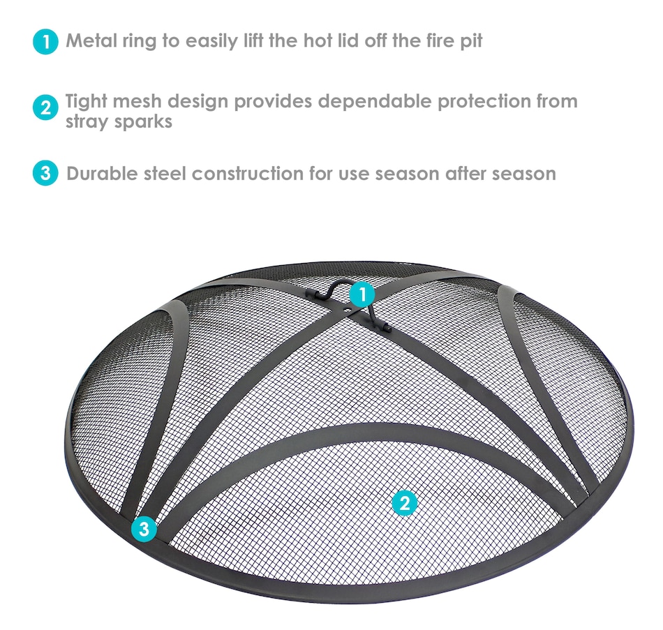Get dependable protection from stray sparks and embers while relaxing around the firepit spark screen. This heavy-duty, spark screen for fire pit ring is made from durable steel with a mesh design to keep sparks within the fire pit and stay resistant to elements when used outdoors. It features a stylish design in a classic black color that will complement any fire pit style and any patio, deck, yard, or campsite aesthetic. Plus, the metal ring at the top of the mesh fire pit lid makes it easy to remove from the fire pit. Use a poker (not included) if the screen gets too hot to the touch! This attractive, convenient cover comes in multiple sizes to get the screen that best fits the favorite outdoor feature. Keep friends and family safe from flying sparks from the fire and get an attractive feature all in one with this fire pit spark screen replacement.