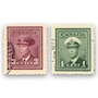 These special-issue postage stamps were issued during WWII. This set includes a green 1942-issue stamp featuring King George VI in a navy uniform, and a burgundy 1943 three-cent stamp featuring King George VI in an air force uniform.