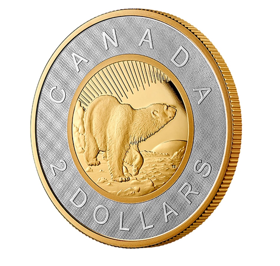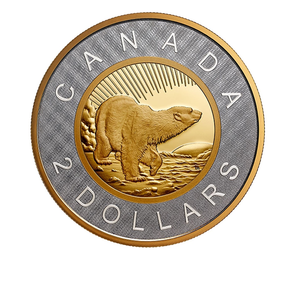 • This was one of two designs that appeared on the $2 circulation coins in 2006. Both were designed by Tony Bianco, but the first one resembled the original design introduced in 1996, while this version features an updated pose and the aurora borealis.