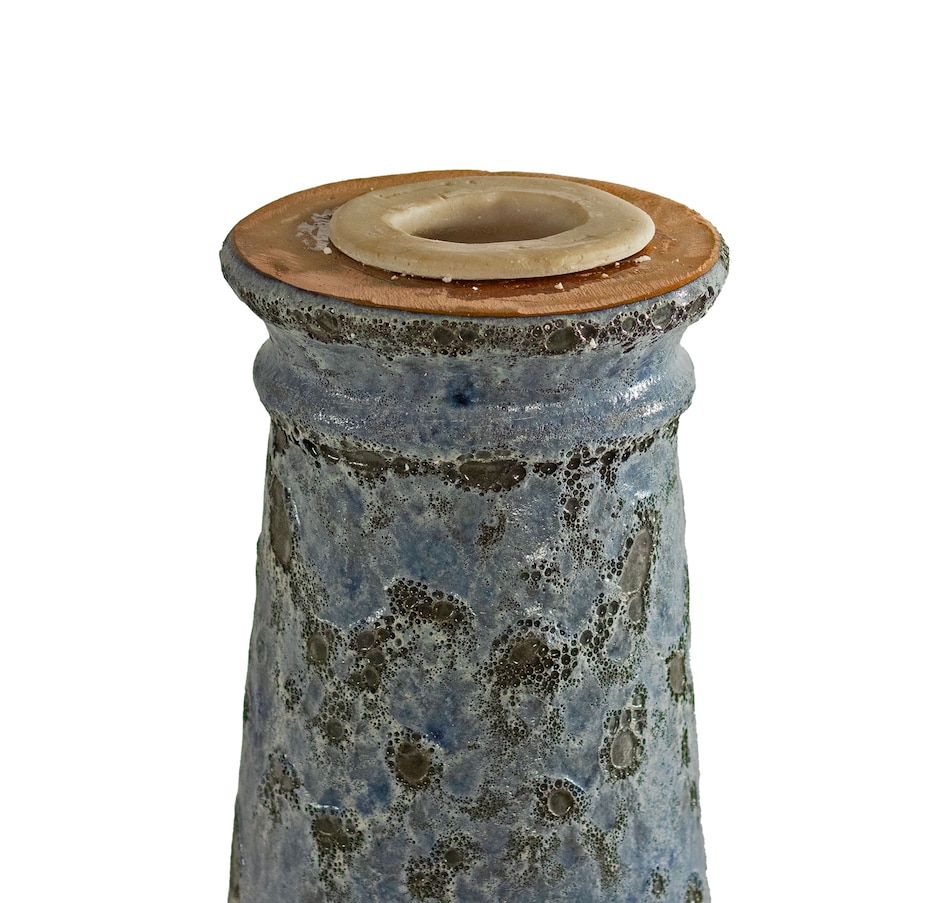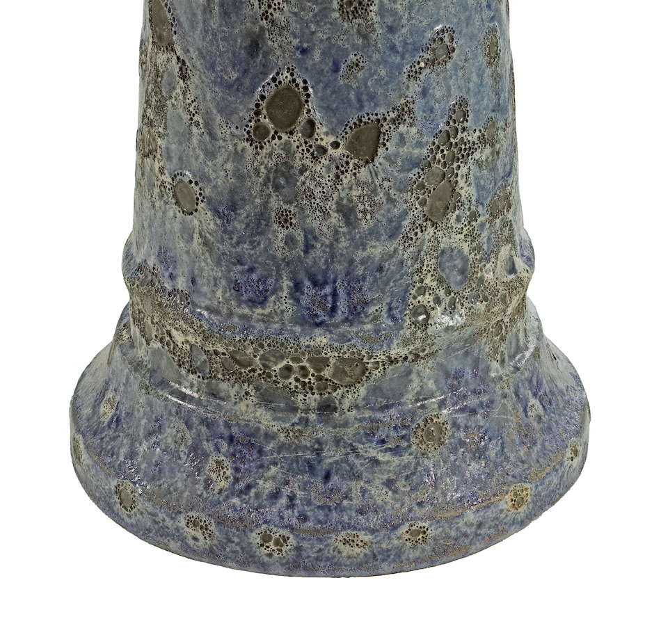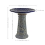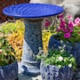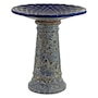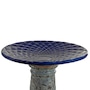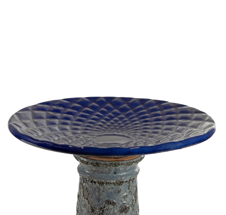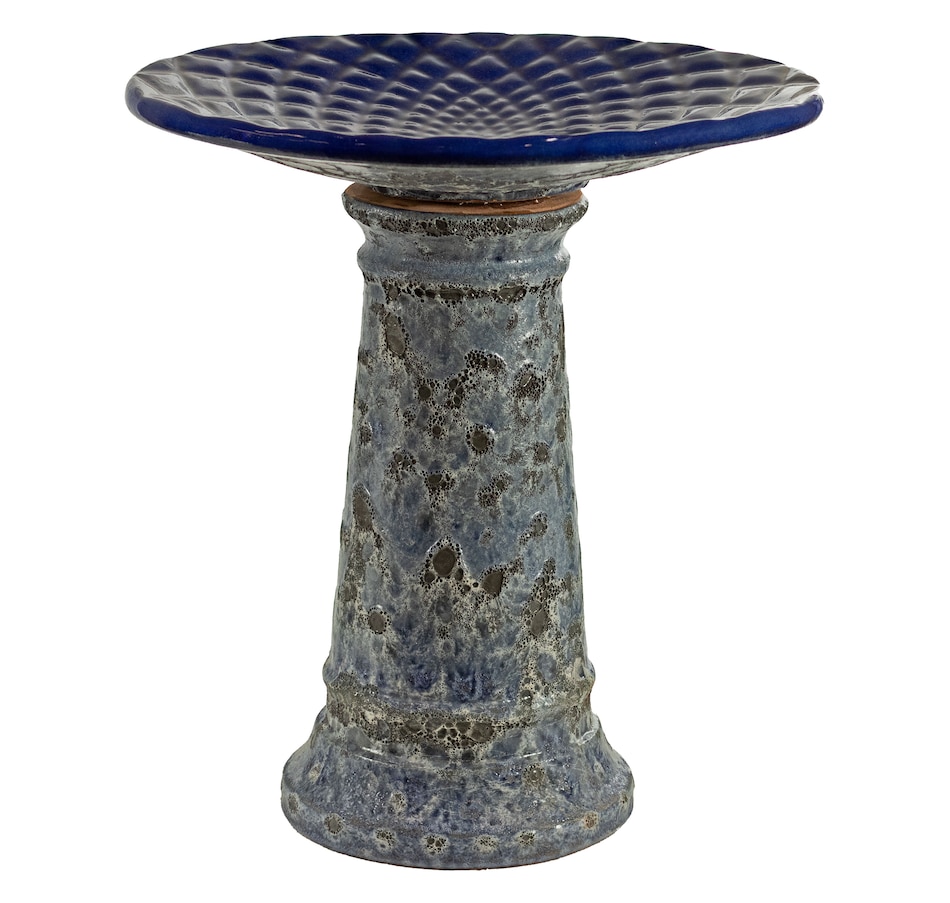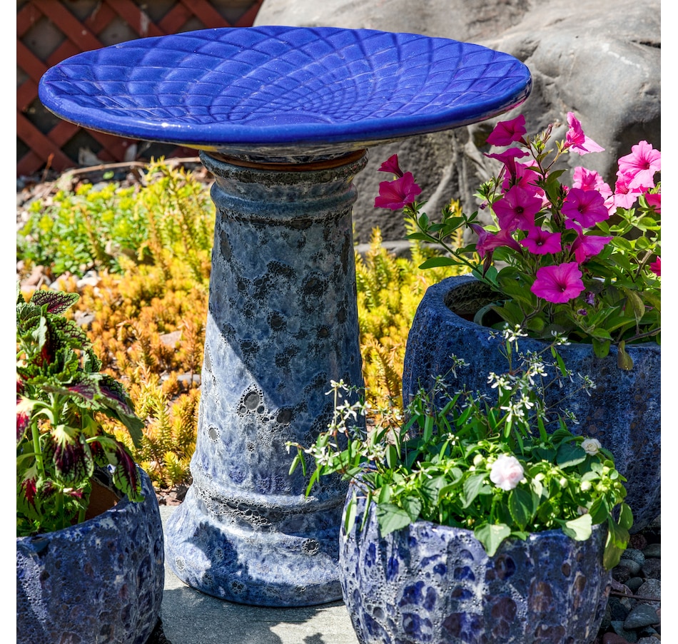 Add a dramatic centerpiece to the patio or garden with this striking outdoor bird bath. Made from frost- and UV-resistant ceramic to resist the outdoor elements, this decorative bird bath features a shiny, glazed blue bowl with a unique mandala pattern and a dramatic, one-of-a-kind lava surface treatment for a distinct look. The bowl is capable of holding up to 6 cups so there is plenty of water for feathered friends to splash and preen. The wide bowl ensures that there is room for all sorts of birds to gather. Assembling this bird bath is easy, simply place the bowl on top of the pedestal. No tools or hardware are required for assembly. This elegant bird bath is a stylish addition to the garden, patio, or front porch. To attract more birds, try to place this bird bath in a slightly shaded area with nearby tree or bush shelter.