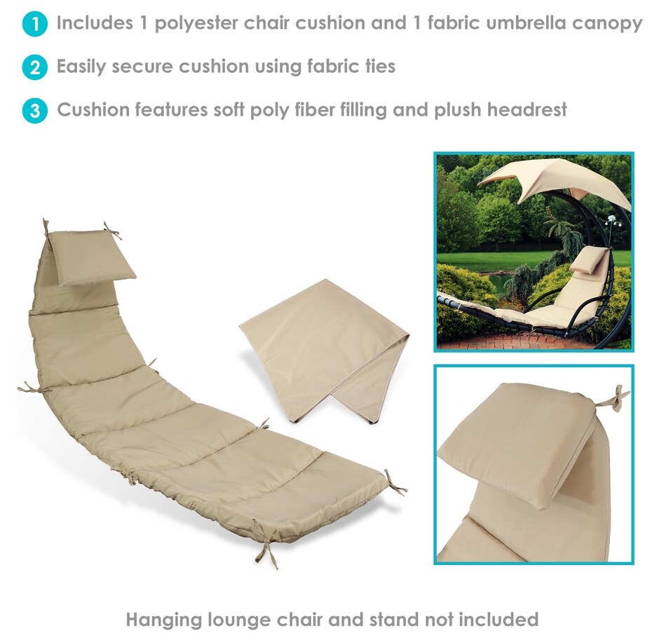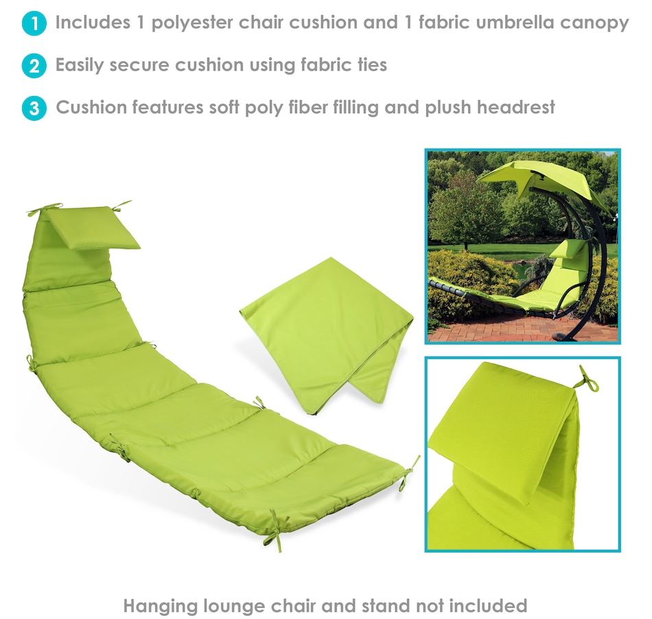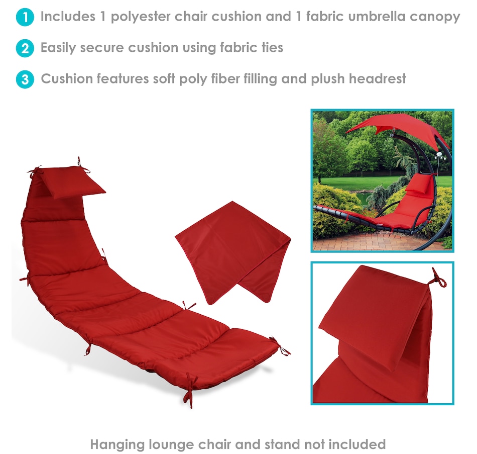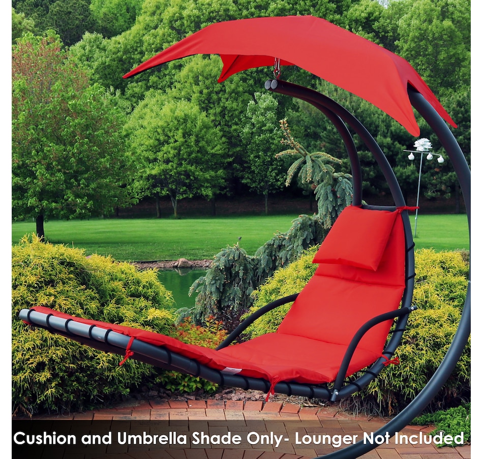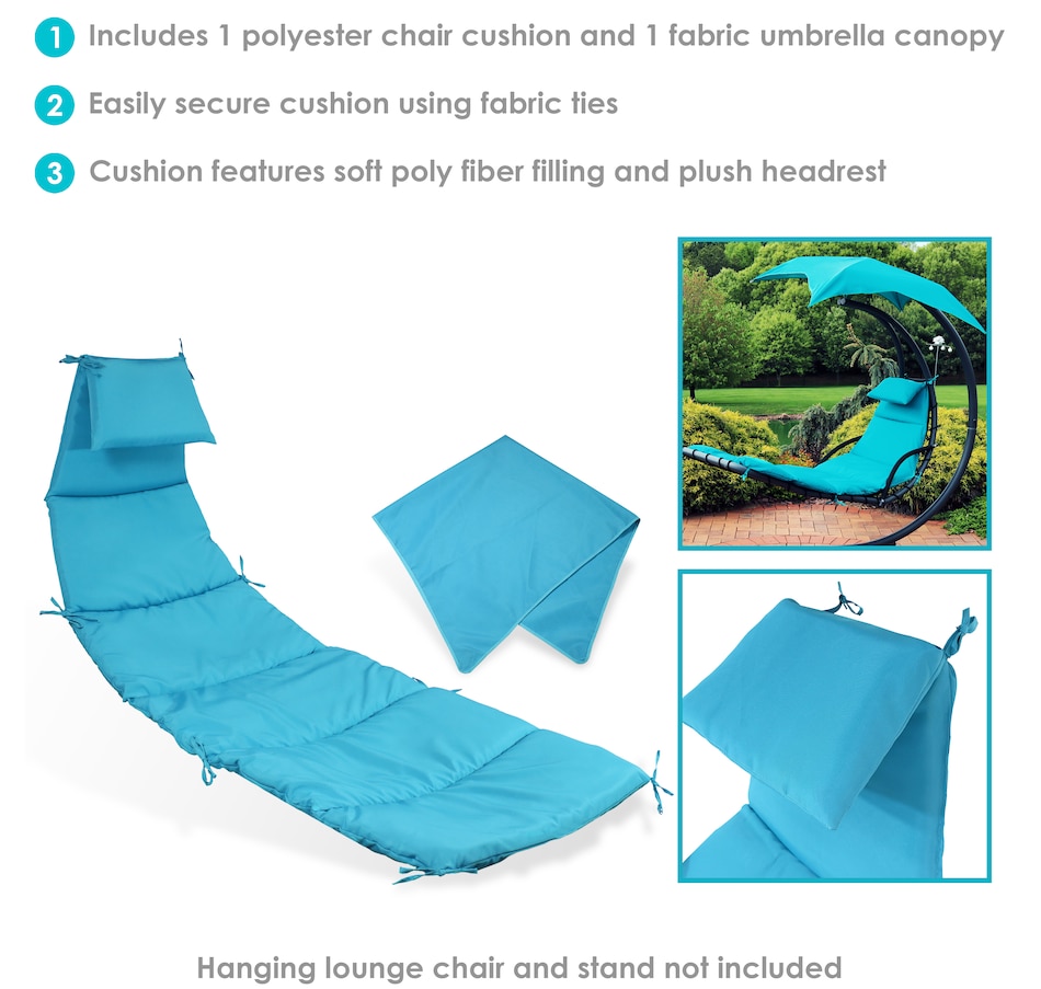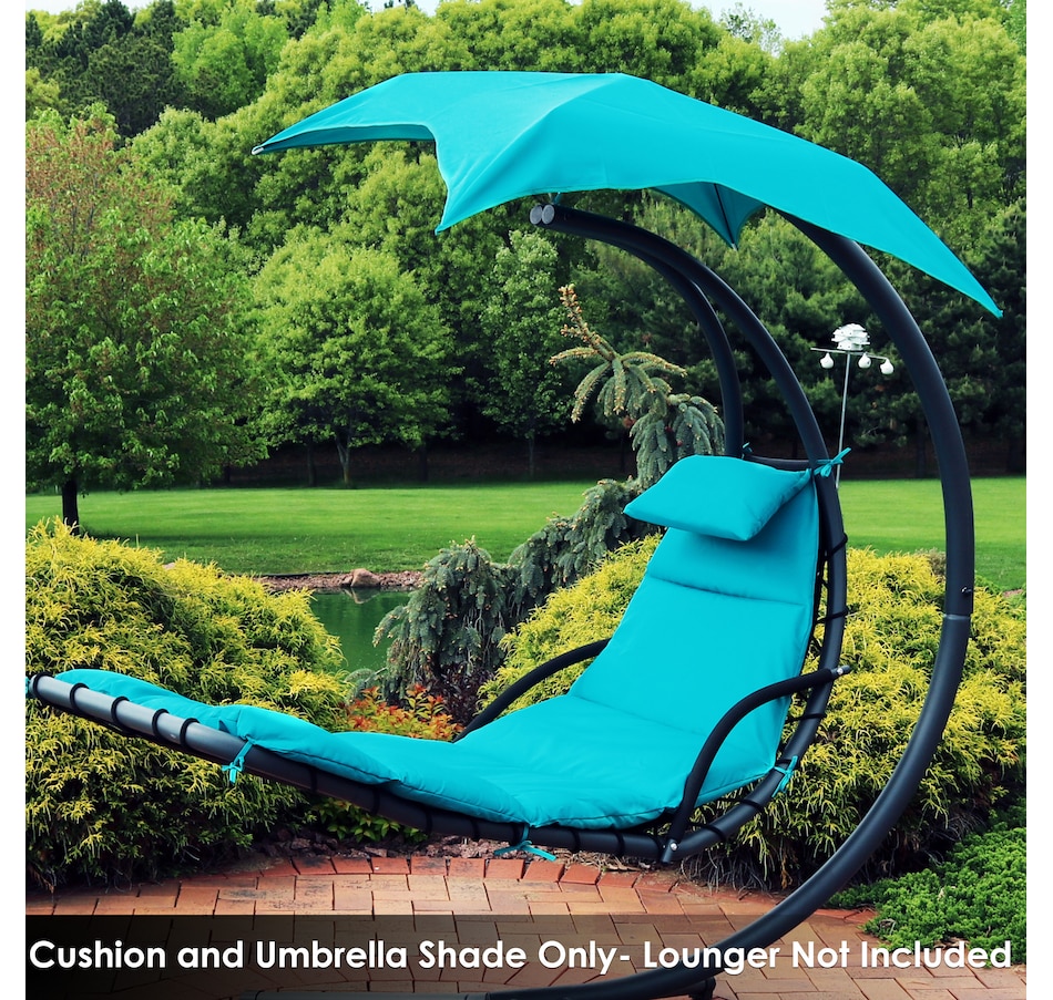Give an old hanging lounge chair new life with this replacement cushion and umbrella cover set. The cushion and umbrella fabric is resilient to withstand the outdoor elements and easy to clean and maintain. The cushion provides a comfortable place to lounge and relax on a hanging lounge chair frame. The umbrella cover is designed to be used with hanging lounge canopies that have a 4-spoke umbrella, as it has four places for the spokes to stay in place in each corner of the fabric. This set is great for replacing an old, worn cushion, or simply switching up the colors for a change. Available in many colors, there are options to give any outdoor patio a nice, bright pop of color, bring a complementary color to the existing decor aesthetic, or simply replace an old but loved cushions set.