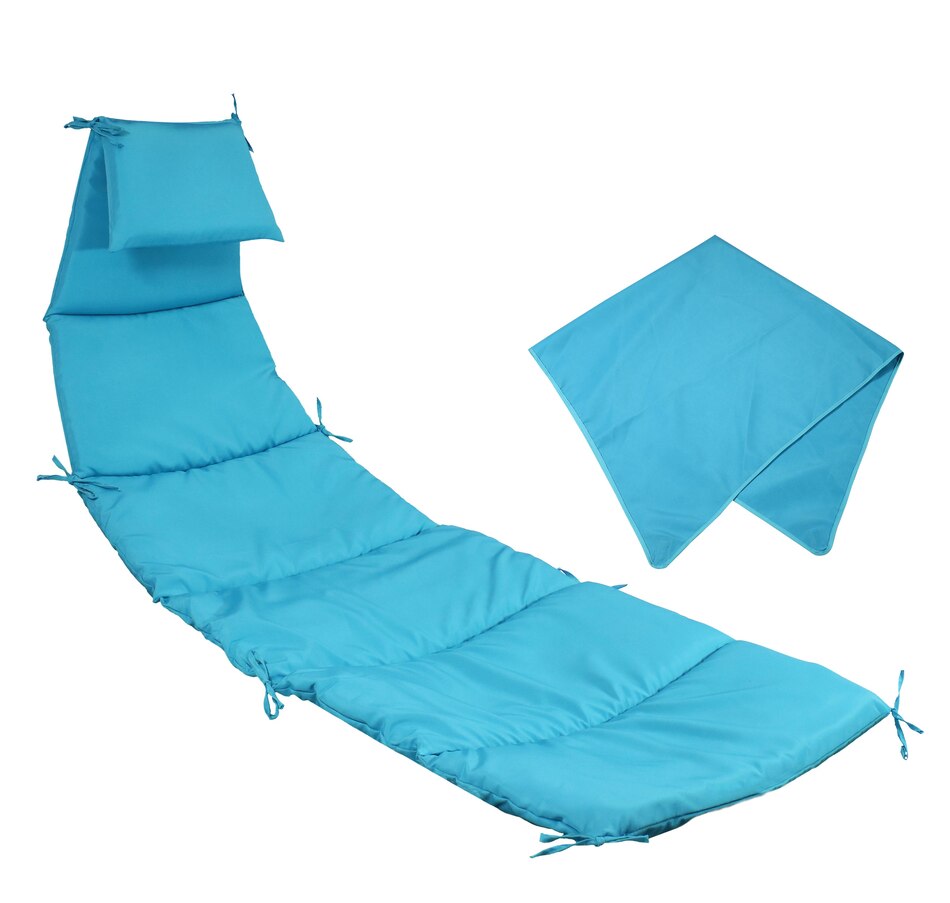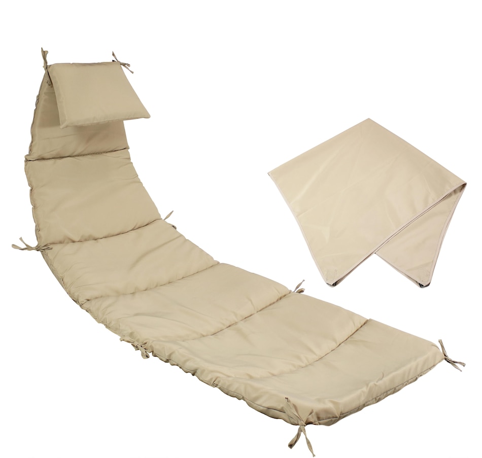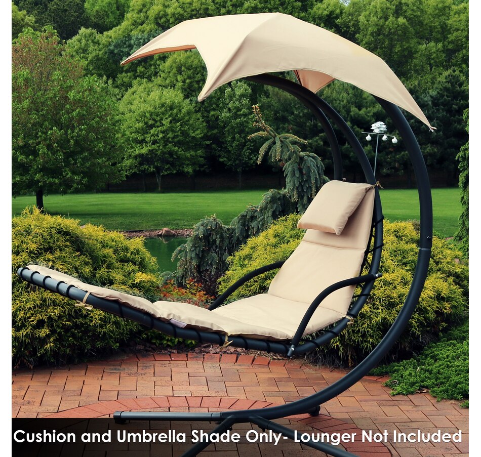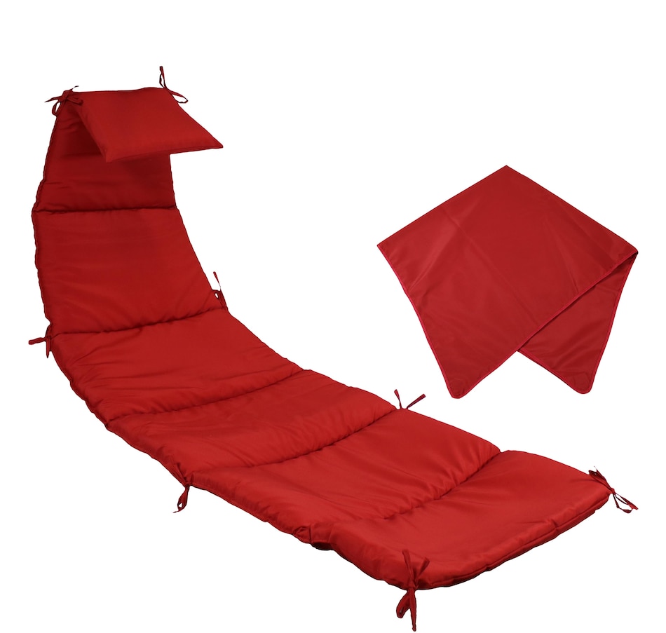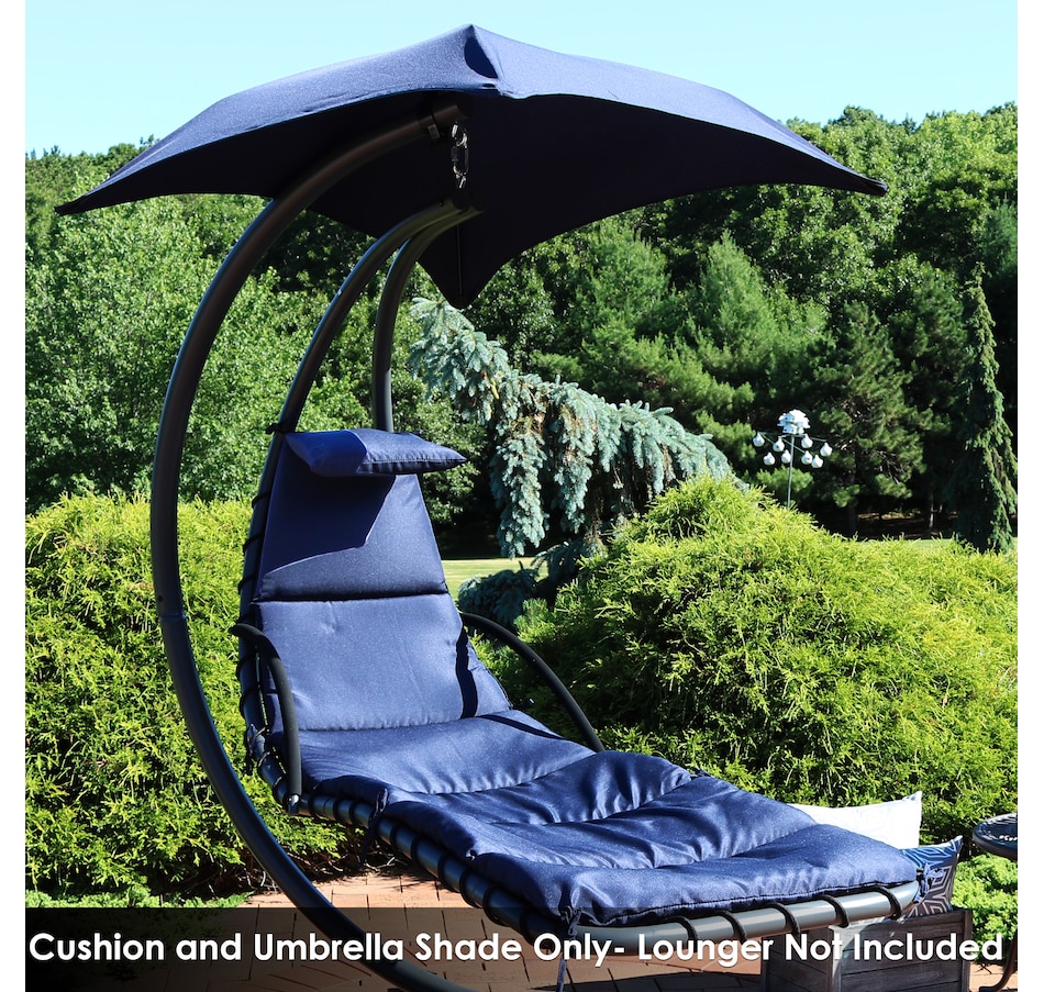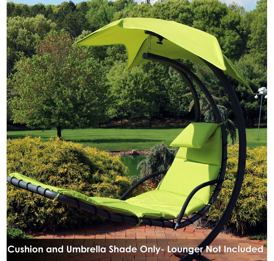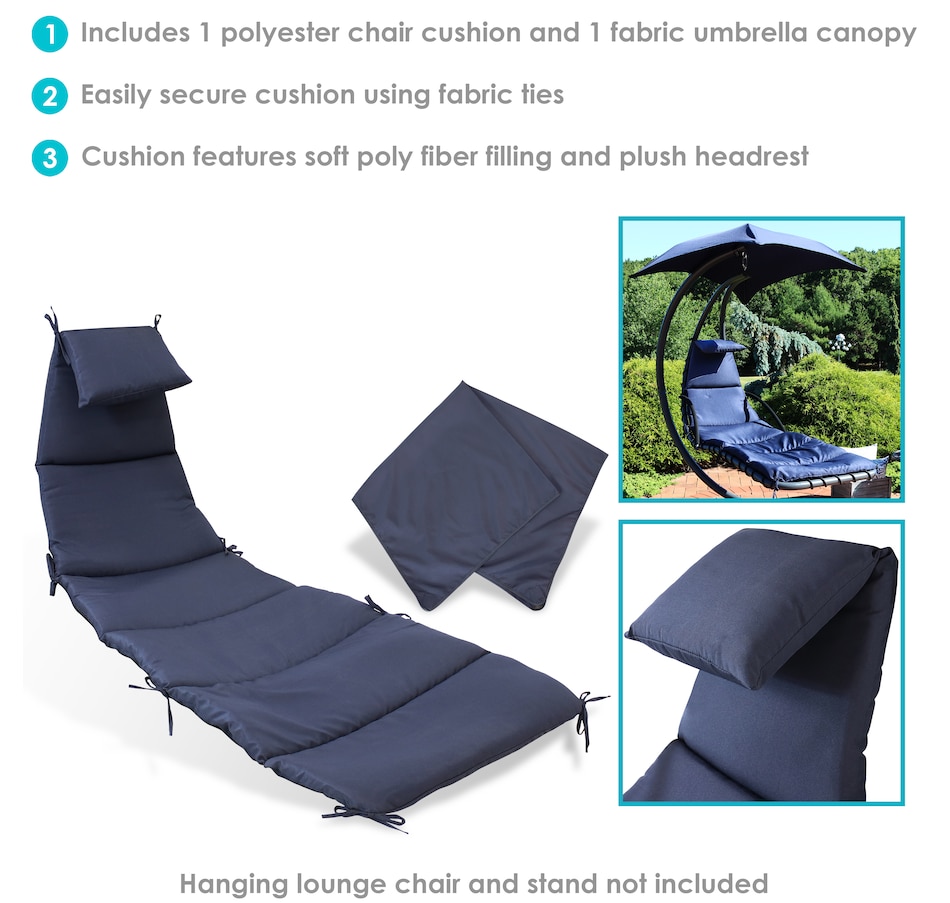 Give an old hanging lounge chair new life with this replacement cushion and umbrella cover set. The cushion and umbrella fabric is resilient to withstand the outdoor elements and easy to clean and maintain. The cushion provides a comfortable place to lounge and relax on a hanging lounge chair frame. The umbrella cover is designed to be used with hanging lounge canopies that have a 4-spoke umbrella, as it has four places for the spokes to stay in place in each corner of the fabric. This set is great for replacing an old, worn cushion, or simply switching up the colors for a change. Available in many colors, there are options to give any outdoor patio a nice, bright pop of color, bring a complementary color to the existing decor aesthetic, or simply replace an old but loved cushions set.