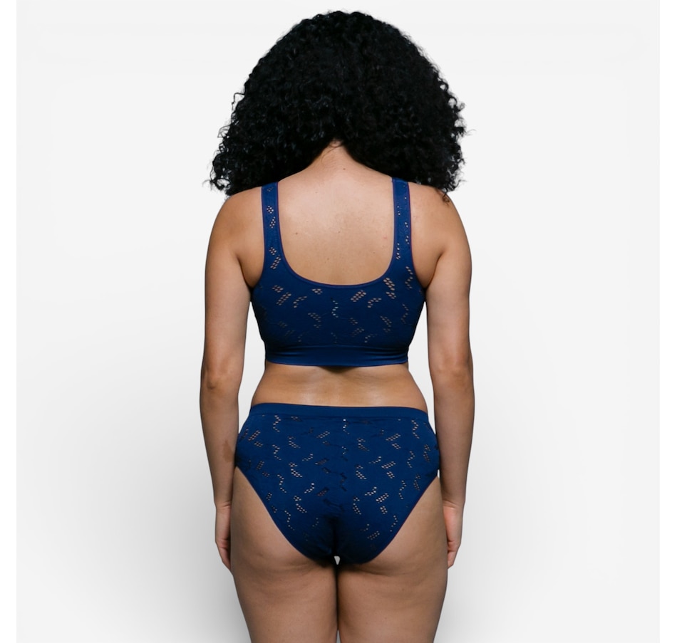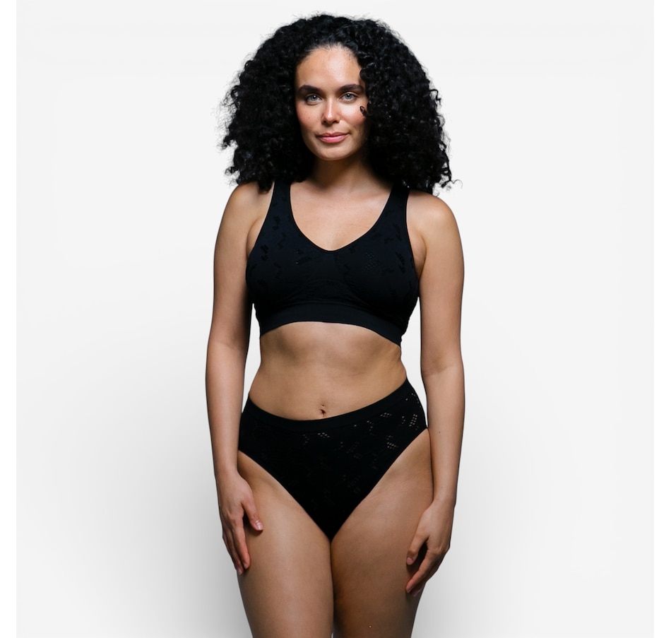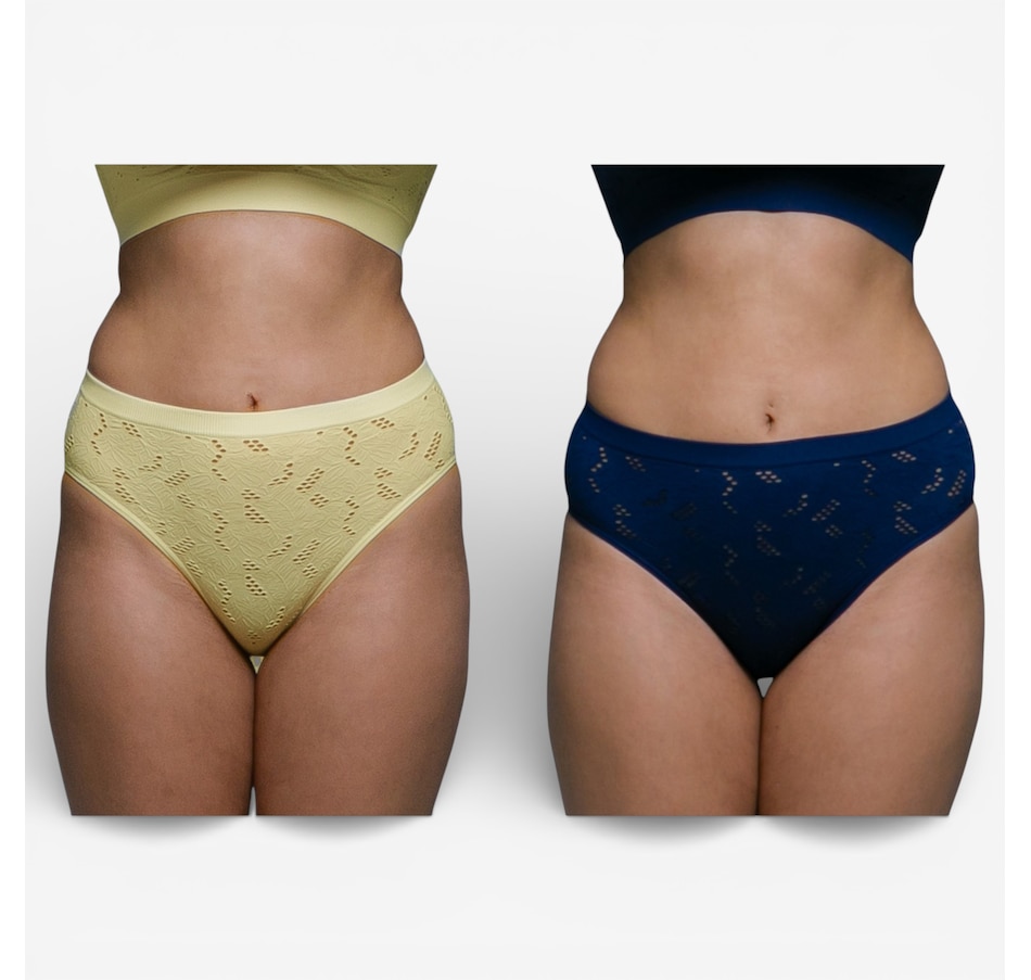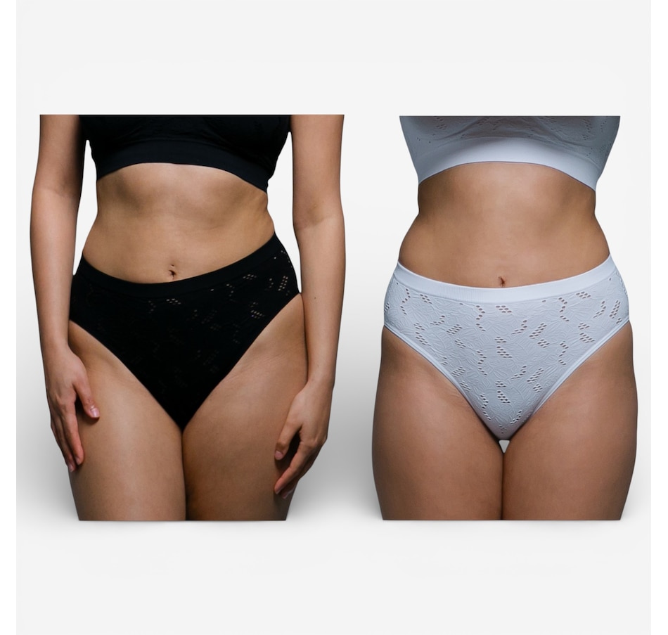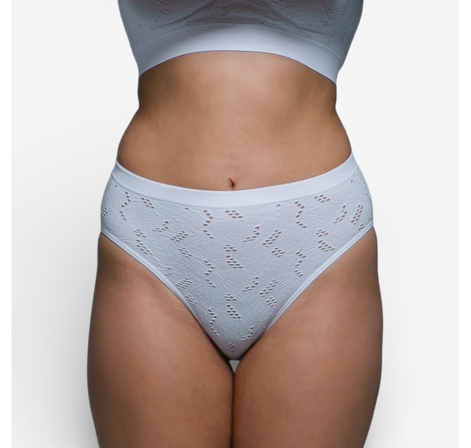 Enjoy soft stretch, feminine detail, and everyday confidence with the Rhonda Shear seamless lace crochet brief two‑pack. Designed with a delicate crochet pattern that creates airy, breathable texture, these briefs offer a fresh, stylish take on seamless comfort. The high‑cut leg opening flatters your natural shape, while the four‑way stretch construction provides a smooth, flexible fit that moves with you. A solid wide gusset adds comfort and practicality, and light control offers gentle smoothing without ever feeling restrictive.