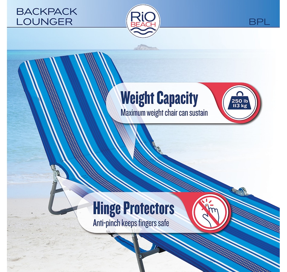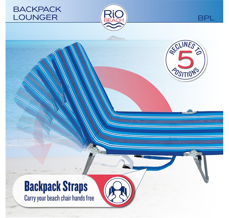 Rio’s versatile ratchet lounger carries like a backpack. Ideal for the beach or pool, it adjusts to multiple positions and lays flat for all-over sunning.