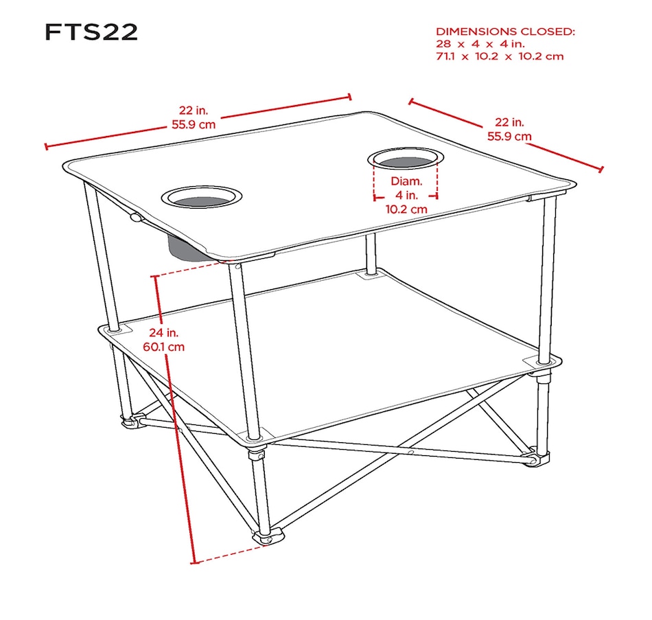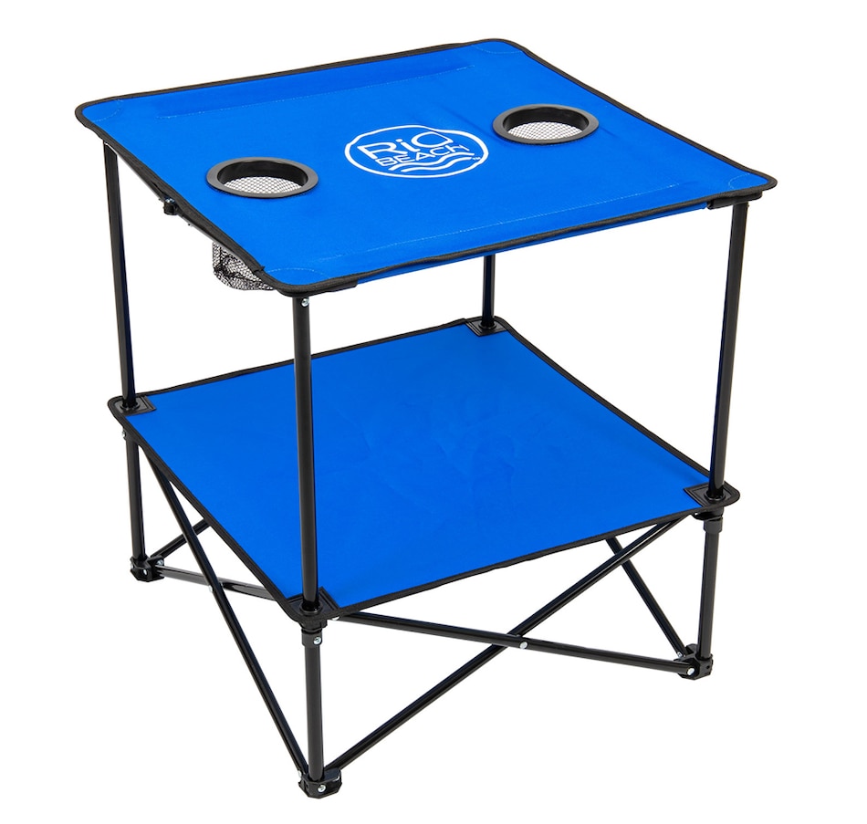 Enjoy family time in the sand with a portable compact folding beach table from Rio Beach. The base of the portable family beach table folds like a quad chair, and the fabric-covered tabletop snaps on and off for storage. The tabletop also has a tension frame for stability.