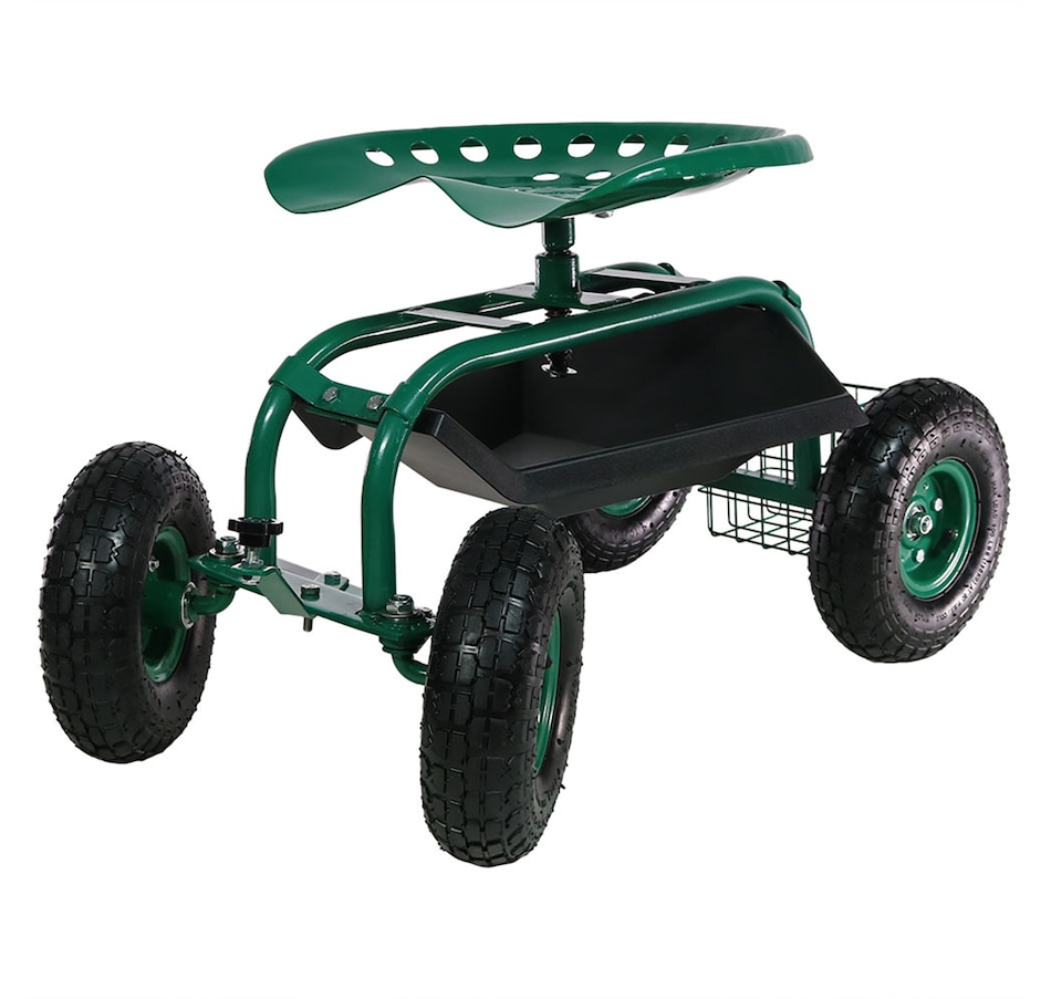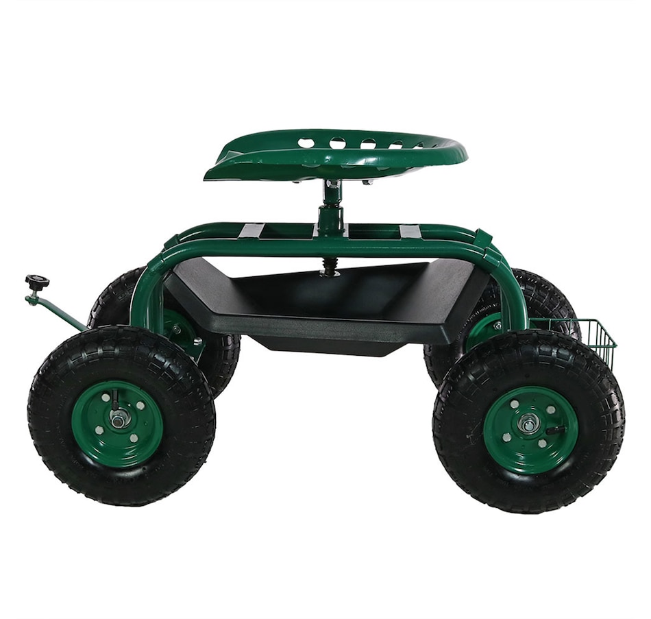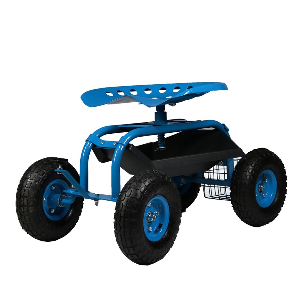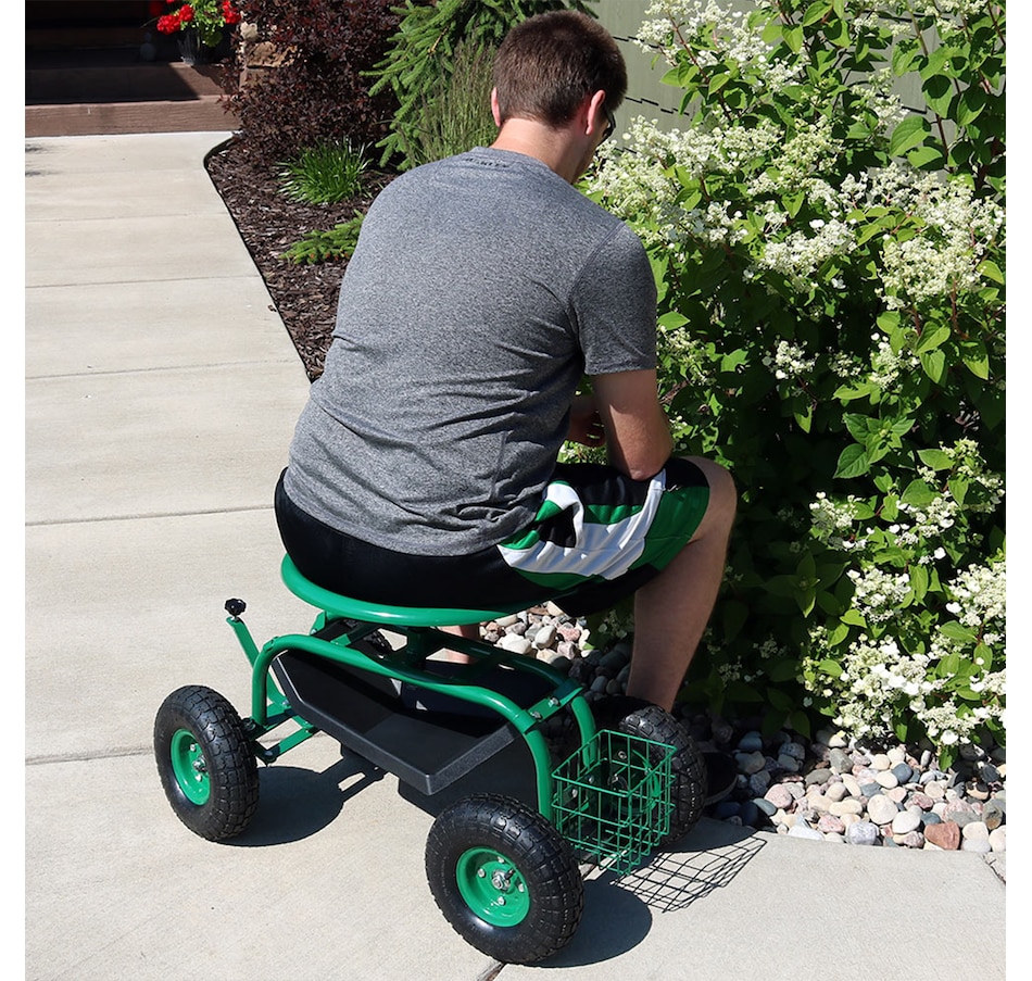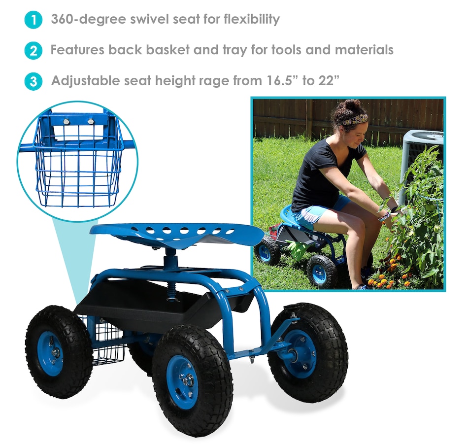 This garden stool for seniors is great for planting and gardening. Use this rolling garden seat while working in the yard to alleviate back strain or to take a well-deserved seat whenever needed. With a seat height range of 16.5 inches to 22 inches, a steel wire basket on the side for tools, and a black plastic tray underneath the seat, roll through any gardening or landscaping job with ease, comfort, and purpose! Use this gardening seat for work in the yard, lawn, farm, garage, shed, warehouse, or any other workspace where this garden scooter can thrive. Finish the landscaping jobs in half the time: this cart is made to last, boasting a heavy-duty, powder-coated steel frame and steering handle, as well as pneumatic tires. This rolling garden stool will resist the elements outdoors.