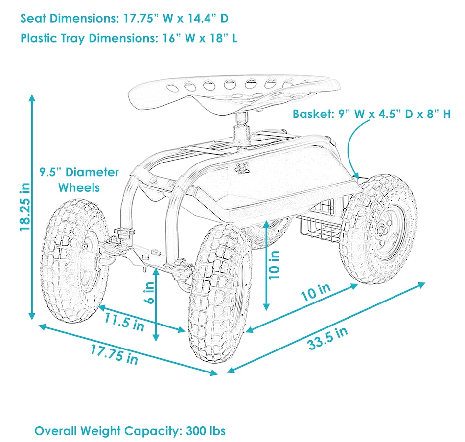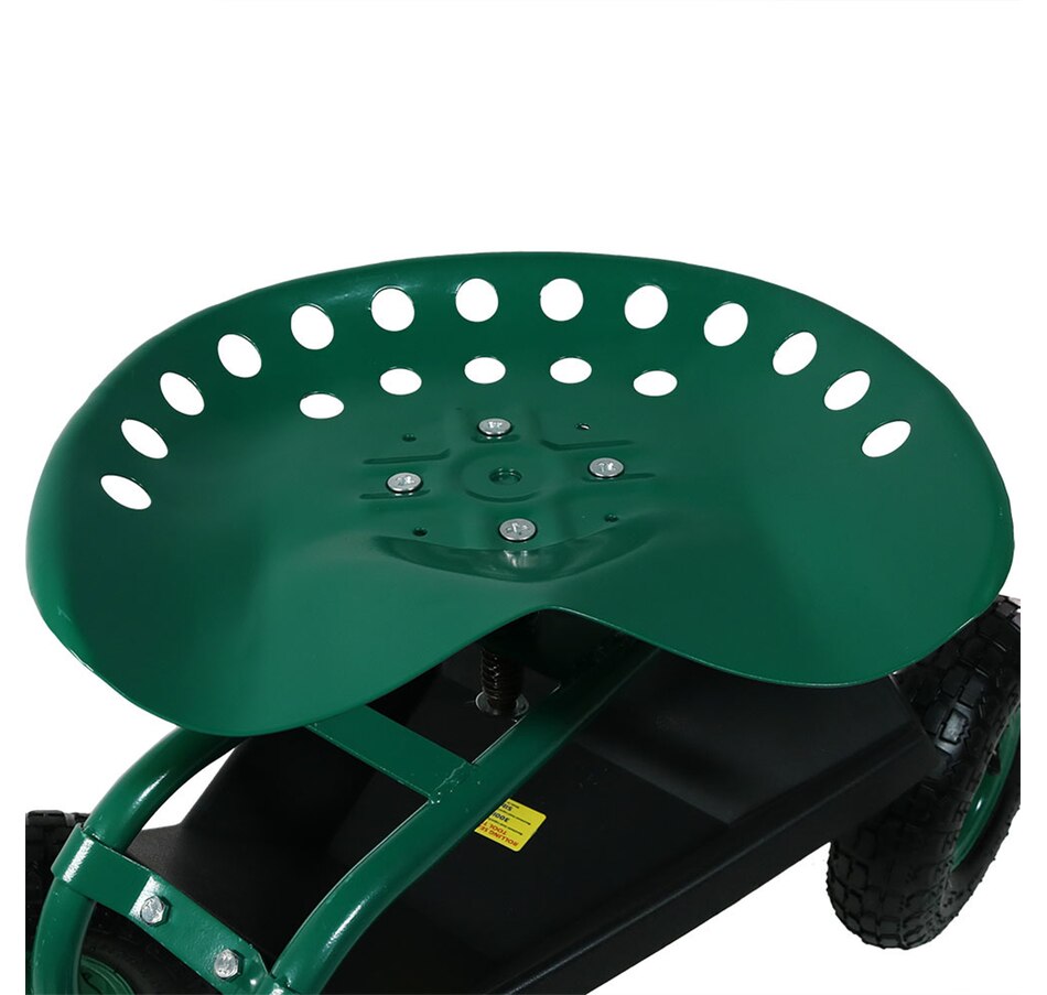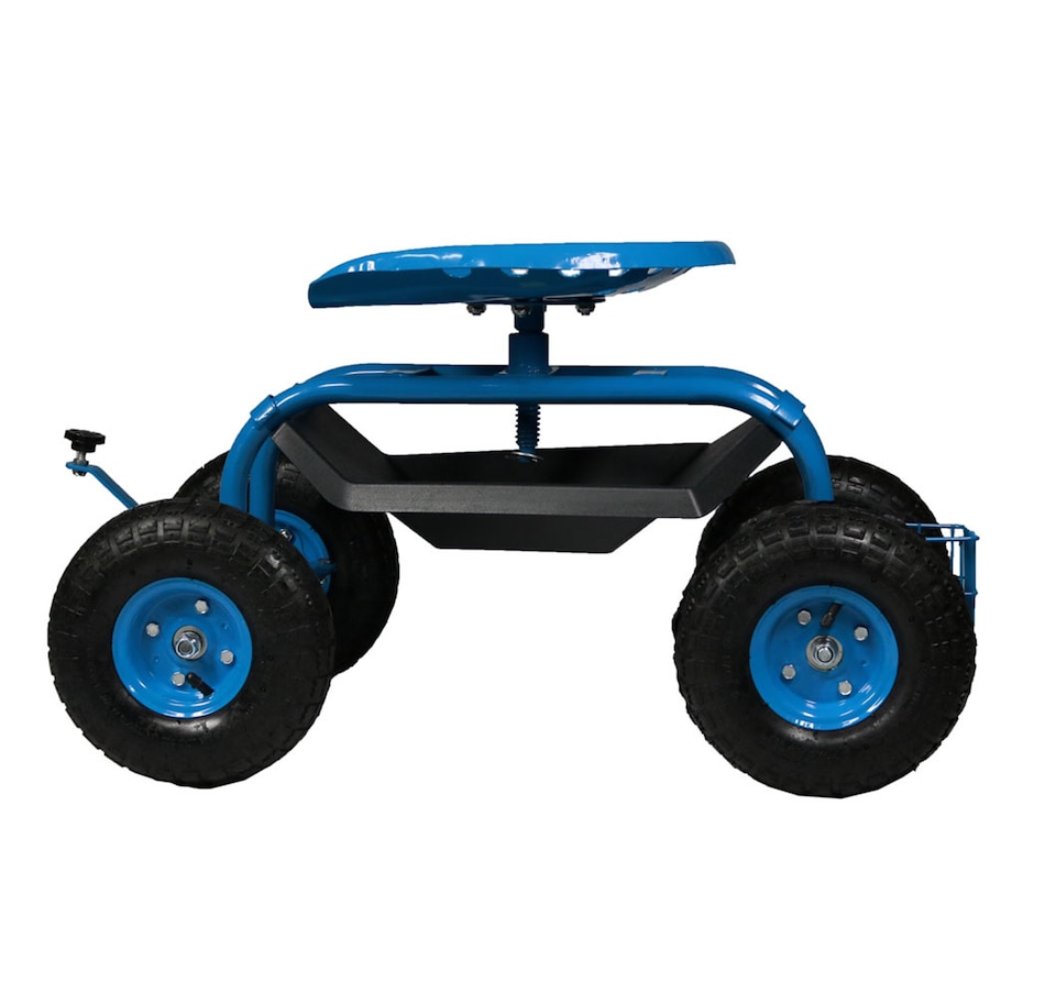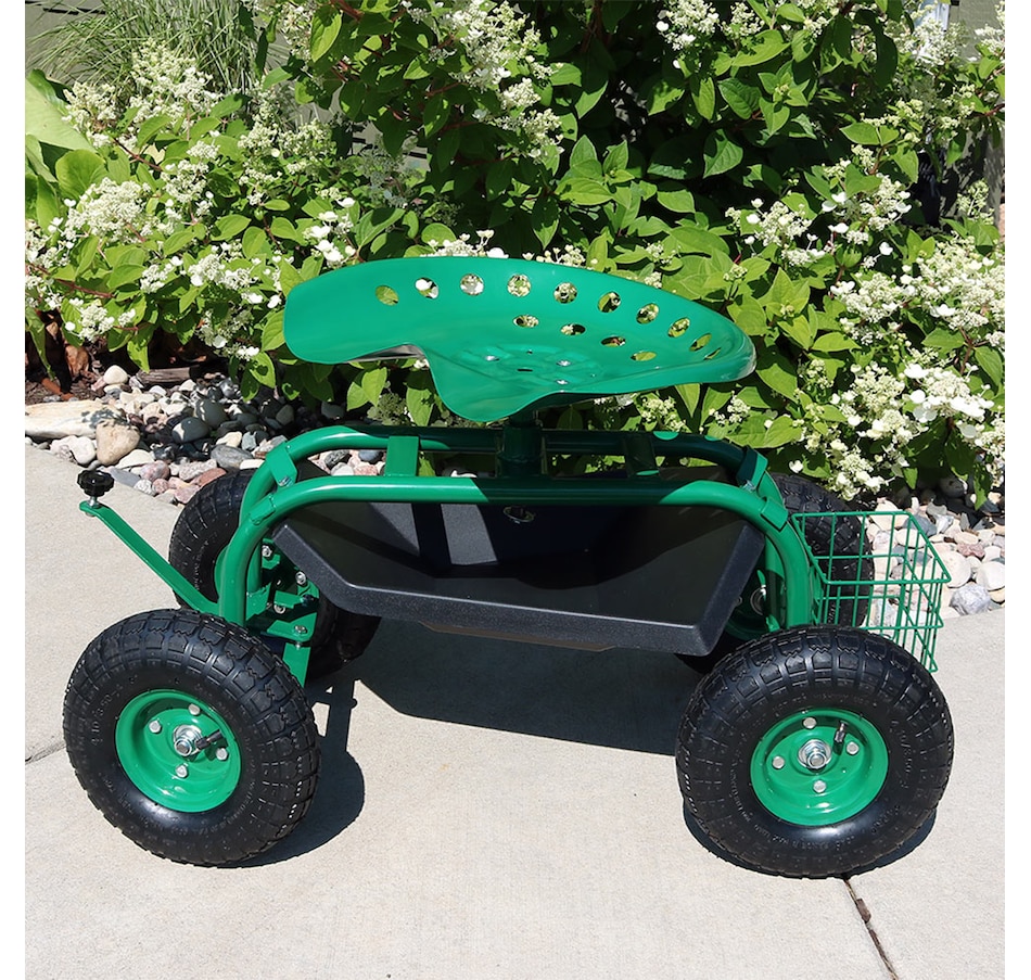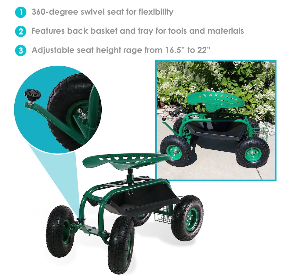 This garden stool for seniors is great for planting and gardening. Use this rolling garden seat while working in the yard to alleviate back strain or to take a well-deserved seat whenever needed. With a seat height range of 16.5 inches to 22 inches, a steel wire basket on the side for tools, and a black plastic tray underneath the seat, roll through any gardening or landscaping job with ease, comfort, and purpose! Use this gardening seat for work in the yard, lawn, farm, garage, shed, warehouse, or any other workspace where this garden scooter can thrive. Finish the landscaping jobs in half the time: this cart is made to last, boasting a heavy-duty, powder-coated steel frame and steering handle, as well as pneumatic tires. This rolling garden stool will resist the elements outdoors.