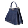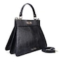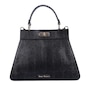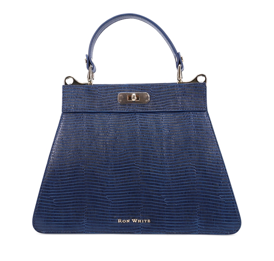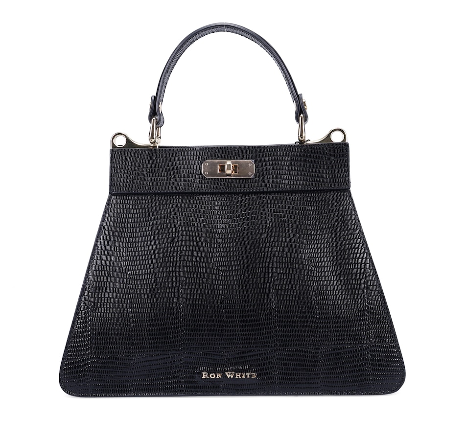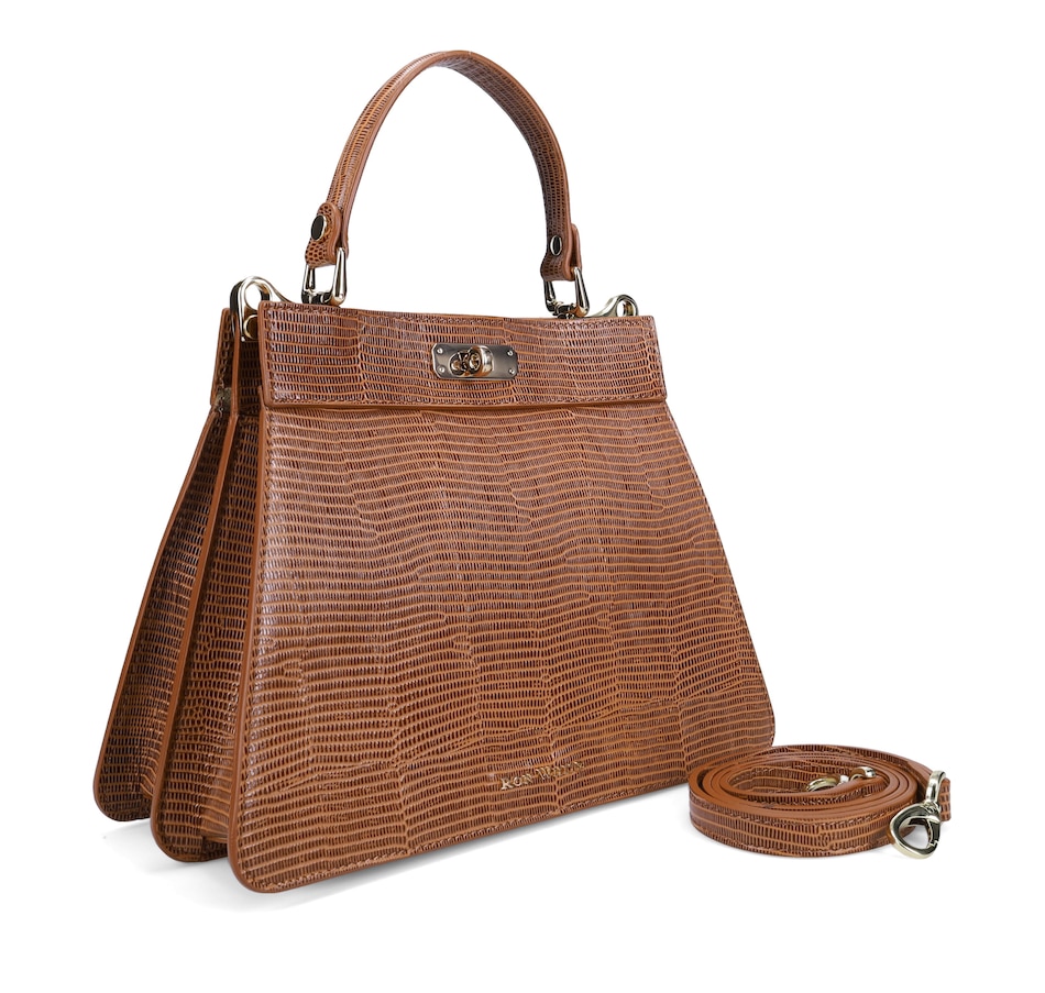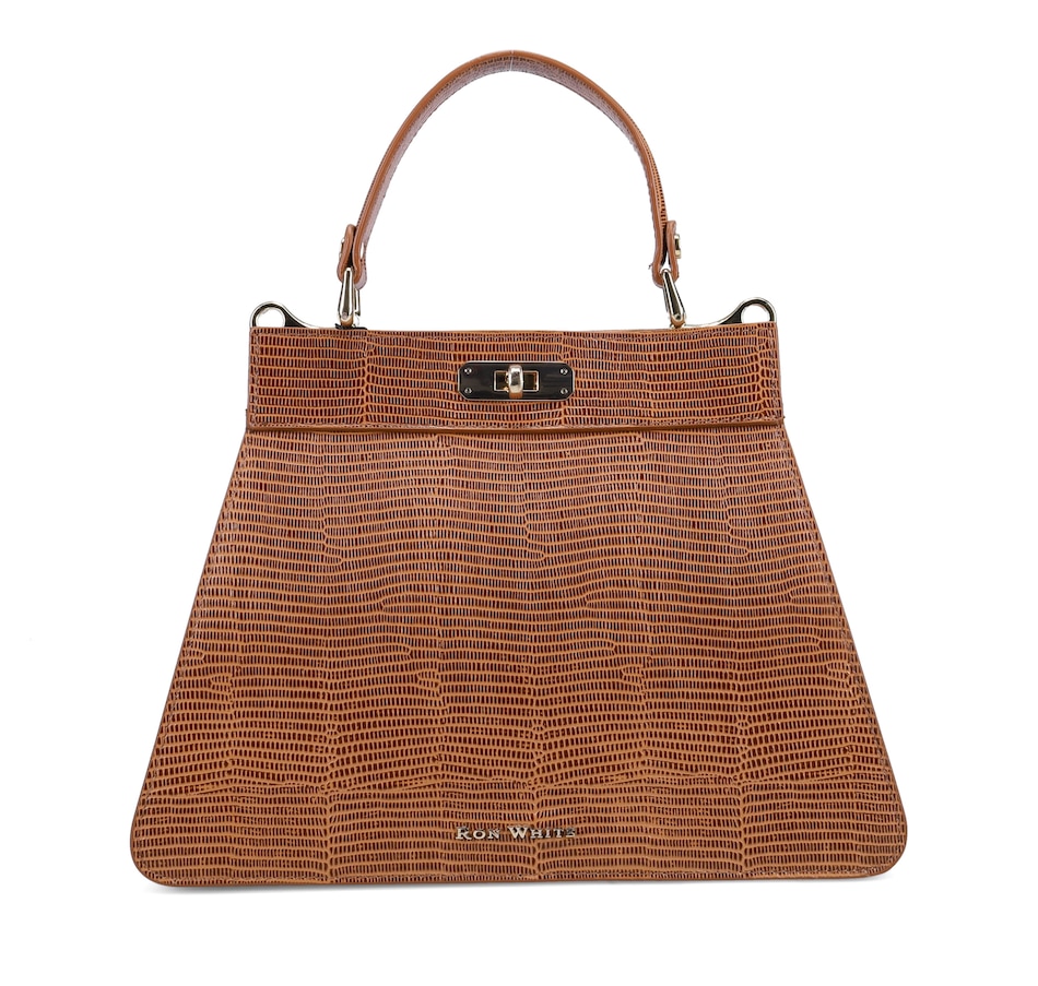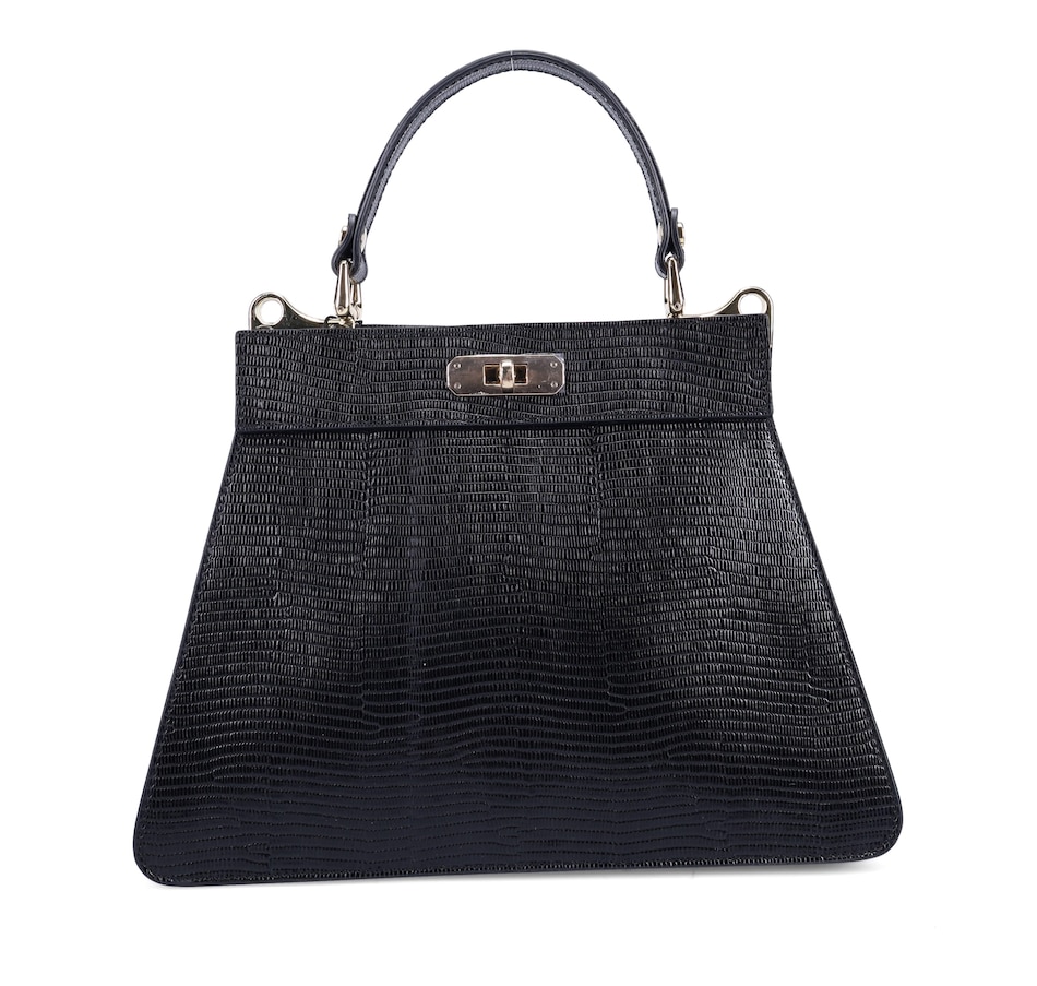 Duchess Liz Structured Handbag in Lizard Printed Calf. Jewelry Grade Platino Hardware. Two main sections with unique dual lock closure. Made in Italy.