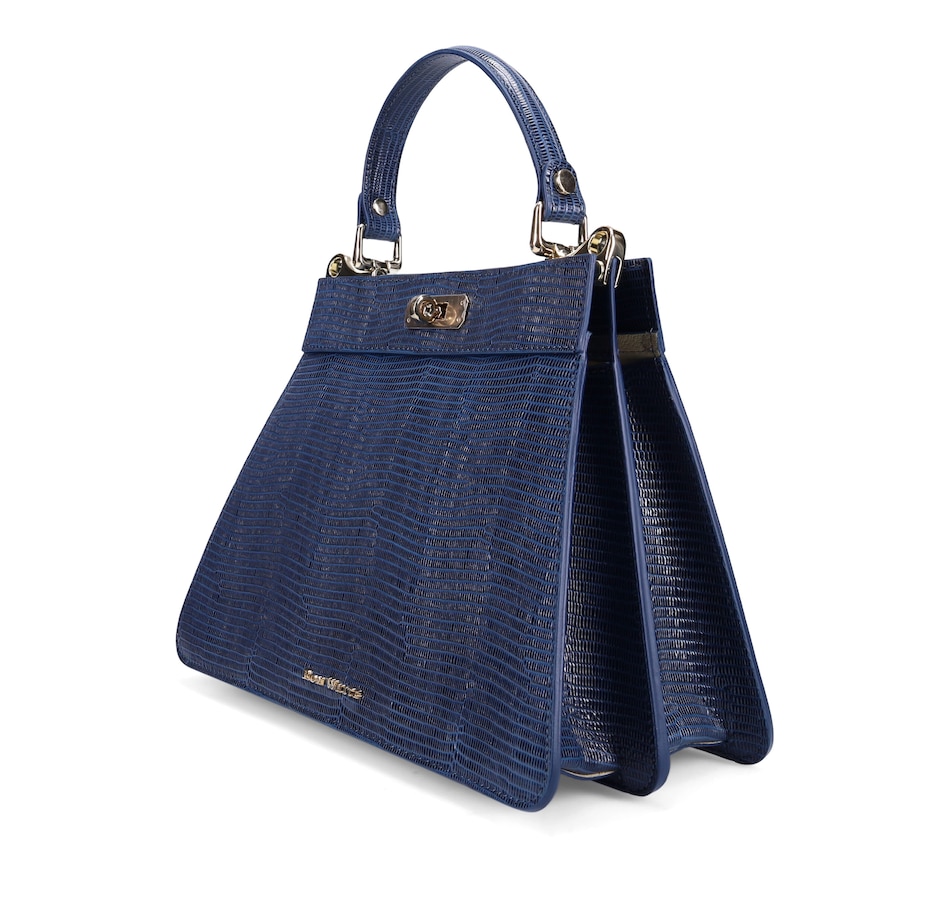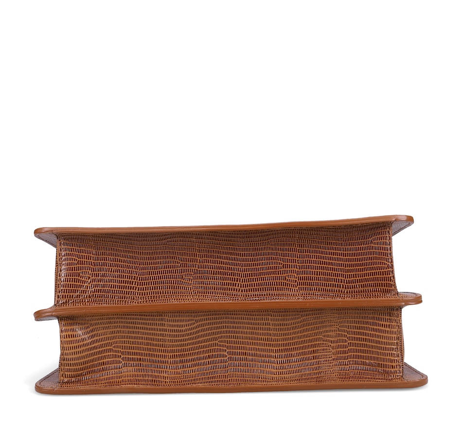 The Duchess Liz is an elegant structured handbag crafted in lizard-printed calf leather, offering a distinctive texture and a refined silhouette. This top-handle style is designed for sophistication and function, featuring a smart, double-compartment