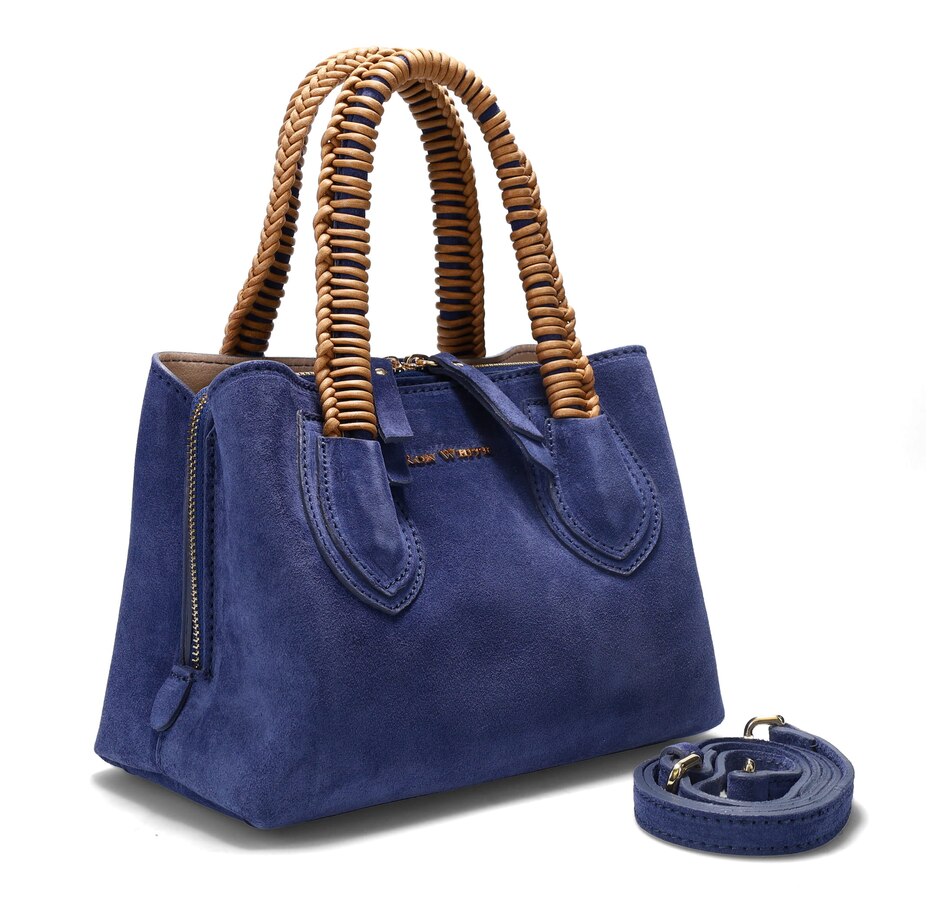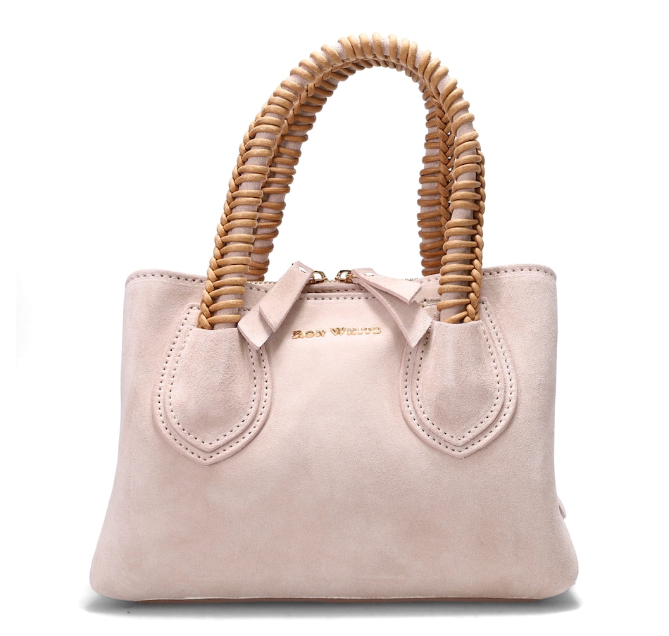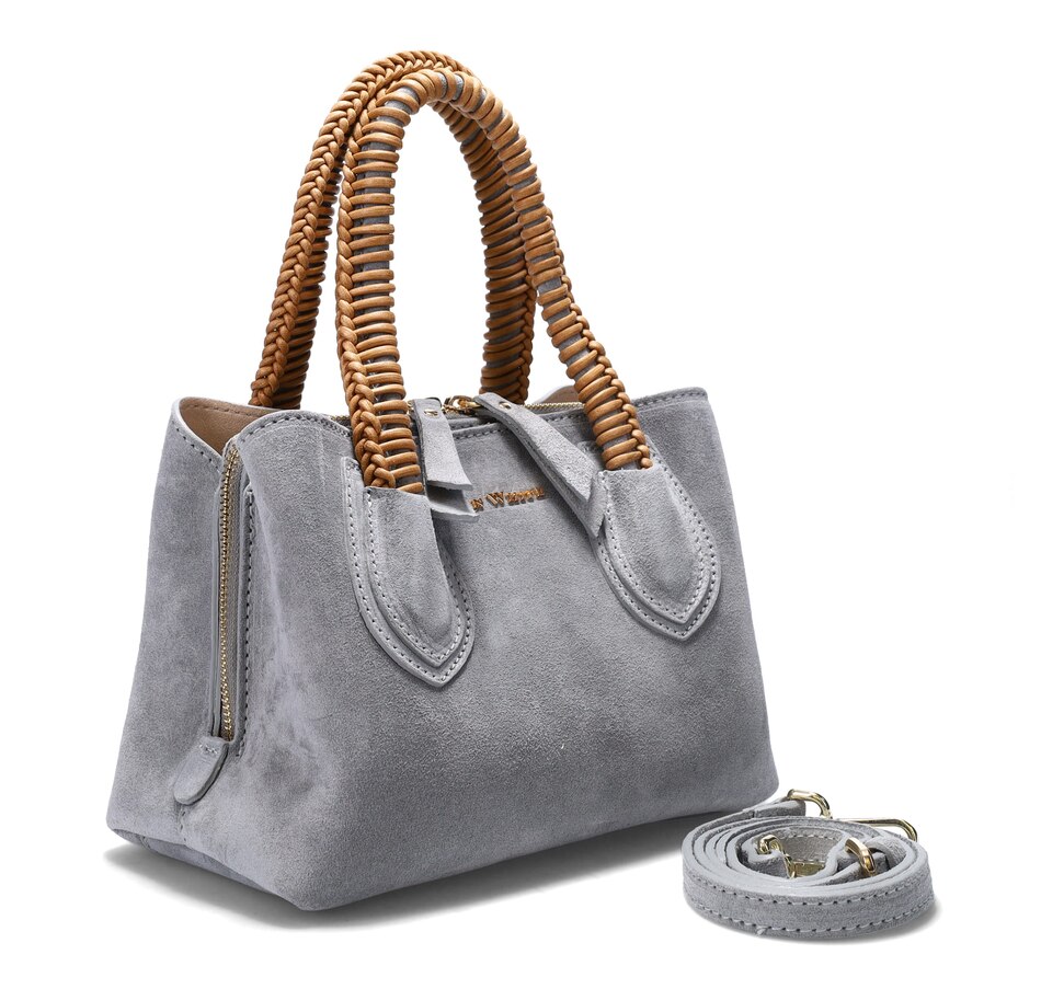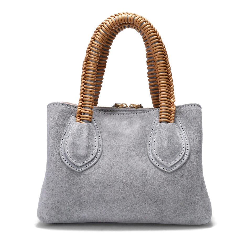 Dunbar Structured Bag in Plush Suede with Raffia Wrapped Handle. Jewelry Grade Platino Hardware. Middle Compartment with Two-Way Zip. Made in Italy.