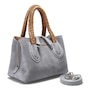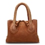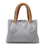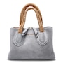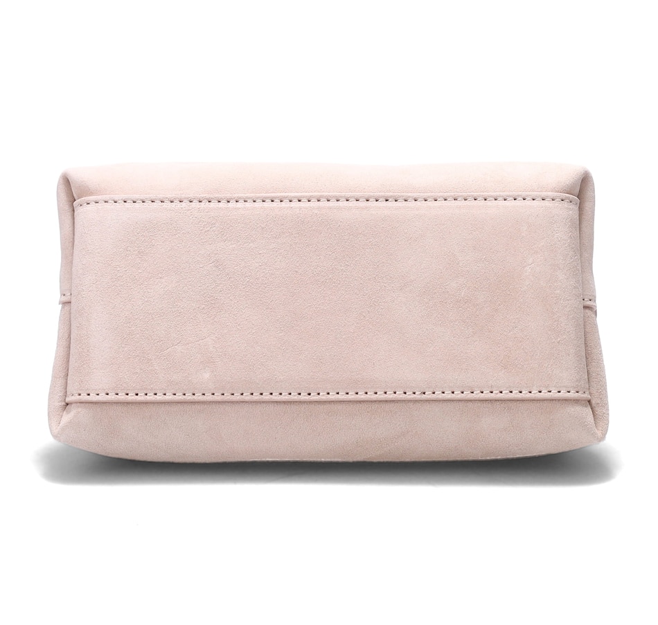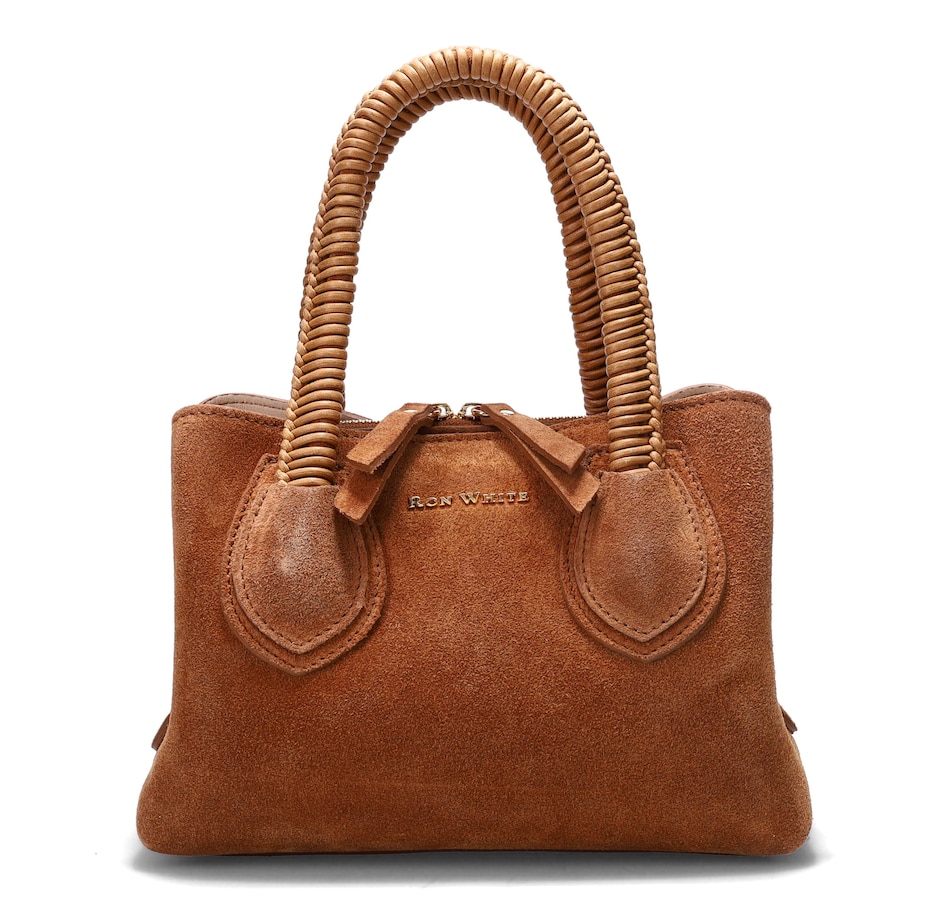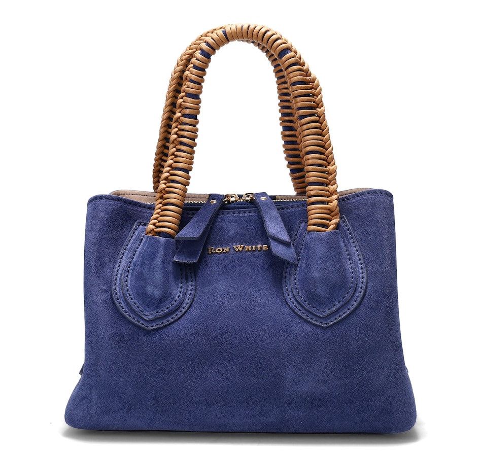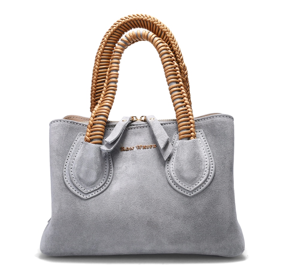 Dunbar Structured Bag in Plush Suede with Raffia Wrapped Handle. Jewelry Grade Platino Hardware. Middle Compartment with Two-Way Zip. Made in Italy.