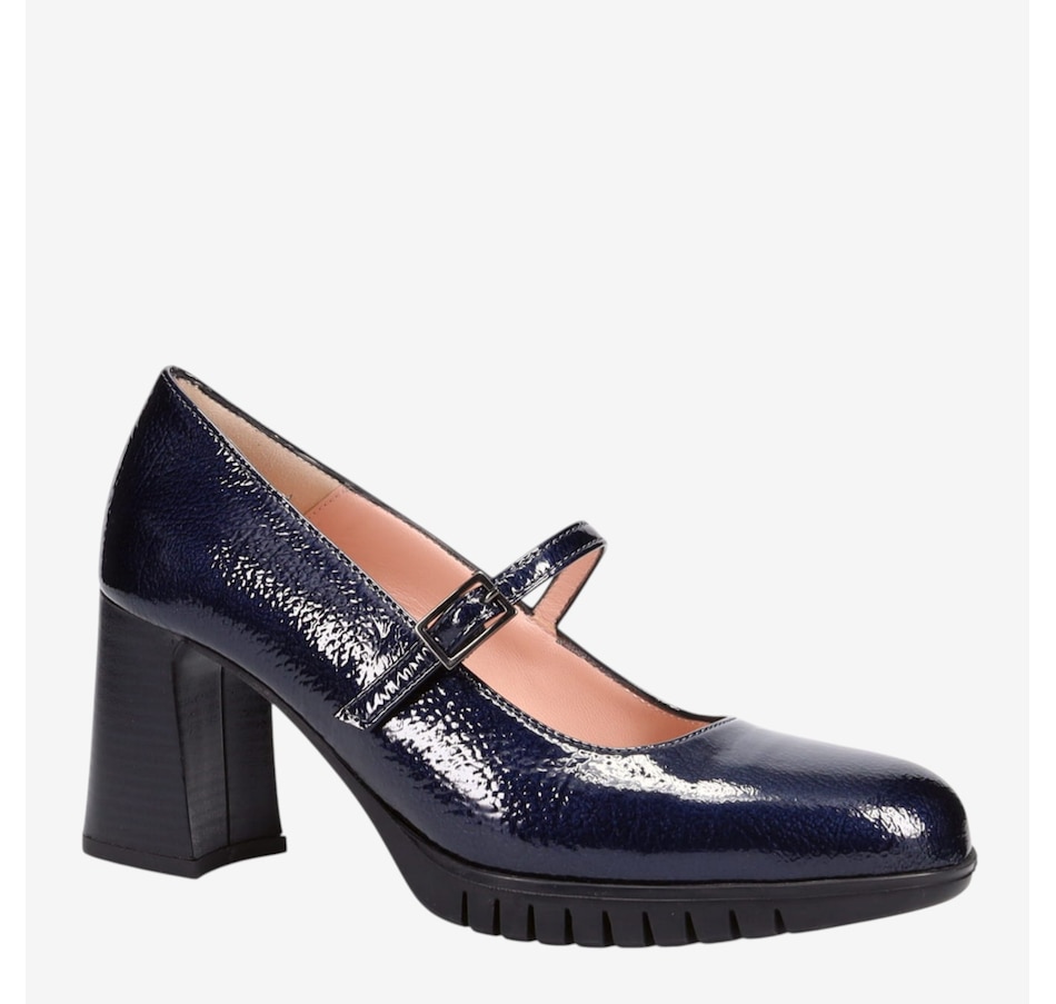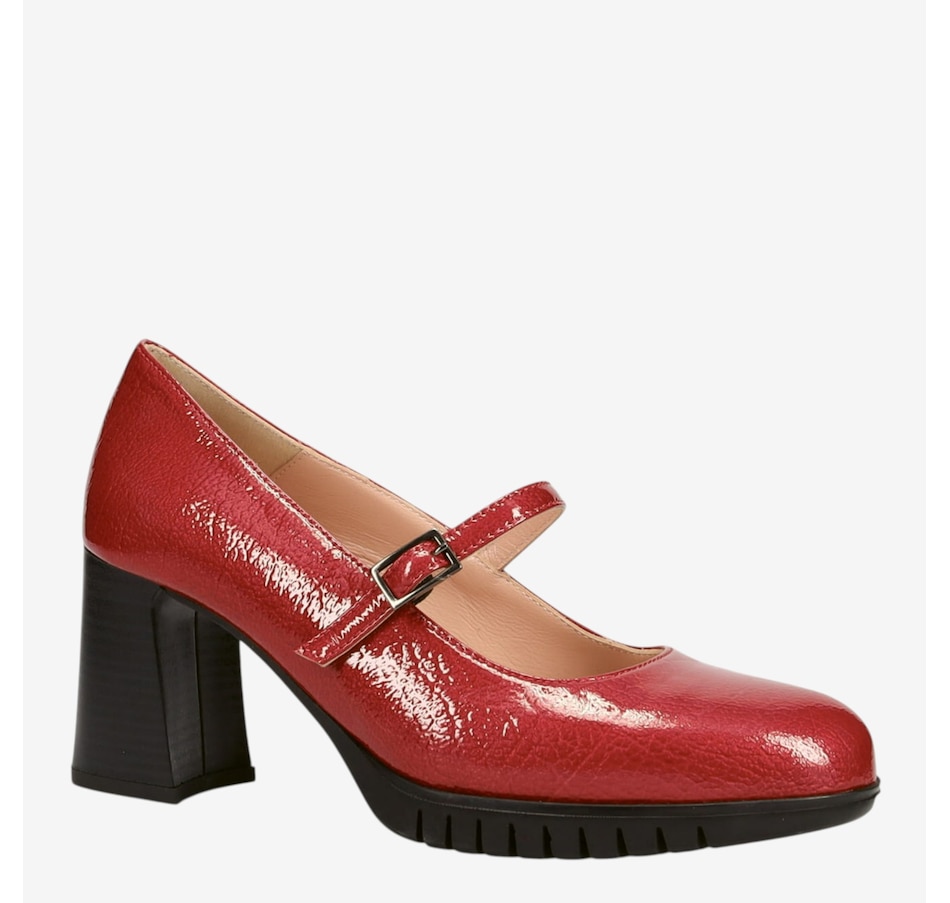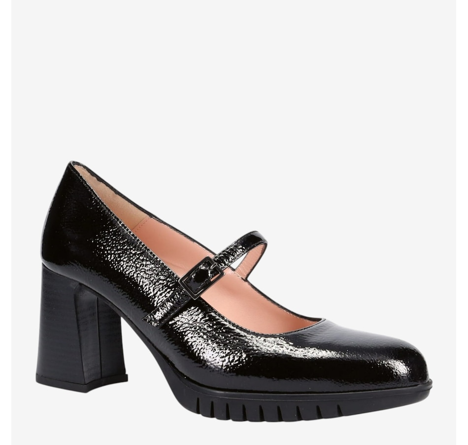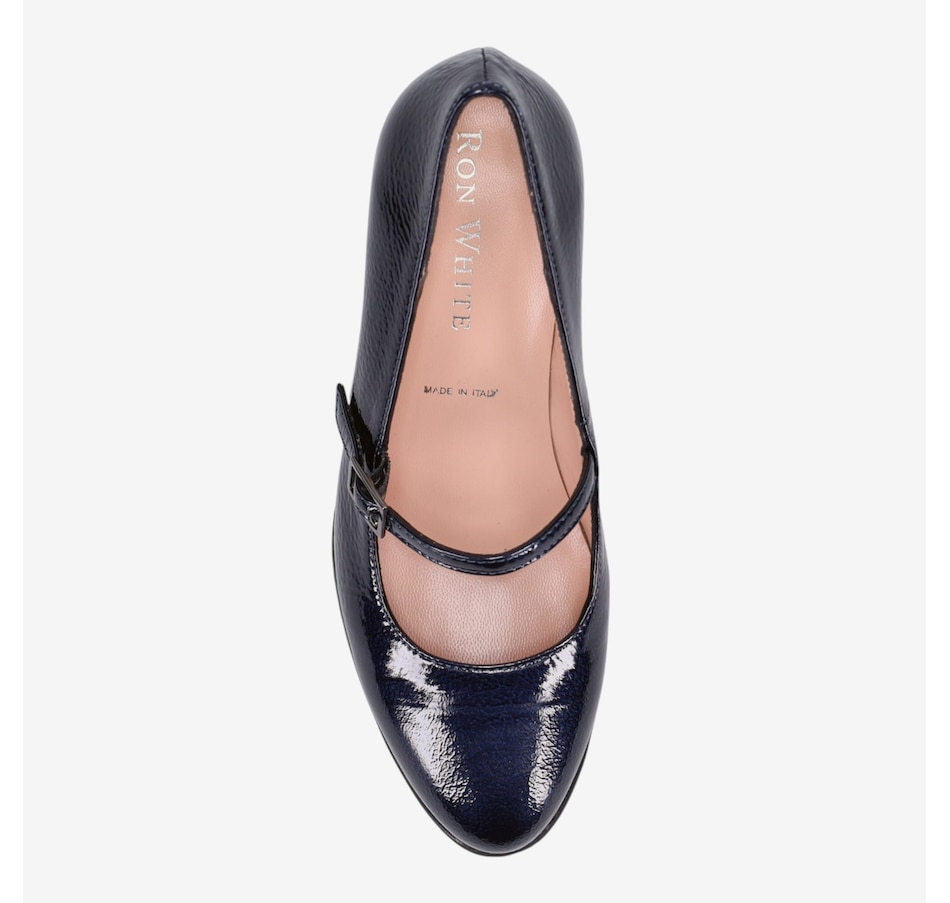Felisha Patent Maryjane Pump in Soft Textured Patent. Adjustable Ankle strap with Buckle. Unique 4 mm Pillow Cushioning. Anti-Slip Rubber Sole. Weatherproof. Made in Italy.