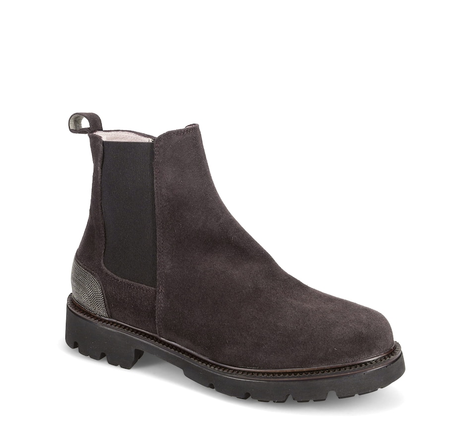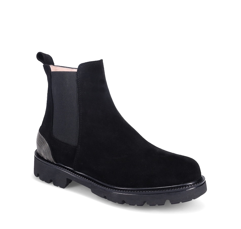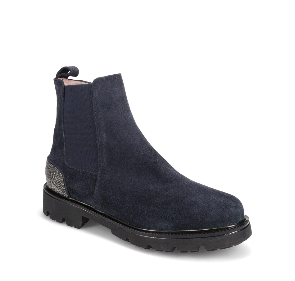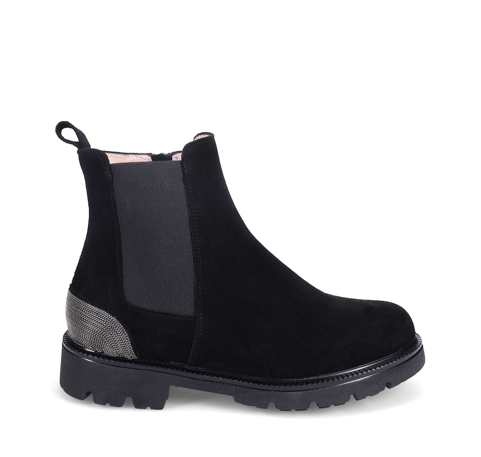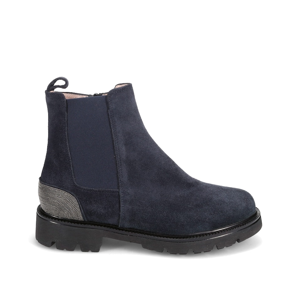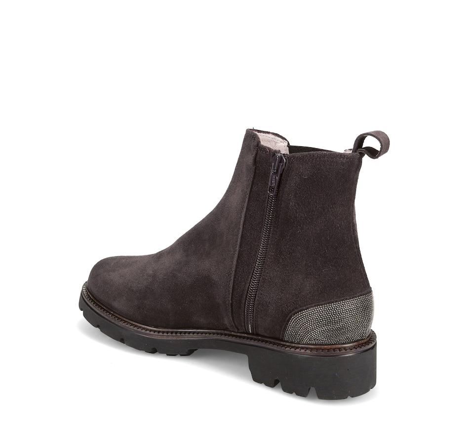Gema Ankle Boot in Suede. Metallic Chain Detail. Inside Zipper. Unique 4mm Pillow Cushioning. Anti-Slip Rubber Sole. Made in Italy.