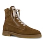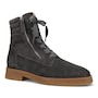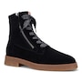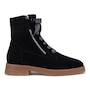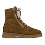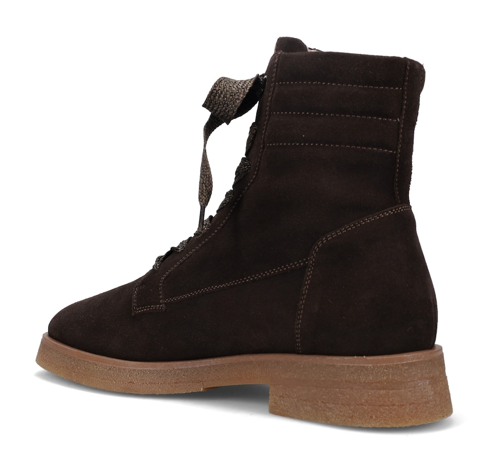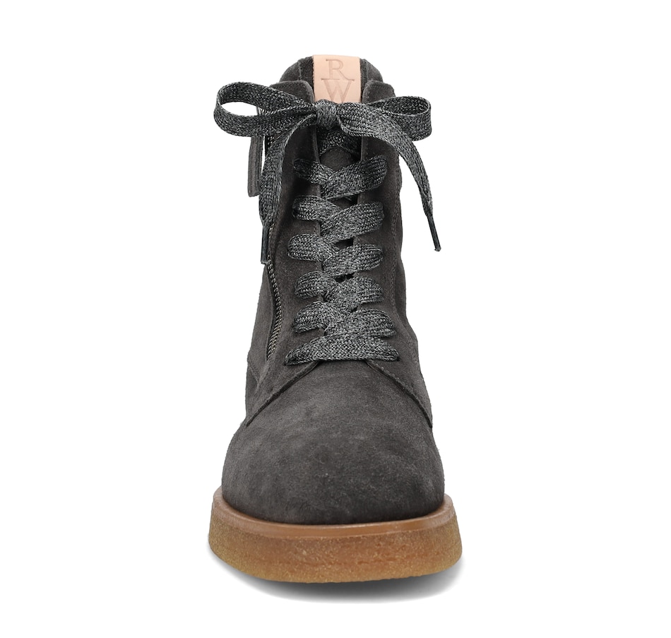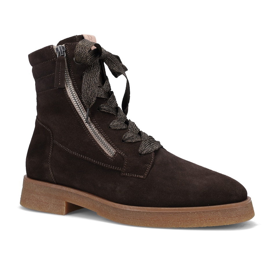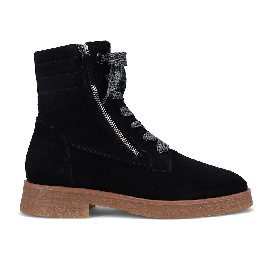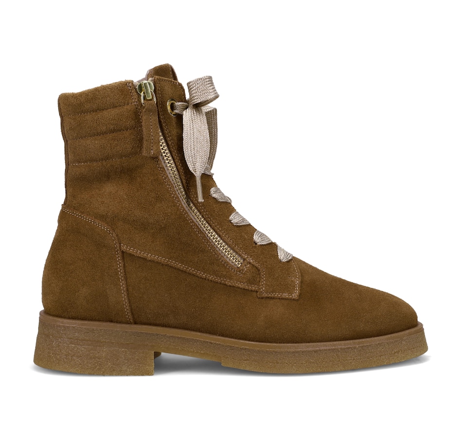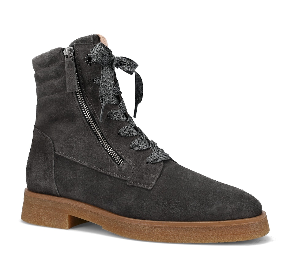 Hayley Ankle Boot in Weatherproof Suede. Functioning Laces with Outside Zipper. Fully Removable Footbed with Arch Support. Anti-Slip Rubber Outsole. Made in Italy.