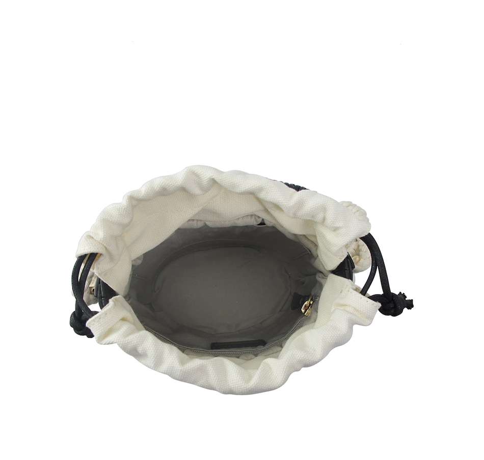 Lipori Bucket Bag in Silky Smooth Calf and Canvas. Jewelry Grade Platino Hardware. Leather Wrapped Rope Handle. Drawstring Closure. Made in Italy.