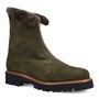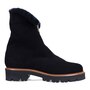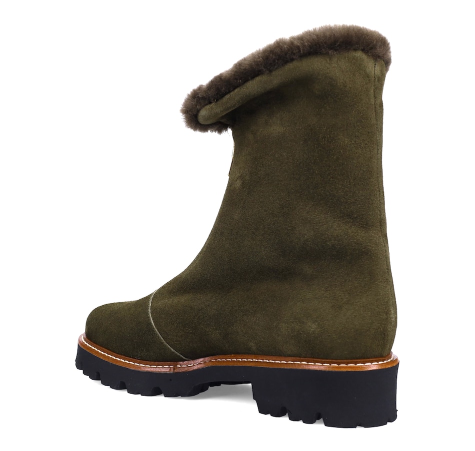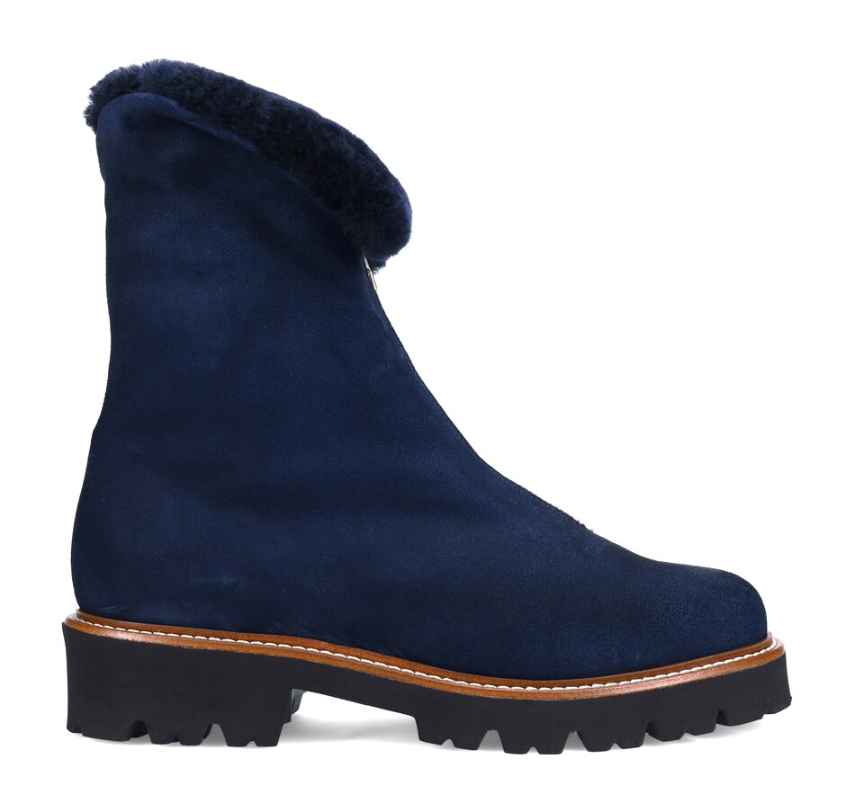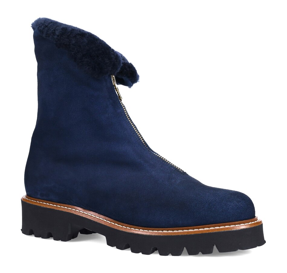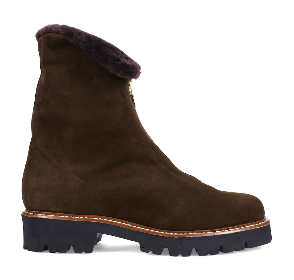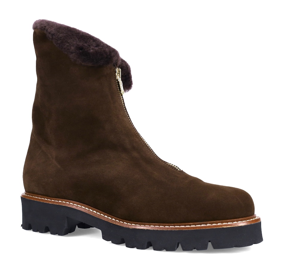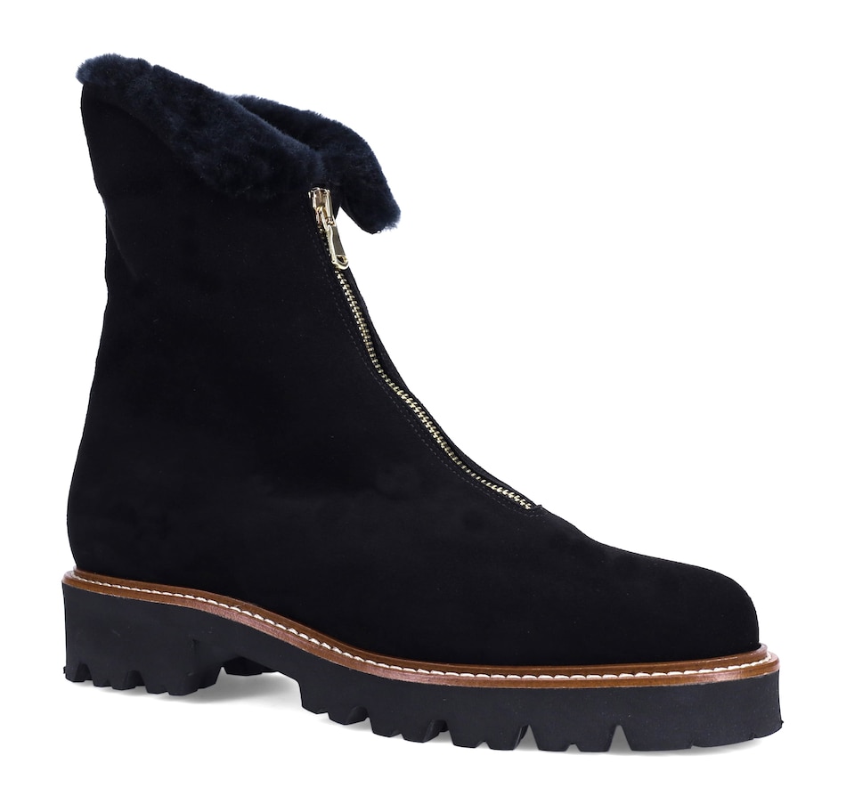 Pamela Ankle Boot in Weatherproof Cashmere Suede with Shearling Collar. Shearling Lined. Front Zipper. Double Padding. Made in Italy.