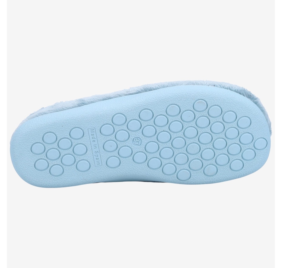 Polar Mule Slipper in Cozy Plush. Adorable Polar Bear with Scarf Detail. Plush Sock Lined Removable Footbed with Arch Support. Anti-Slip Rubber Sole. Made in Spain.