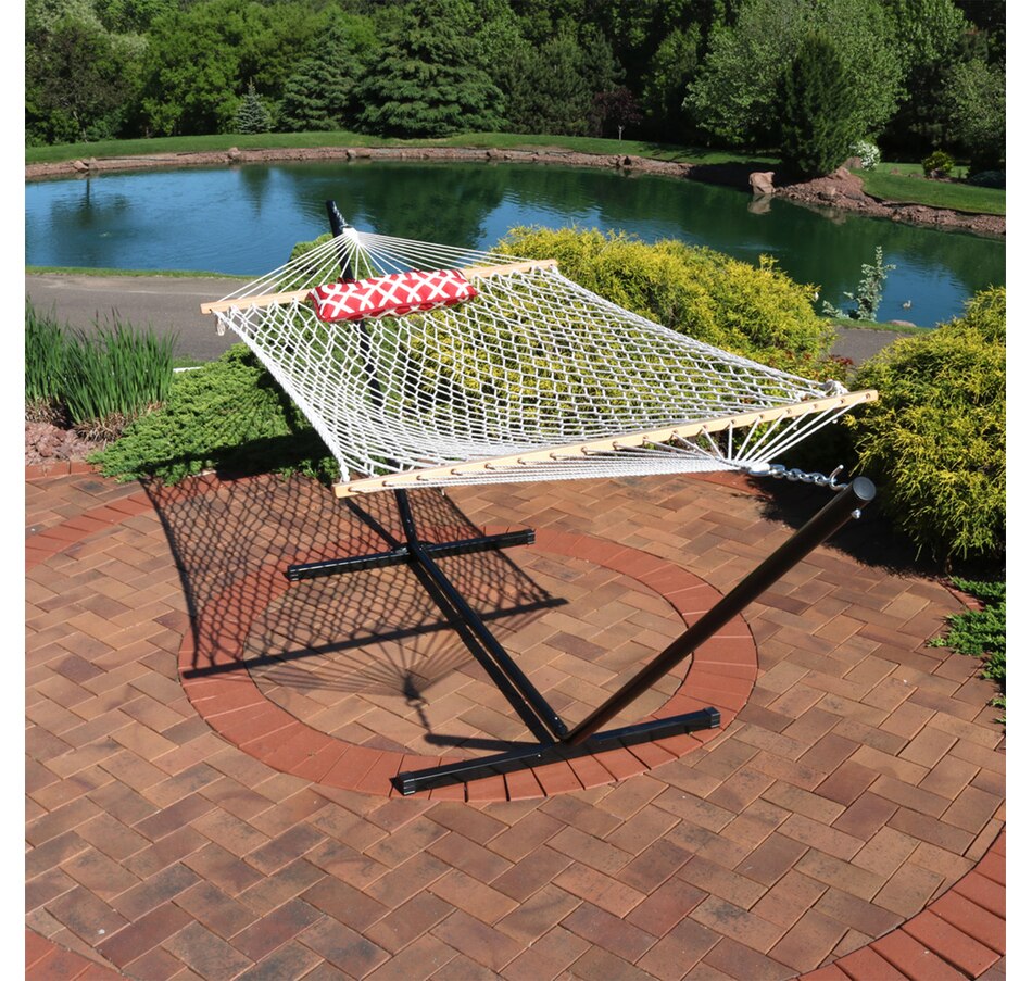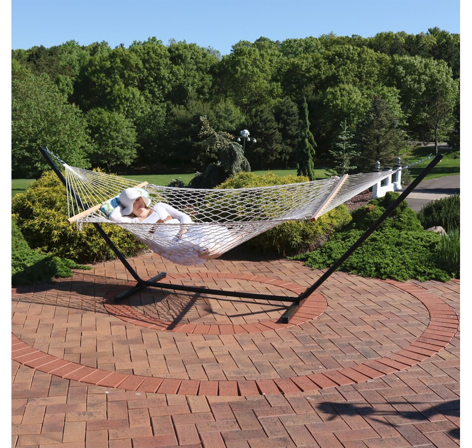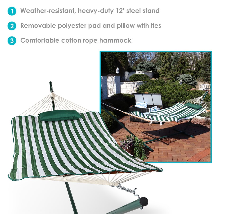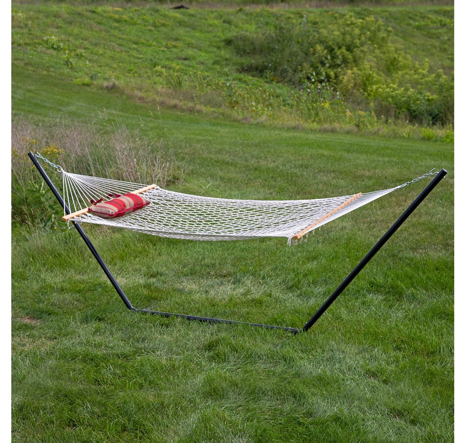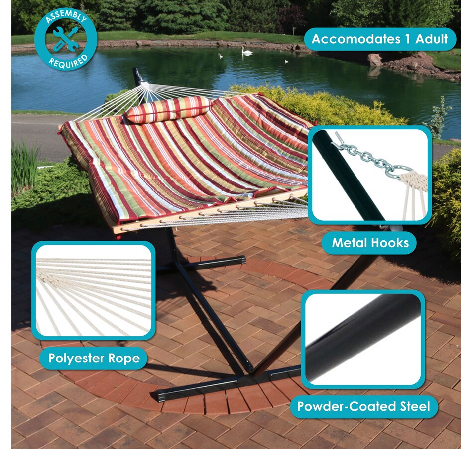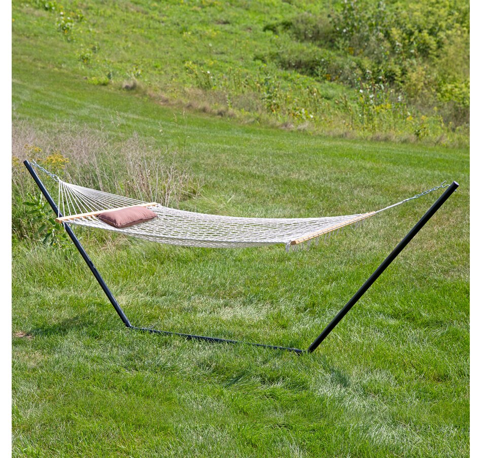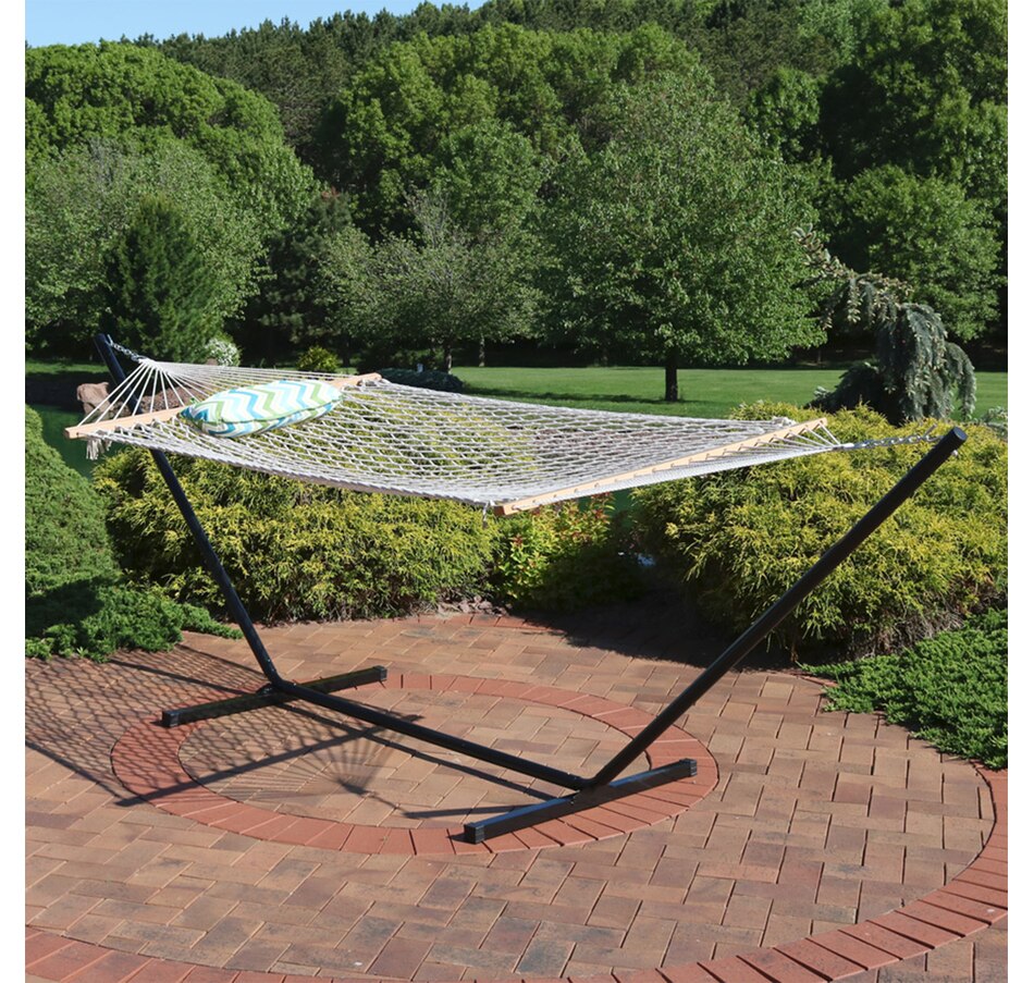 Relax outdoors with this complete hammock and stand set, designed for convenience and comfort. The set includes a classic rope hammock, a cushioned pad, a matching pillow, a 12-foot heavy-duty steel stand, and all necessary hardware for assembly. No trees are required—place the freestanding hammock anywhere from a backyard to a patio, deck, or shaded garden spot. The included stand makes setup and takedown quick and hassle-free, allowing for easy relocation or seasonal storage. The steel frame provides strong, stable support, while the hammock pad and pillow add extra comfort for lounging, reading, or napping. Whether placed in the sun or beneath a canopy, this hammock set offers a peaceful spot to unwind during warm days or starlit evenings. Designed for portability and ease of use, this set combines function and style for a relaxing outdoor retreat in any space.