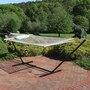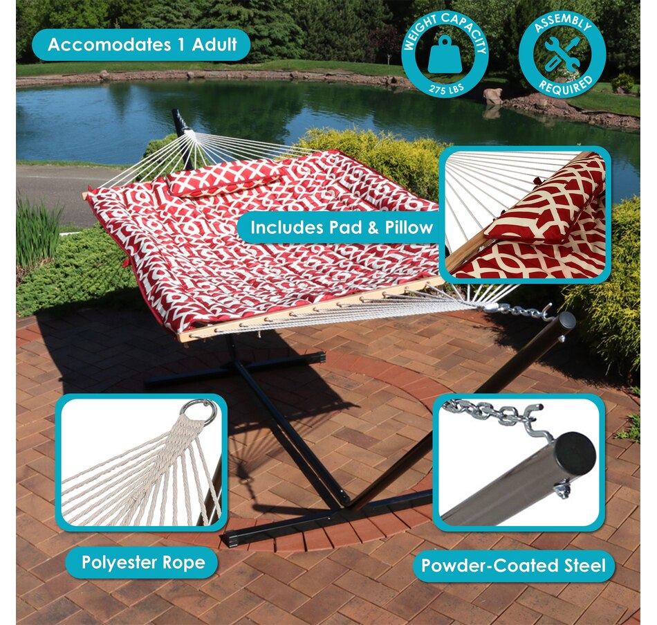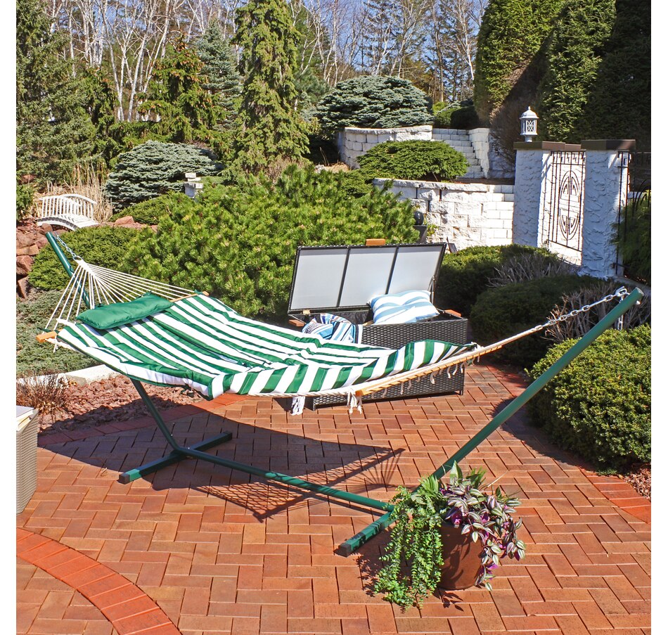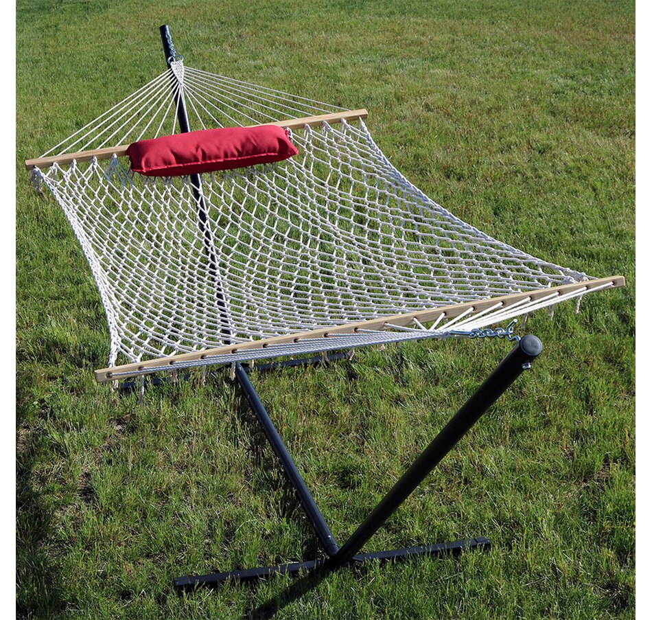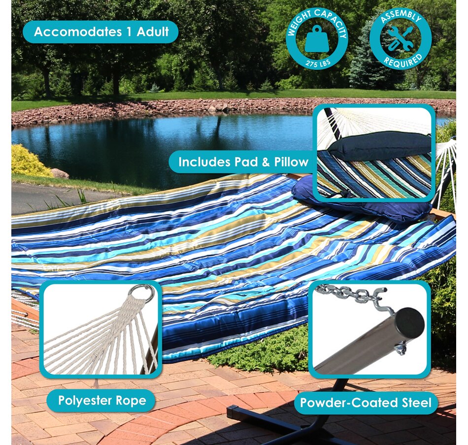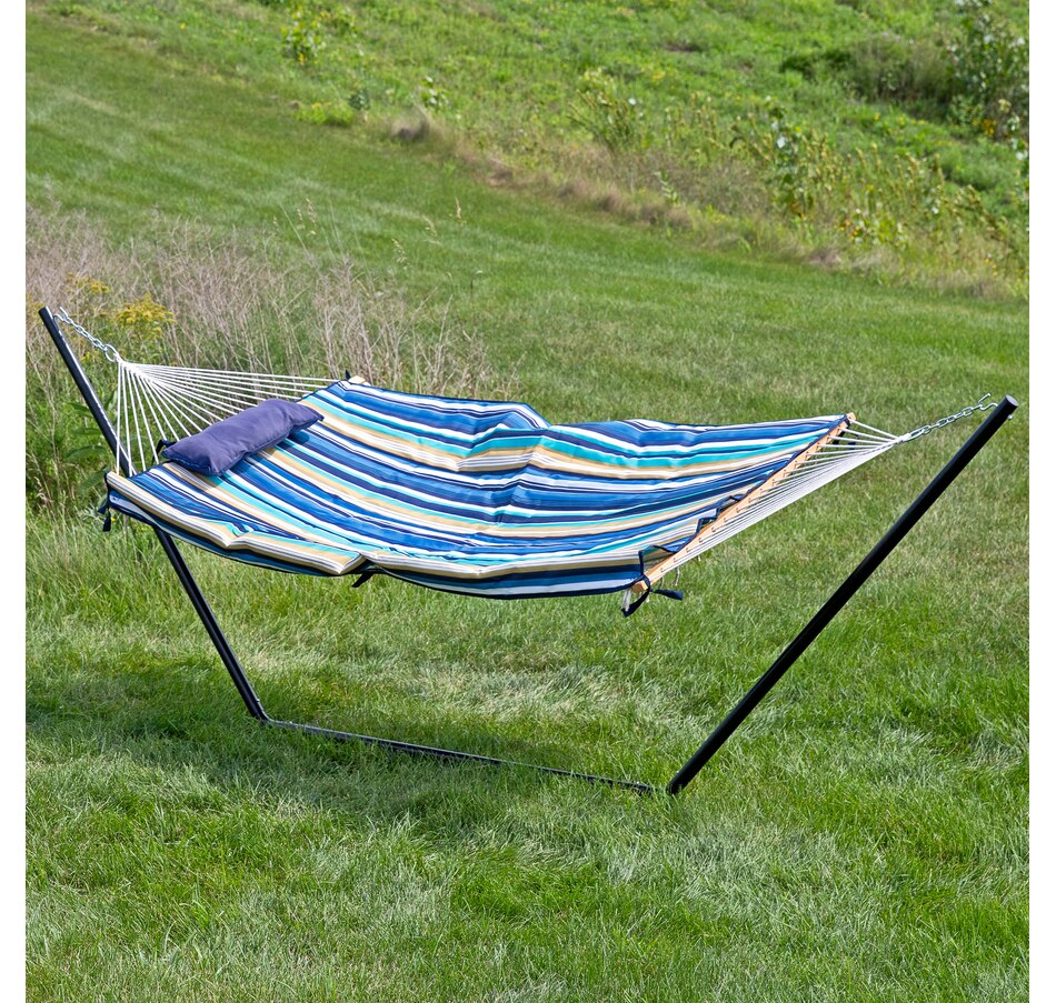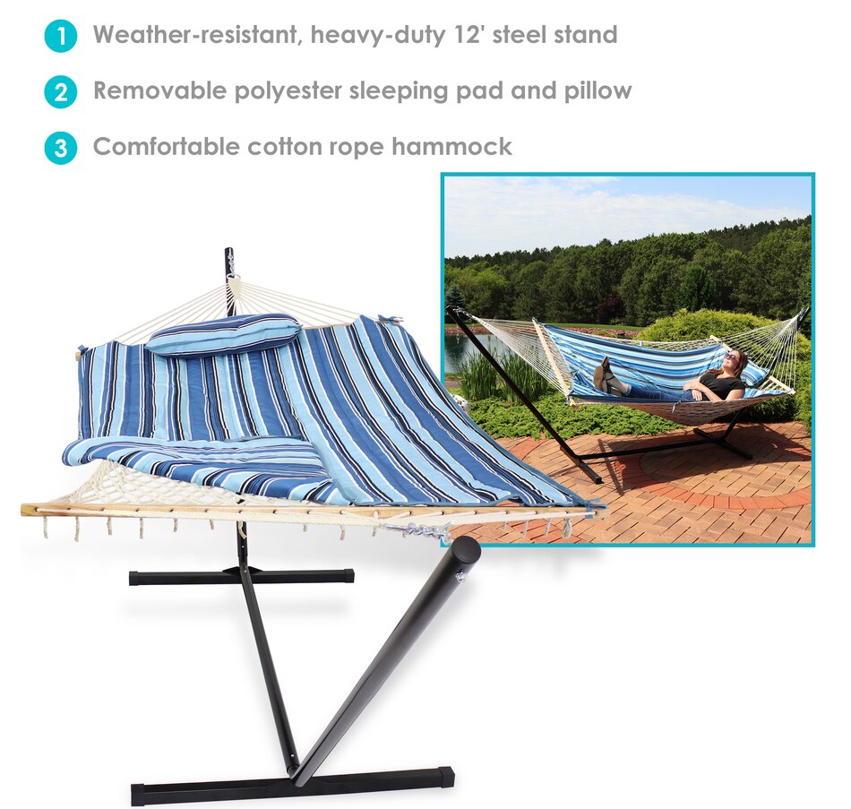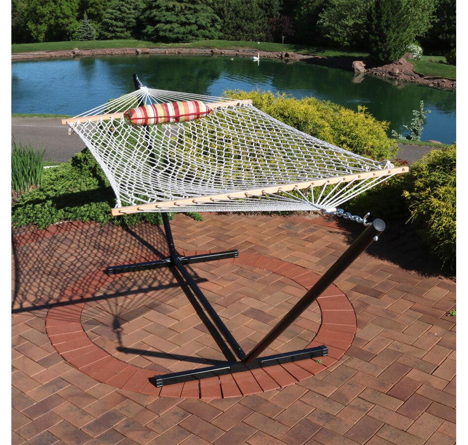 Relax outdoors with this complete hammock and stand set, designed for convenience and comfort. The set includes a classic rope hammock, a cushioned pad, a matching pillow, a 12-foot heavy-duty steel stand, and all necessary hardware for assembly. No trees are required—place the freestanding hammock anywhere from a backyard to a patio, deck, or shaded garden spot. The included stand makes setup and takedown quick and hassle-free, allowing for easy relocation or seasonal storage. The steel frame provides strong, stable support, while the hammock pad and pillow add extra comfort for lounging, reading, or napping. Whether placed in the sun or beneath a canopy, this hammock set offers a peaceful spot to unwind during warm days or starlit evenings. Designed for portability and ease of use, this set combines function and style for a relaxing outdoor retreat in any space.