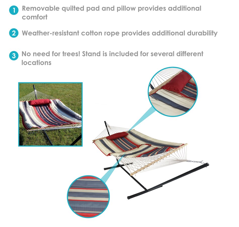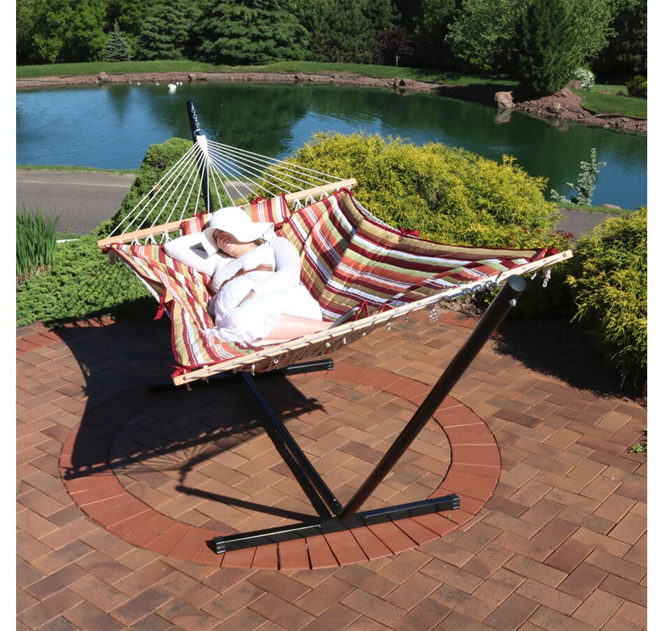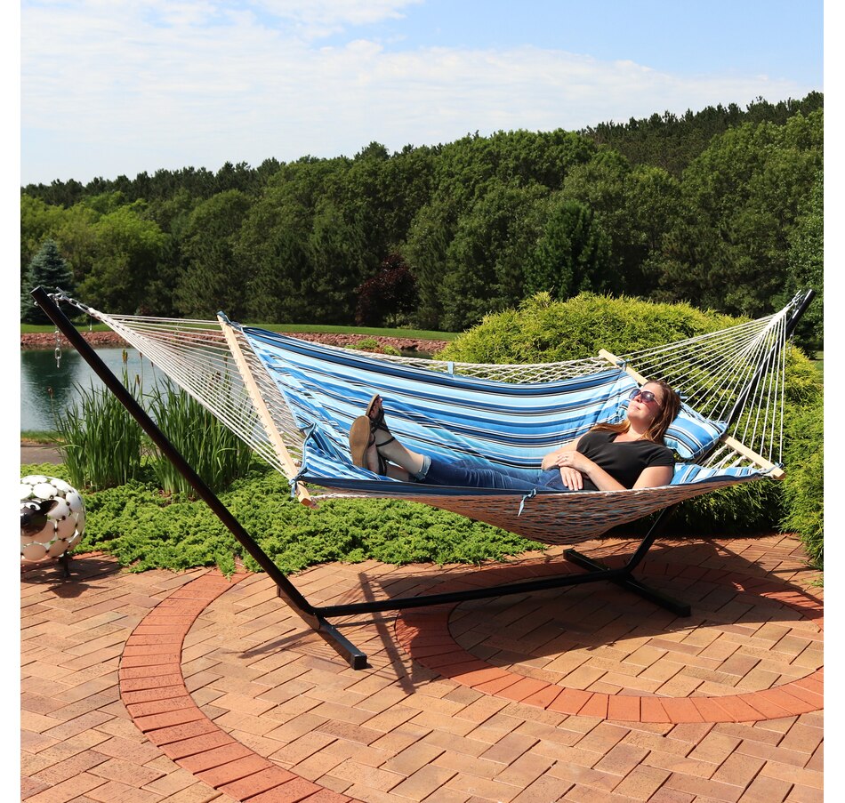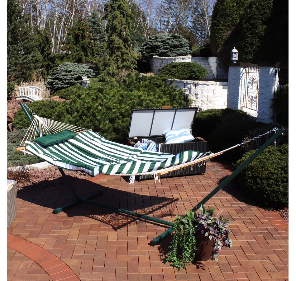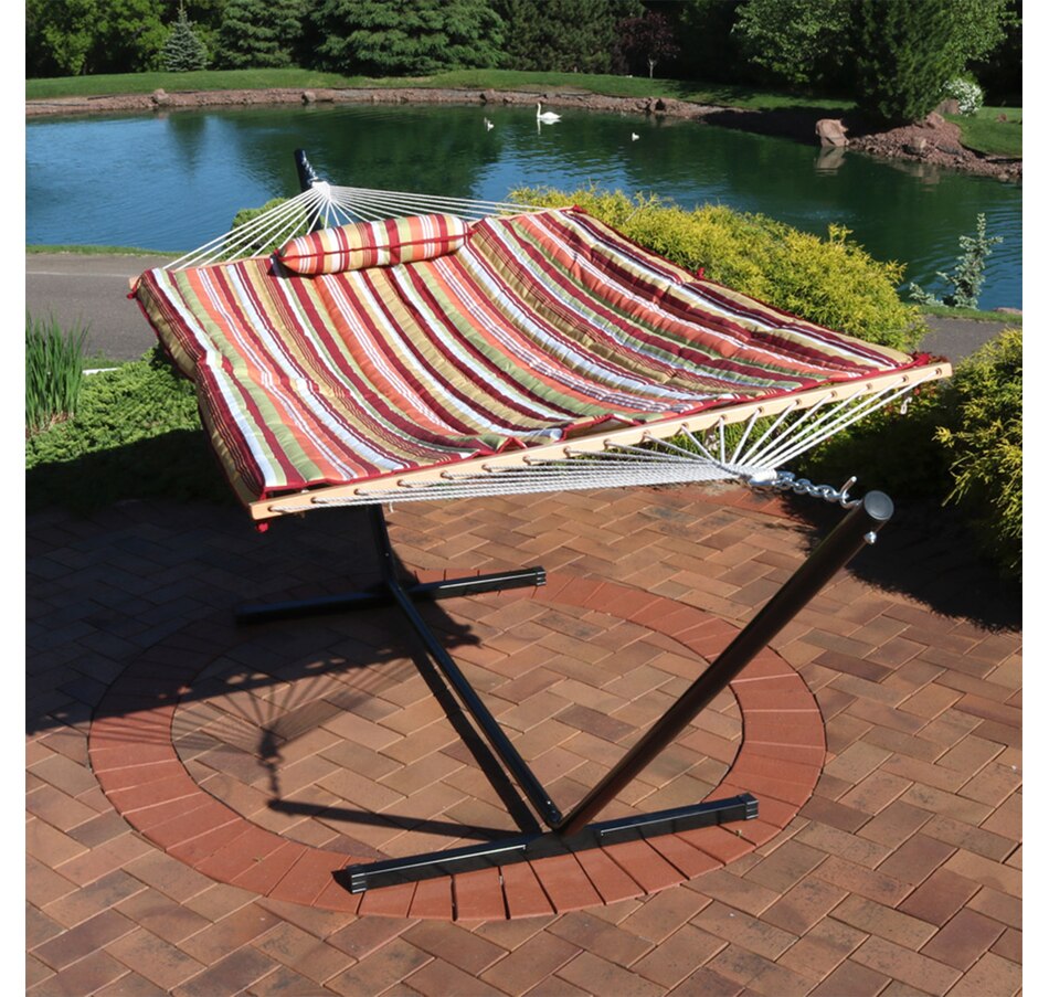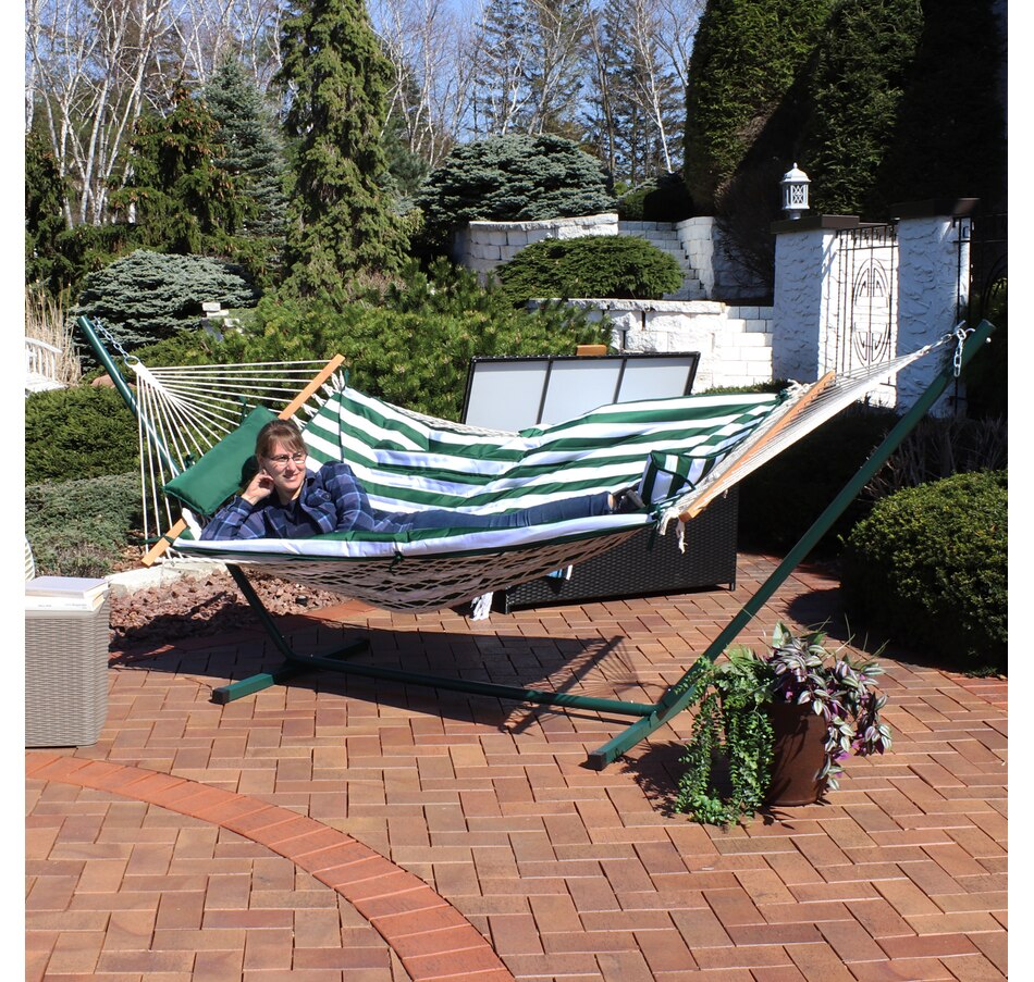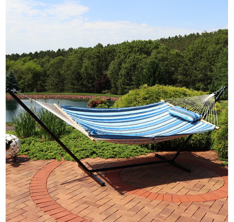 Relax outdoors with this complete hammock and stand set, designed for convenience and comfort. The set includes a classic rope hammock, a cushioned pad, a matching pillow, a 12-foot heavy-duty steel stand, and all necessary hardware for assembly. No trees are required—place the freestanding hammock anywhere from a backyard to a patio, deck, or shaded garden spot. The included stand makes setup and takedown quick and hassle-free, allowing for easy relocation or seasonal storage. The steel frame provides strong, stable support, while the hammock pad and pillow add extra comfort for lounging, reading, or napping. Whether placed in the sun or beneath a canopy, this hammock set offers a peaceful spot to unwind during warm days or starlit evenings. Designed for portability and ease of use, this set combines function and style for a relaxing outdoor retreat in any space.