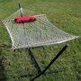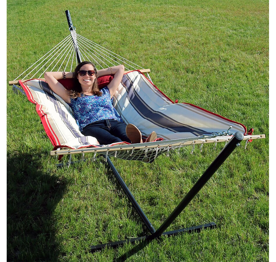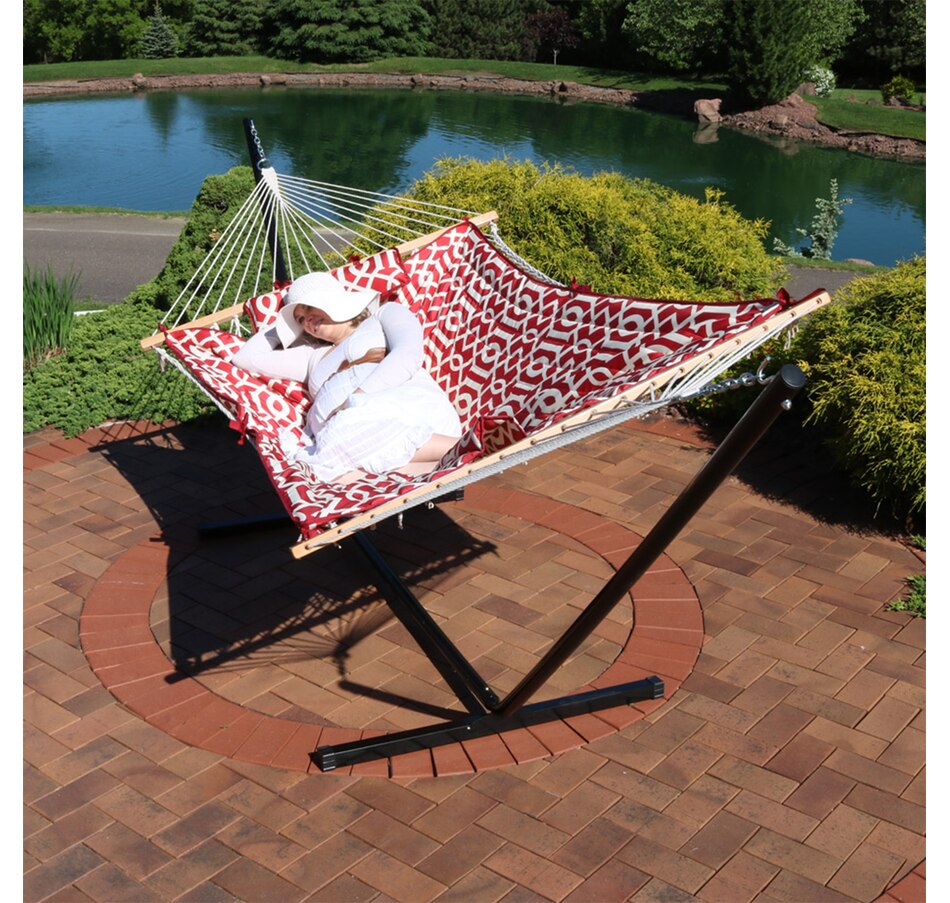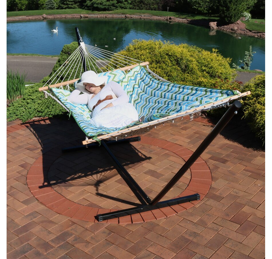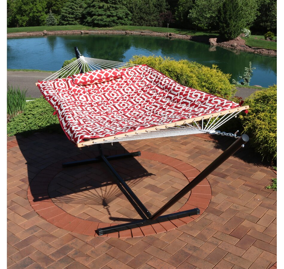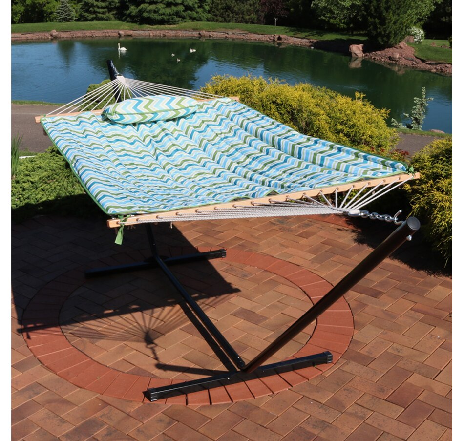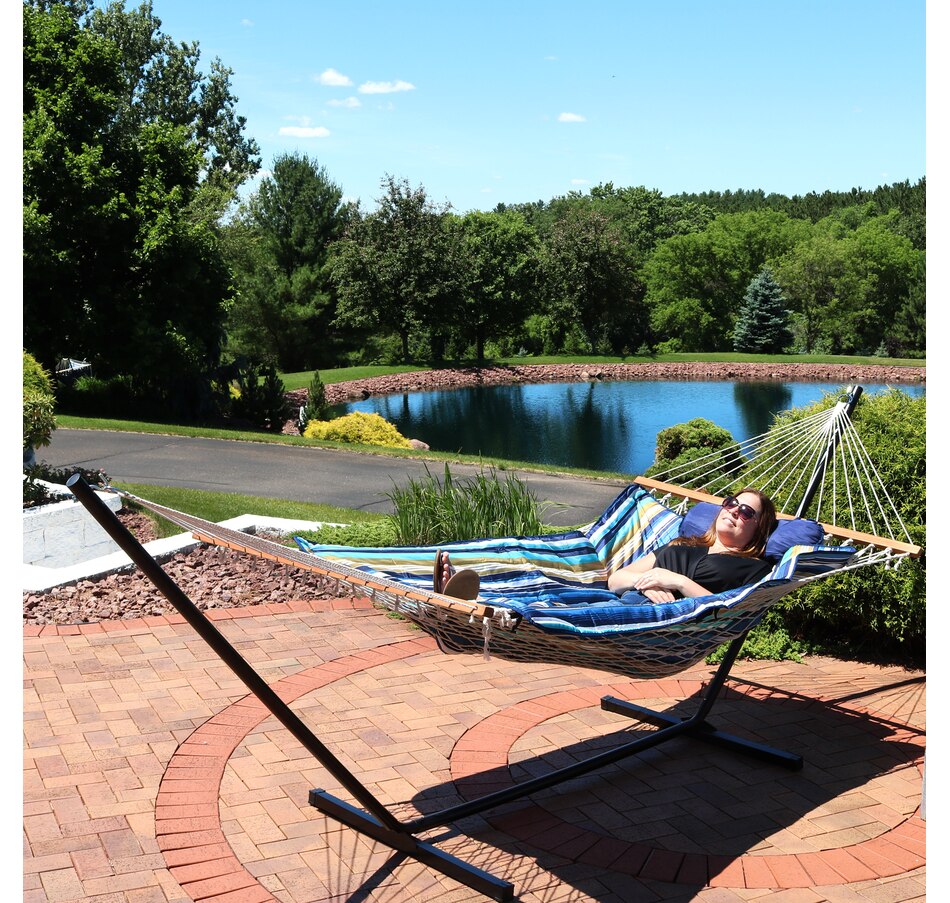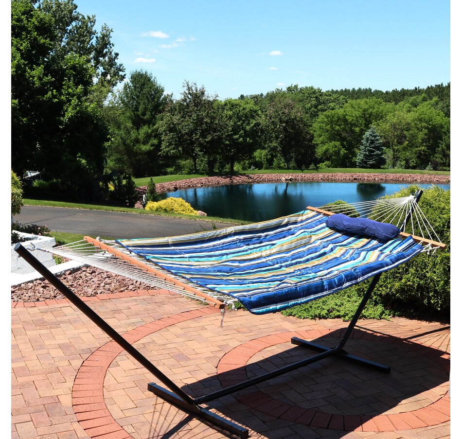 Relax outdoors with this complete hammock and stand set, designed for convenience and comfort. The set includes a classic rope hammock, a cushioned pad, a matching pillow, a 12-foot heavy-duty steel stand, and all necessary hardware for assembly. No trees are required—place the freestanding hammock anywhere from a backyard to a patio, deck, or shaded garden spot. The included stand makes setup and takedown quick and hassle-free, allowing for easy relocation or seasonal storage. The steel frame provides strong, stable support, while the hammock pad and pillow add extra comfort for lounging, reading, or napping. Whether placed in the sun or beneath a canopy, this hammock set offers a peaceful spot to unwind during warm days or starlit evenings. Designed for portability and ease of use, this set combines function and style for a relaxing outdoor retreat in any space.