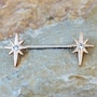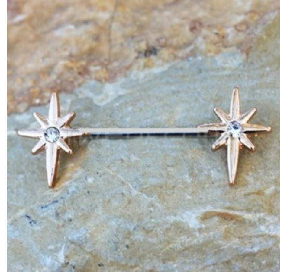 Nipple Bar / Nipple Jewelry with Star Design‚316L Stainless Steel Shaft with Rose Gold Plated Stars‚Unique design of Northern Star‚Clear Cubic Zirconia on each stars‚Bar Thickness : 14GA | 1.6mm‚Bar Length : 3/4" | 19mm‚Wearable Length : 9/16" | 14mm‚Star Size : 10 x 13 & 1/2mm‚Material : 316L Stainless Steel, Gold Plated Zinc Alloy, Cubic Zirconia*Choose Single or Pair