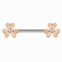 Nipple Bar / Nipple Jewelry with Clover Leaf Design‚316L Stainless Steel Shaft with Rose Gold Plated Clover Leaf‚Simple yet elegant style of Clover Leaf‚Clear Cubic Zirconia on each Leaf‚Bar Thickness : 14GA | 1.6mm‚Bar Length : 3/4" | 19mm‚Wearable Length : 9/16" | 14mm‚Clover Leaf Size : 8 x 8mm‚Material : 316L Stainless Steel, Gold Plated Zinc Alloy, Cubic Zirconia