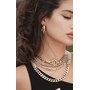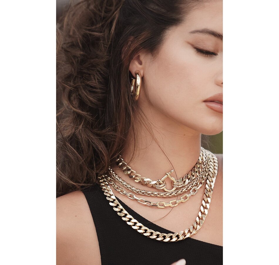 The Roxy necklace is made from thick squared-off brass curb chain, fastened with a with horseshoe clasp.Material: Recycled BrassCurb chain measures: 10.57mm (.416") wide x 4.77mm (.18") t hickClasp Measures: 25mm (.98") long x 20mm (.79") wideChain has a clear protective coating to prevent from quick wear and tarnishing.Available in the following Lengths: 14.5", 16", 18", 20"Our jewelry is always handcrafted from sustainable materials in the USA. Model is wearing our 14.5" Roxy Necklace** EDITORS NOTE: Please measure your neck circumference before choosing a necklace length. The width and thickness of the chain makes the chain fit shorter on your neck.