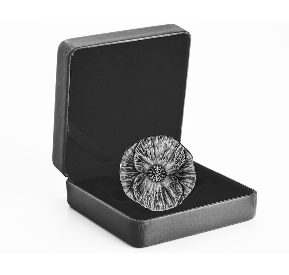 The poppy has been sculpted to capture all the intricate elements of the symbolic flower, from the outward-curving petals to the innermost whorl, while the antique finish accentuates every crinkle, curl and fold.