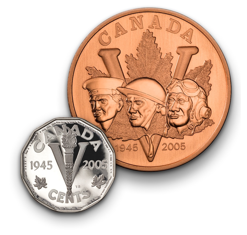 This set marks the 60th anniversary of VE Day—Victory in Europe near the end of WWII in 1945. The coins were produced for collectors in sterling silver in near-flawless double-struck frosted cameo proof condition, together with a bronze medallion depicting land, air and sea imagery on the reverse and the late King George VI on the obverse. A 36-page bilingual booklet detailing Canada's significant role leading up to the end of the war in Europe, with photographs depicting the Canadian effort, is also included in the presentation.