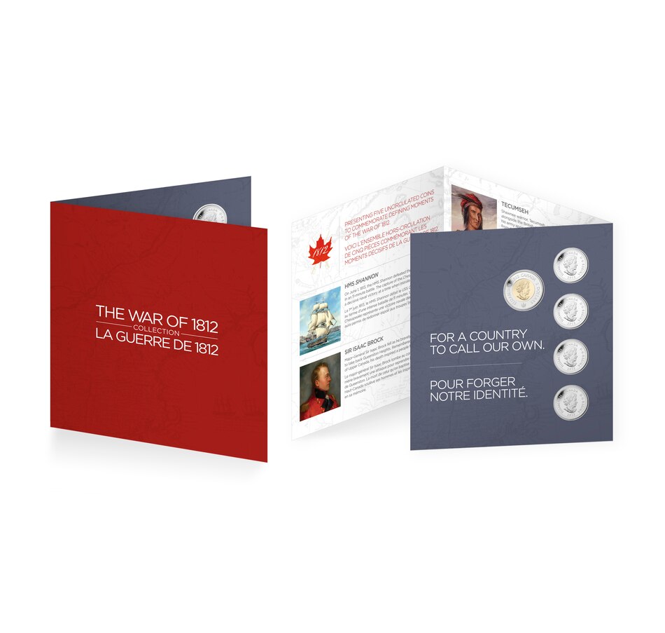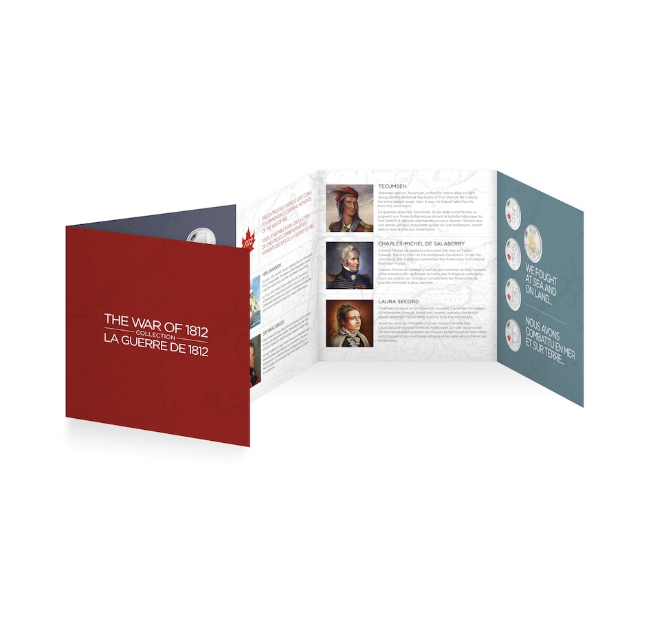 The War of 1812 was a fundamental turning point in Canada's development as a nation, and from the struggle emerged exceptional accounts of some of Canada's proudest moments. Celebrate the stories of heroes that arose from the war of 1812 with this set of five special-issue War of 1812 commemorative coins. The full-colour three-panel card provides an overview of the coins' subject and their stories that inspired a nation.