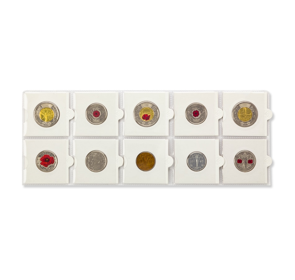 This collection includes 10 different coins featuring poppies, 1943 tombac war-issue nickel, 1945 chrome-plated steel war-issue nickel and commemorative coins. Denominations include the two-dollar, quarters, and the five-cent.