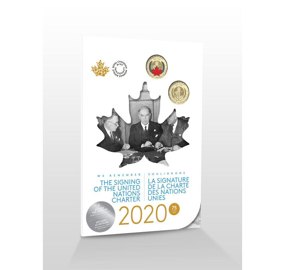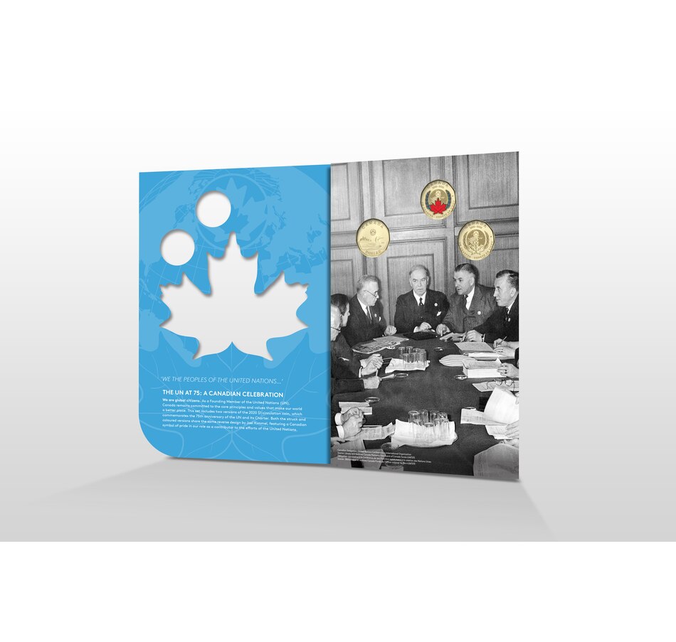 Marking the 75th anniversary of the United Nations, this seven-piece set includes both a coloured and classic version of Canada's new one-dollar commemorative coin together with numismatic uncirculated examples of each denomination issued for circulation. The commemorative dollars feature a world map within an olive branch wreath paired with a maple leaf to symbolize Canada's commitment to human rights and global peace.
