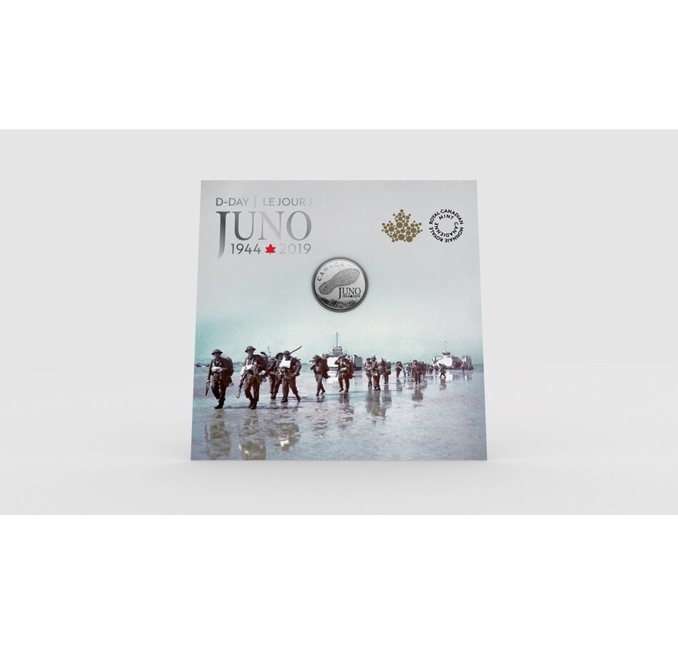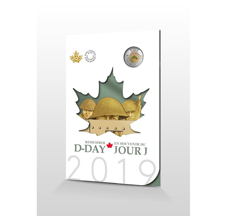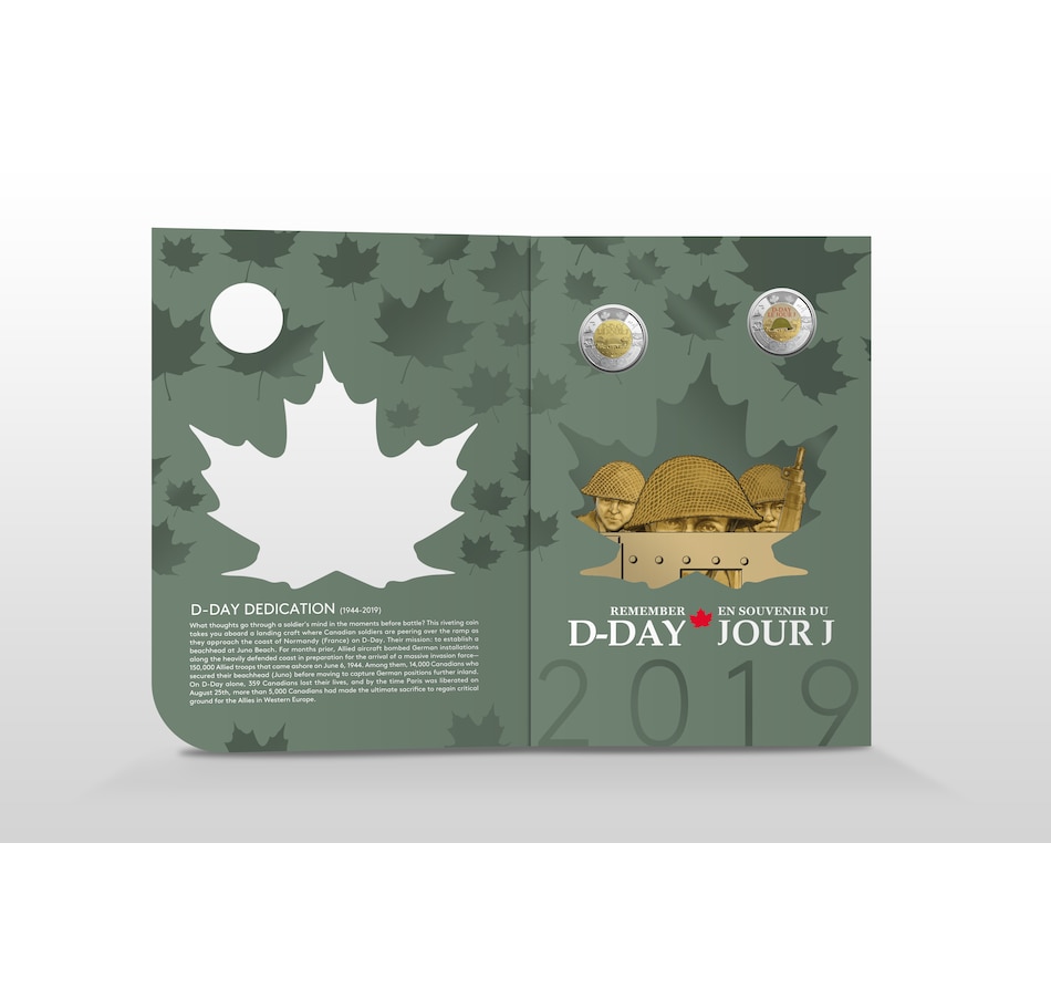 This presentation includes a numismatic uncirculated example of all the denominations—five-cent, 10-cent, 25-cent and dollar, plus two different examples of the 2019 D-Day commemorative two-dollar coin. One of the two-dollar coins will be a classic strike while the second will be selectively coloured. The commemorative two-dollar coin design takes you aboard a landing craft where Canadian soldiers are peering over the ramp as they approach the coast of Normandy (France) on D-Day, with a mission to establish a beachhead at Juno Beach.