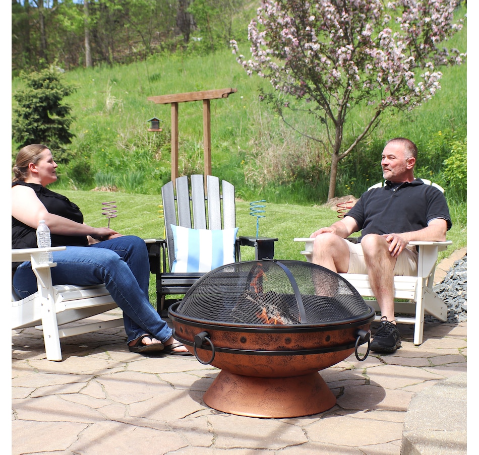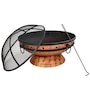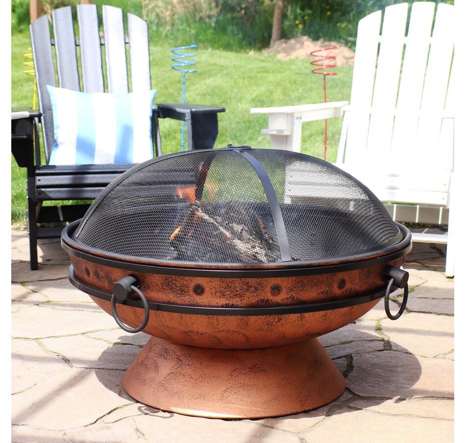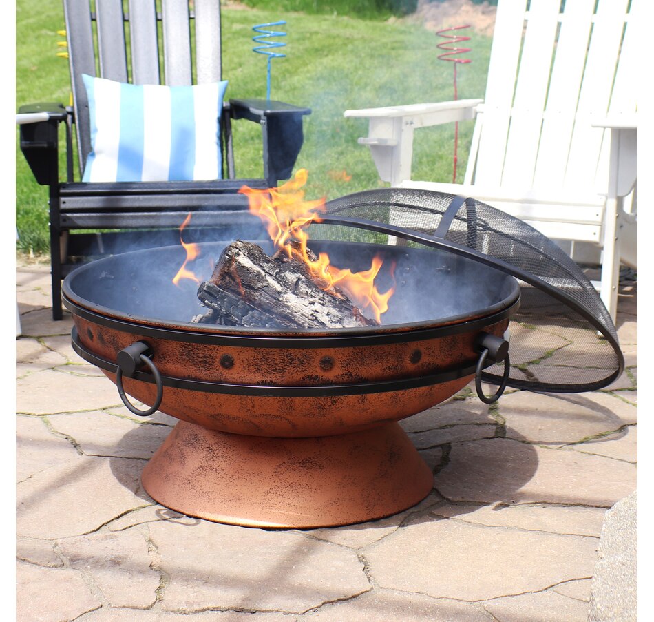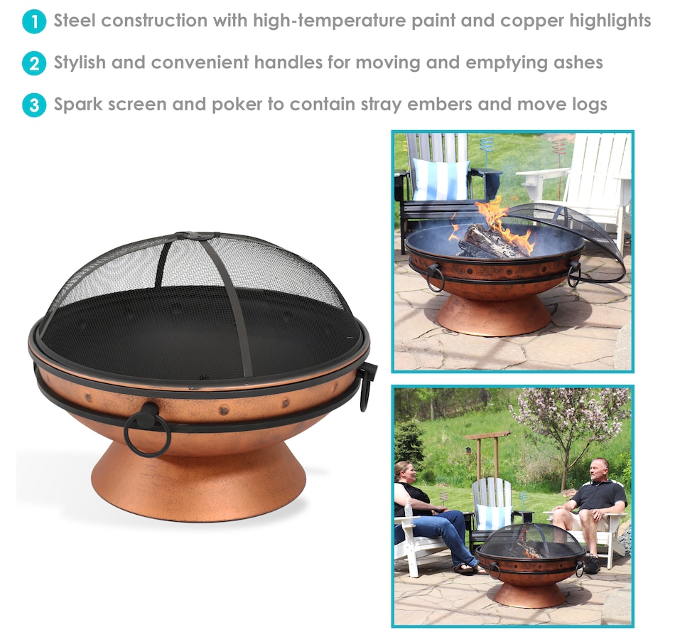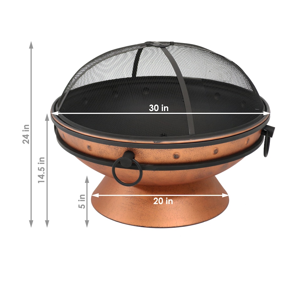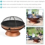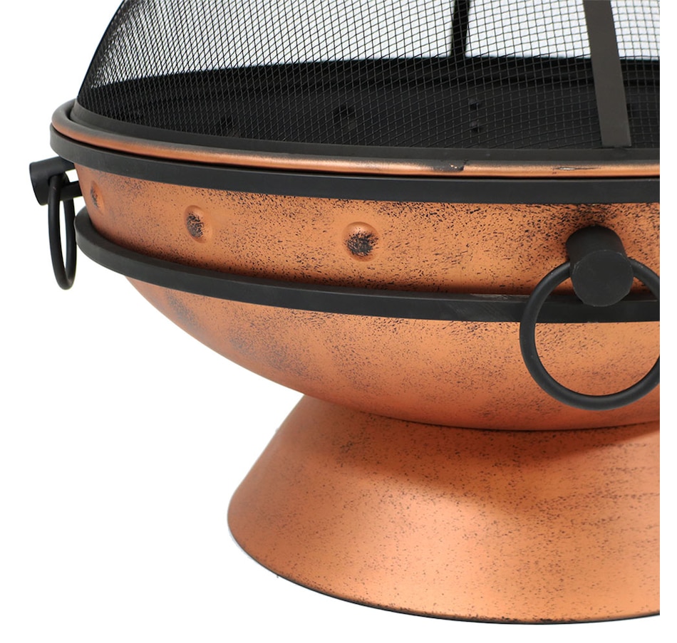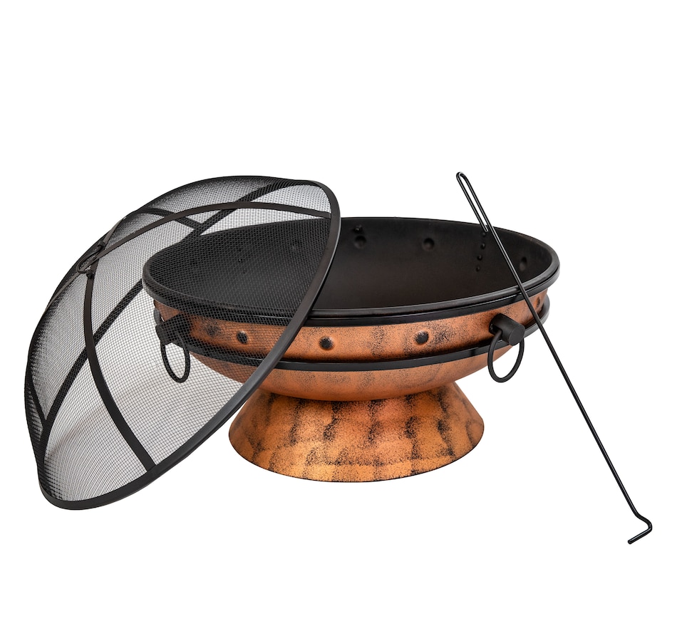 This outdoor firepit is a great addition to the backyard, patio, cabin, campground, or vacation home to brighten up any outdoor space and make cozy memories year after year. This large firepit for outside is finished with a copper, high-temperature paint for heat resistance and long-lasting use, even against the outdoor elements. The raised fire pit features a stylish cauldron-shaped design complete with handles and a pedestal base for added contemporary style. The handles on the firepit bowl make it easy to lift and dump out ashes as well as move from place to place. The included wood grate provides optimal air circulation when wood is stacked on it. The poker is great for maneuvering firewood and lifting or moving the spark screen when it gets too hot to the touch. Invite friends and family over, grab some snacks and firewood, and watch your night ignite with fun around this outdoor wood fireplace.